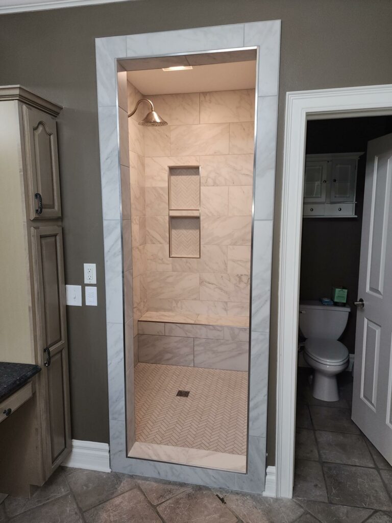 Welcome back to another A+ Home Improvements’ project! Our next renovation revolves around a huge tiled shower with a rain shower head. The existing master
