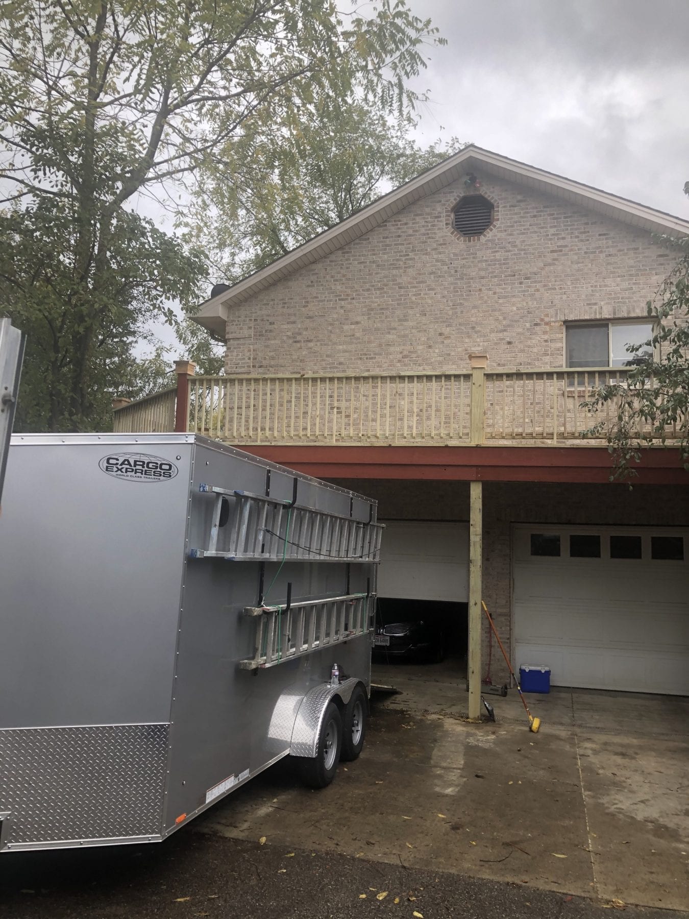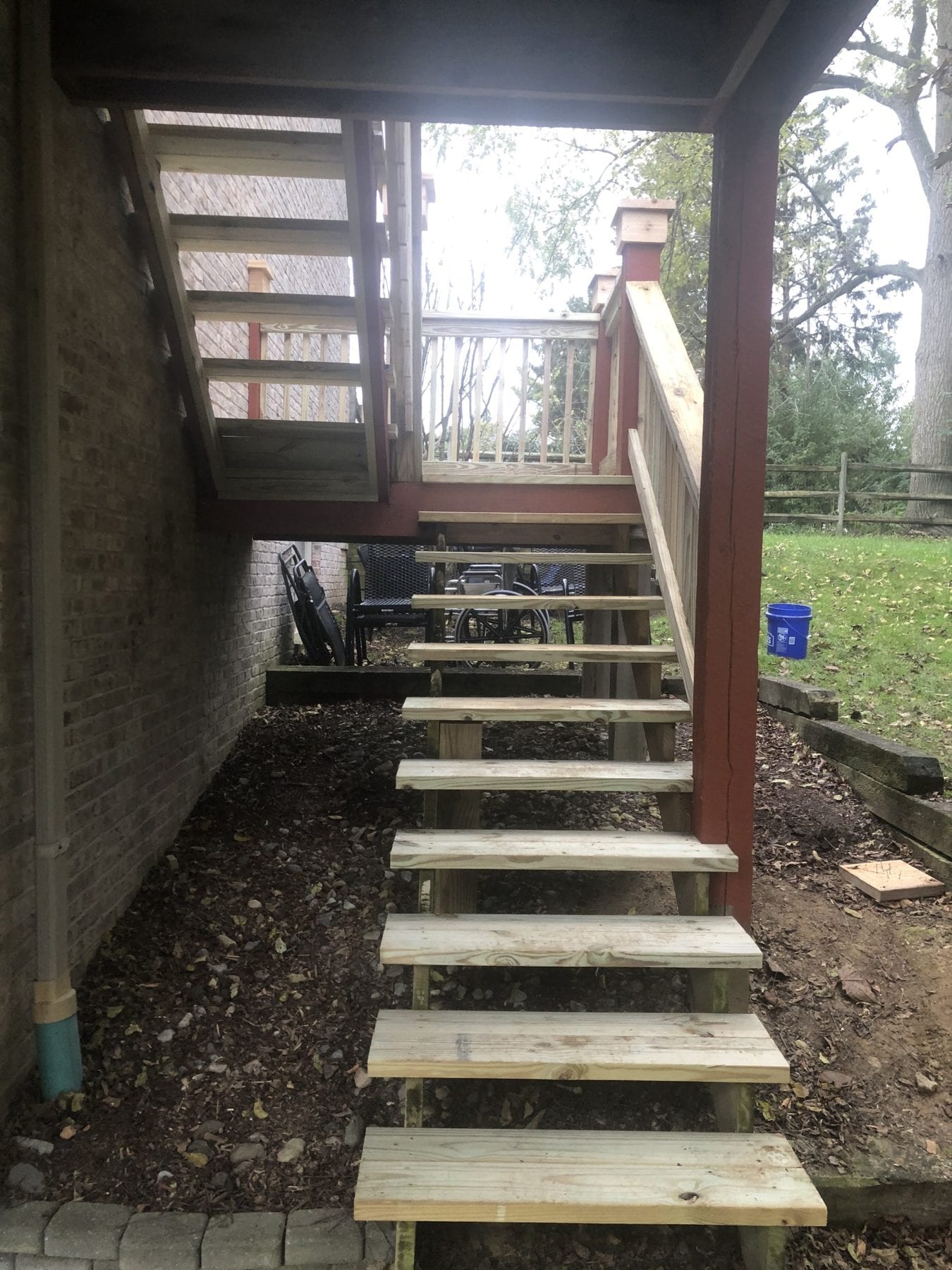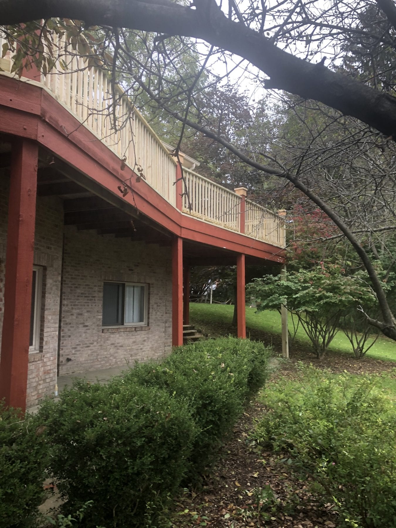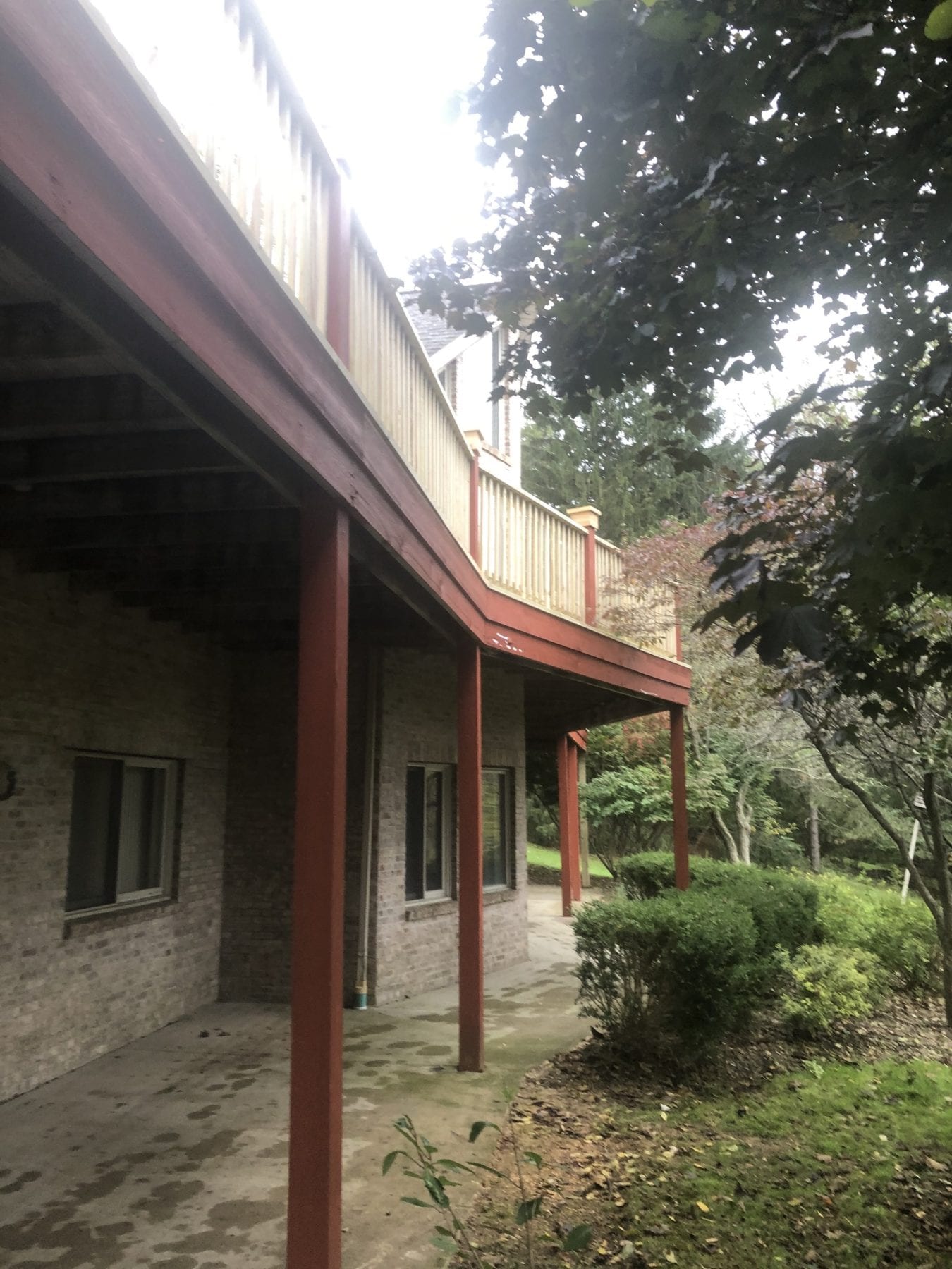 Seeing pictures of this monster kind of puts it in perspective. New footers had to be poured for the new posts, so we supported the deck and went to work. We replaced the entire handrail and the decorative caps at the posts as well. The stringers for the rear steps remained in surprisingly good shape, so we replaced the treads to add some much needed stability. The project turned out fantastically, and our client loved the end result.