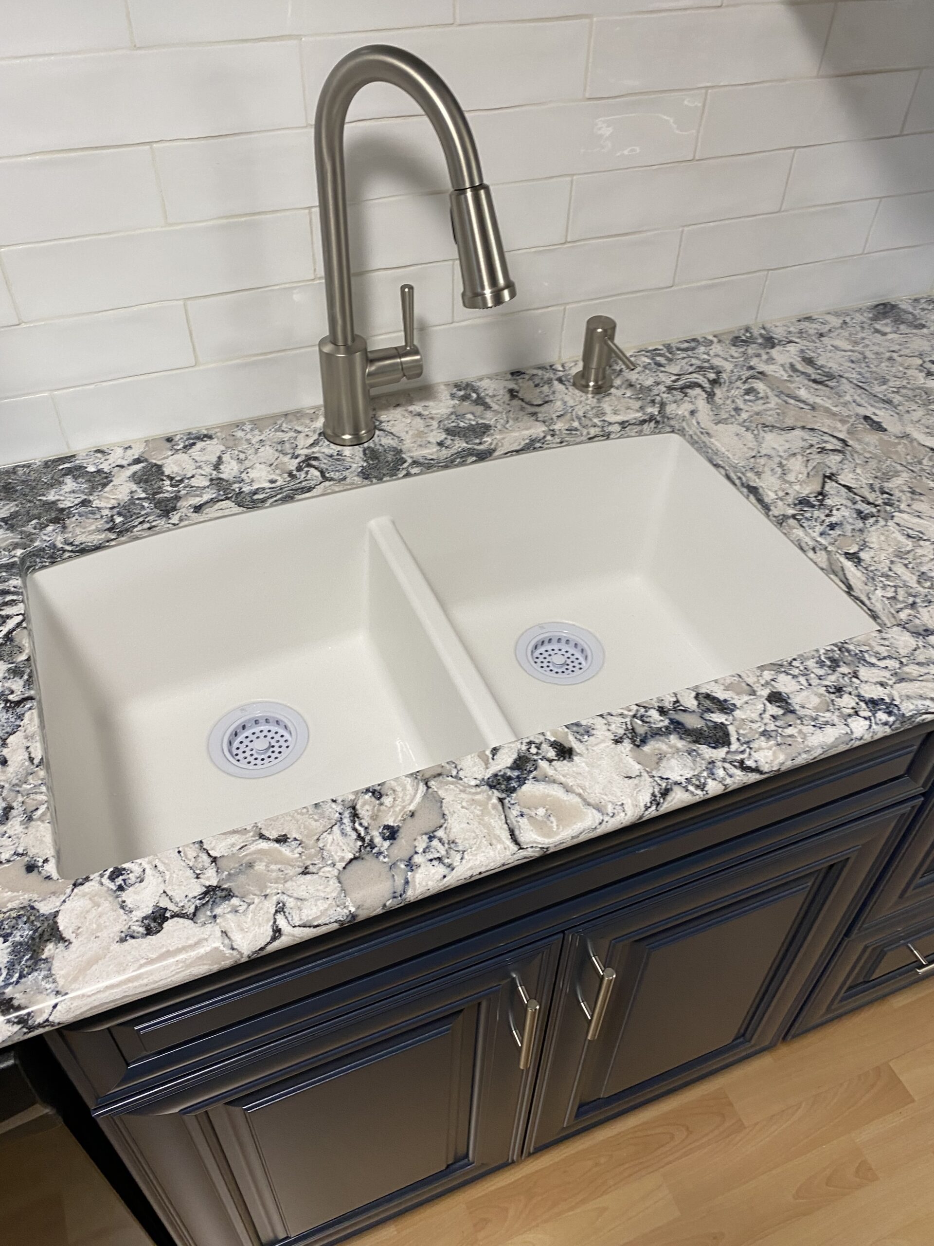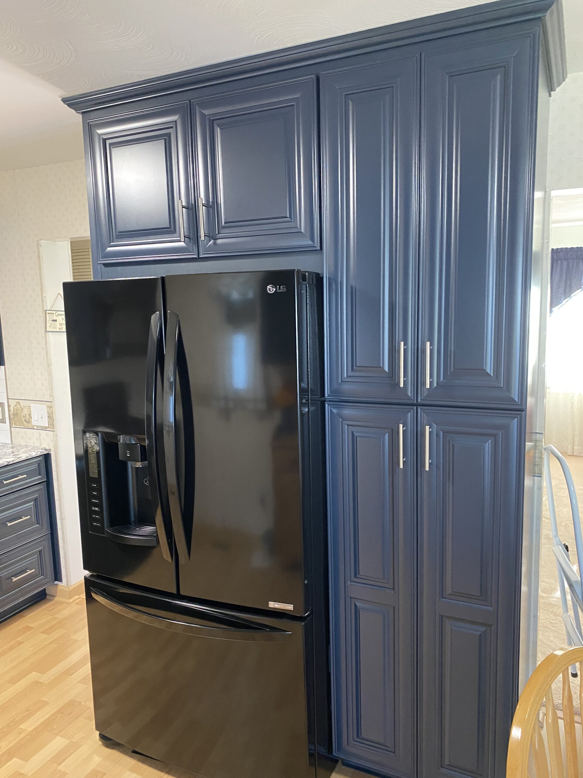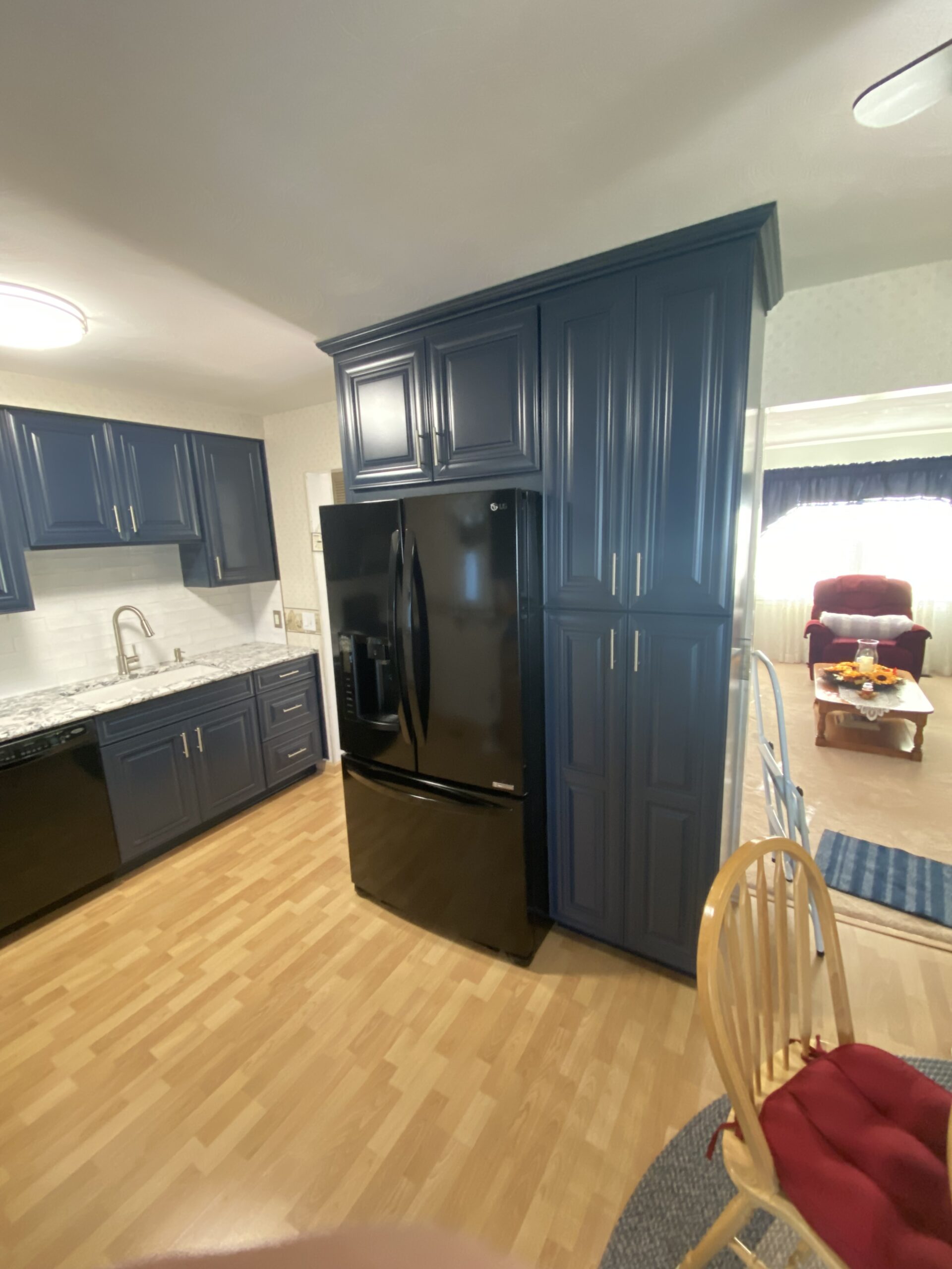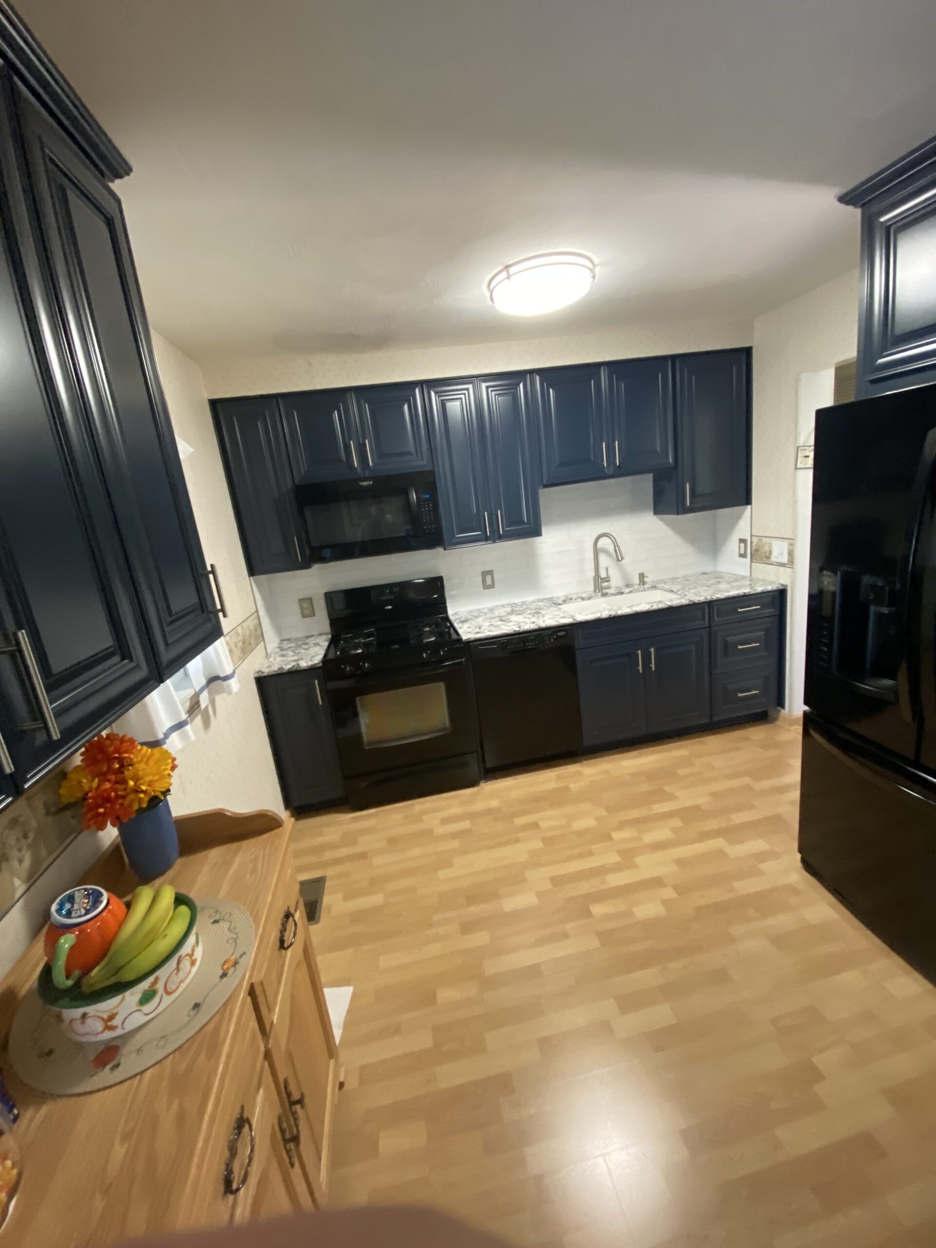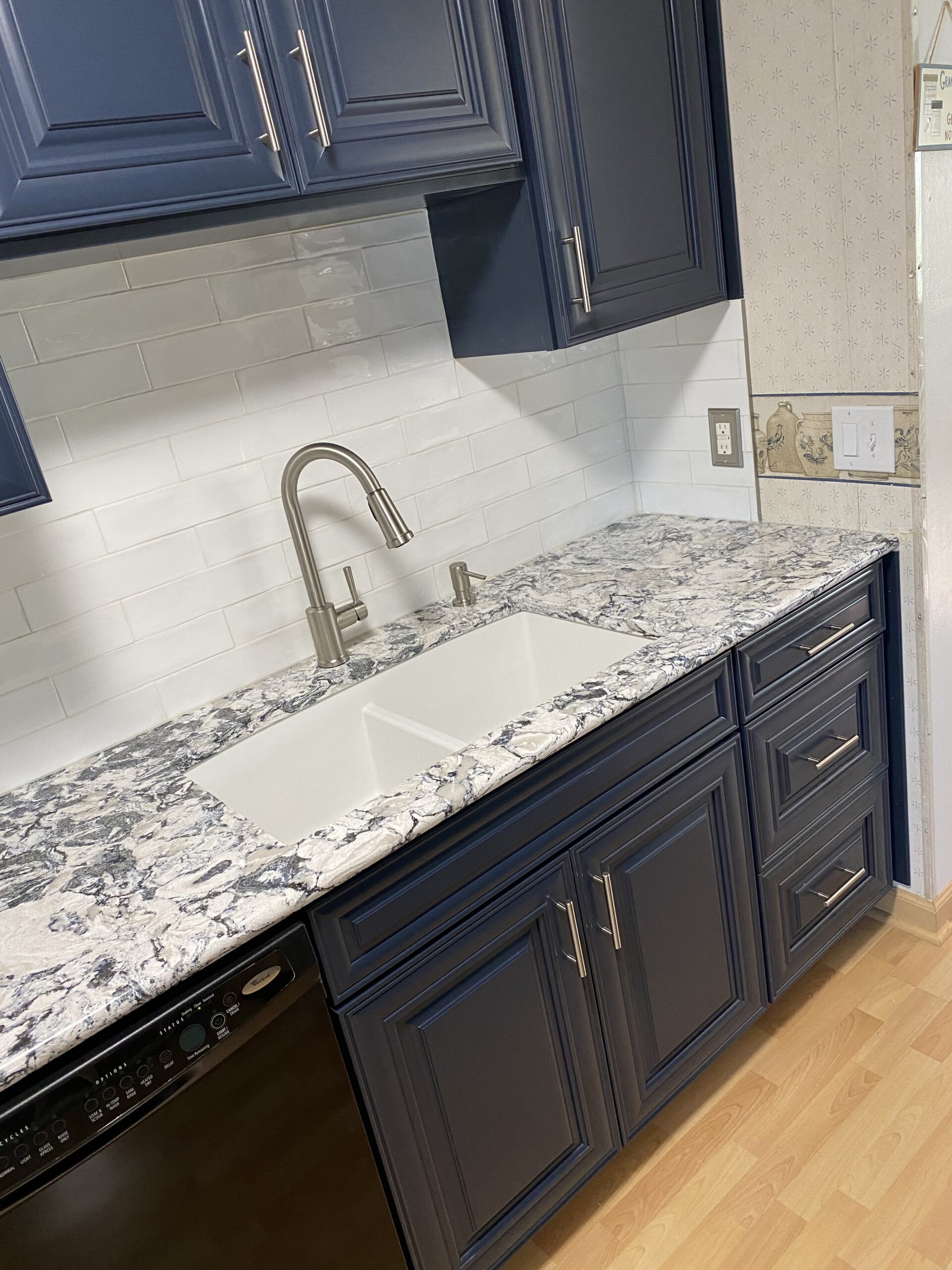 The result was perfect! Our client loved the eye-popping color of their new kitchen. The selected counter top paired perfectly with the cabinet and décor color, and the subway tile back splash provided the finishing touch. They were all set – they had a blue kitchen! Give A+ Home Improvements a call to get your project started today!