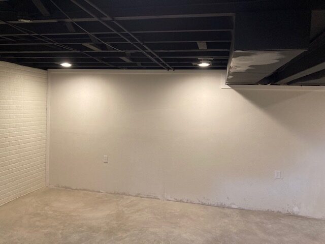 A+ Home Improvements is back tackling another project! Our next project entailed a basement living space for a client that we completed other projects for in the past. We love meeting new clients, but get a sense of satisfaction when homeowners invite us back into their homes for a repeat project. During our first go-around, we renovated their daughter’s bathroom. This time around, our client desired to section off a portion of the basement to create an area to hang out. We wanted to incorporate the support posts into the framing to hide them as much as possible. To keep cost down, the homeowner elected to leave the exterior concrete walls exposed. We simply drywalled the new framing separating the basement living space from the remaining storage area. We changed out the lighting and added LED recessed fixtures throughout the new space. For the ceiling, we sprayed it black to provide a modern, industrial look. Let’s see what we were dealing with: