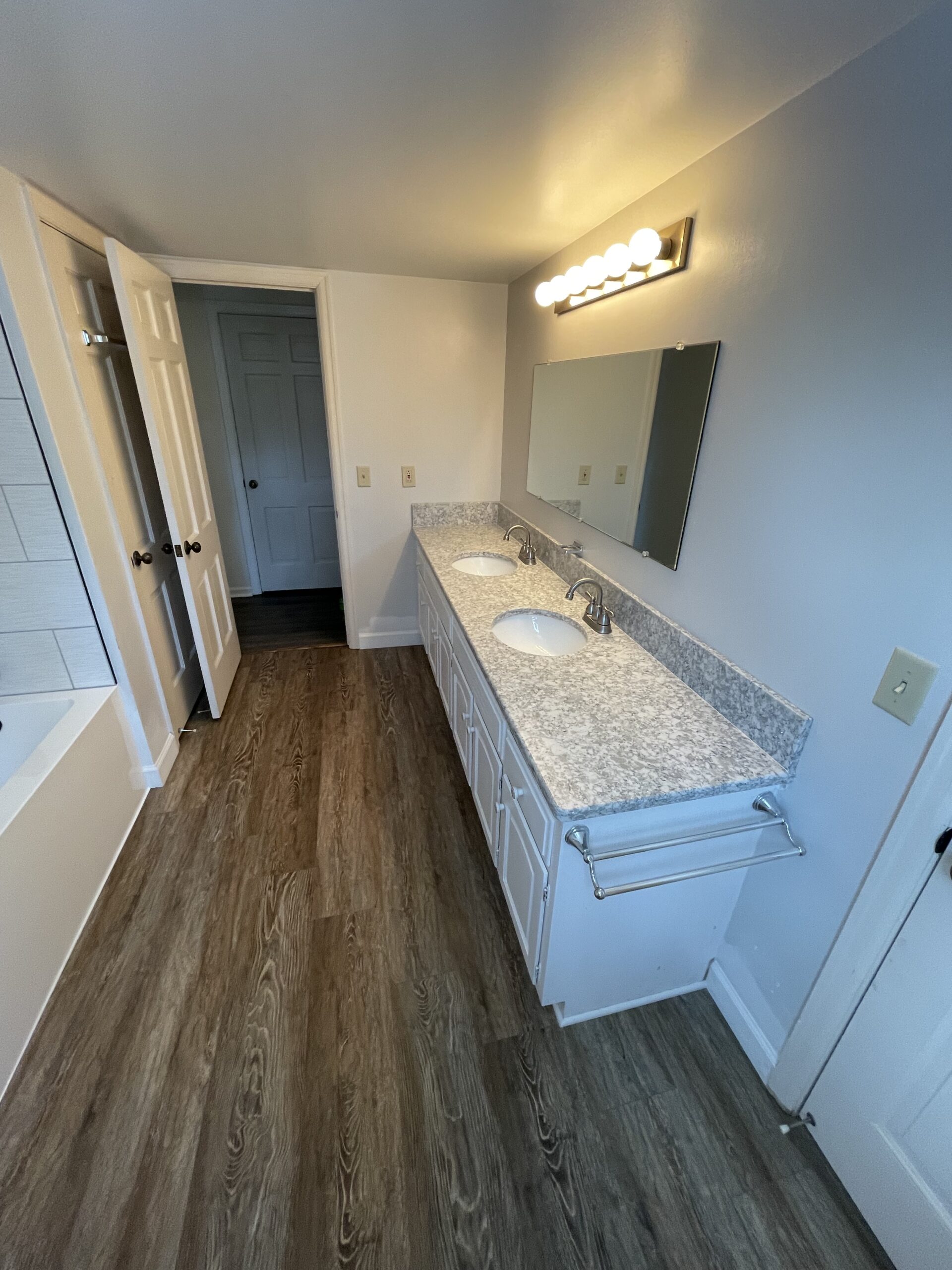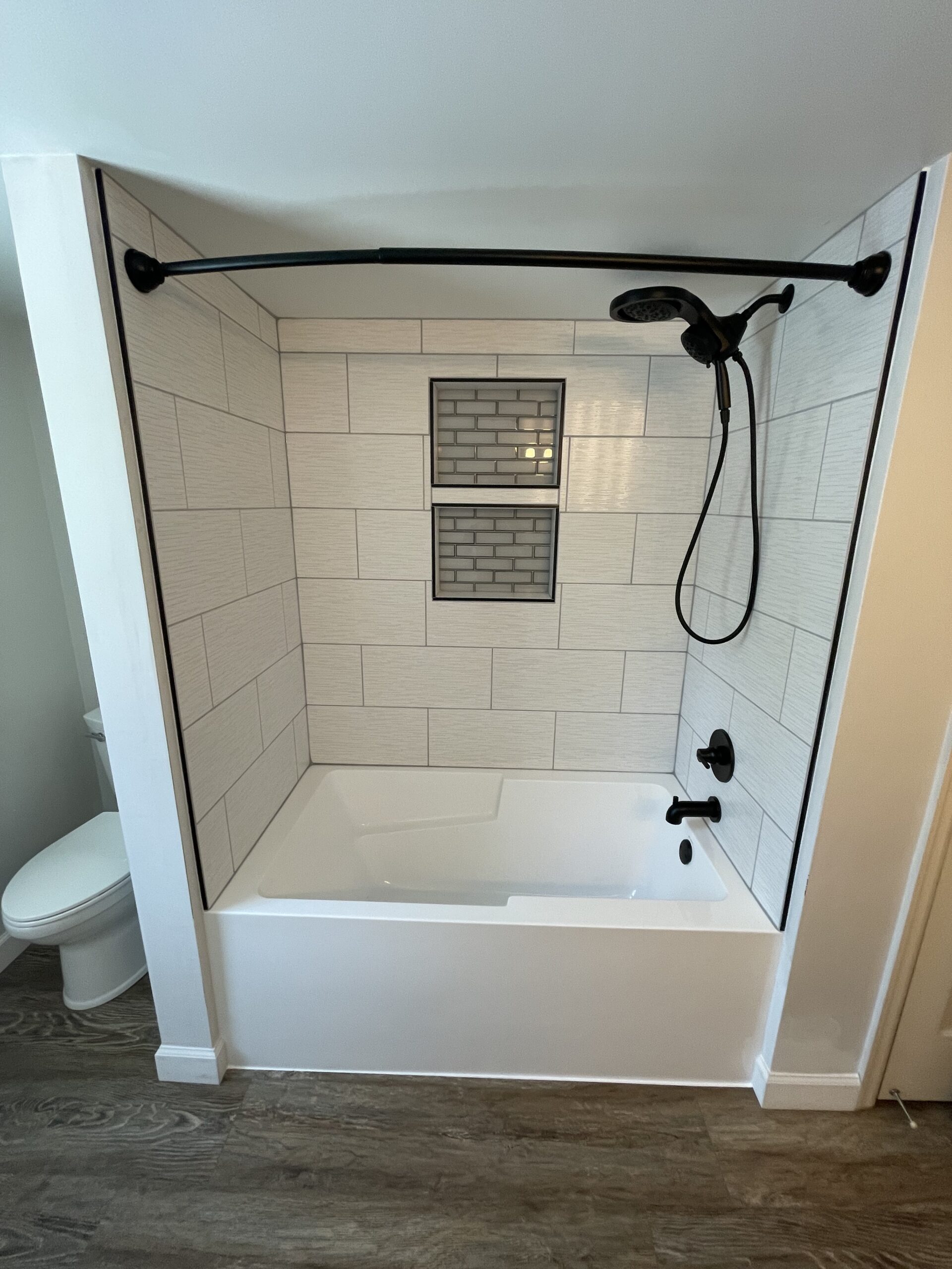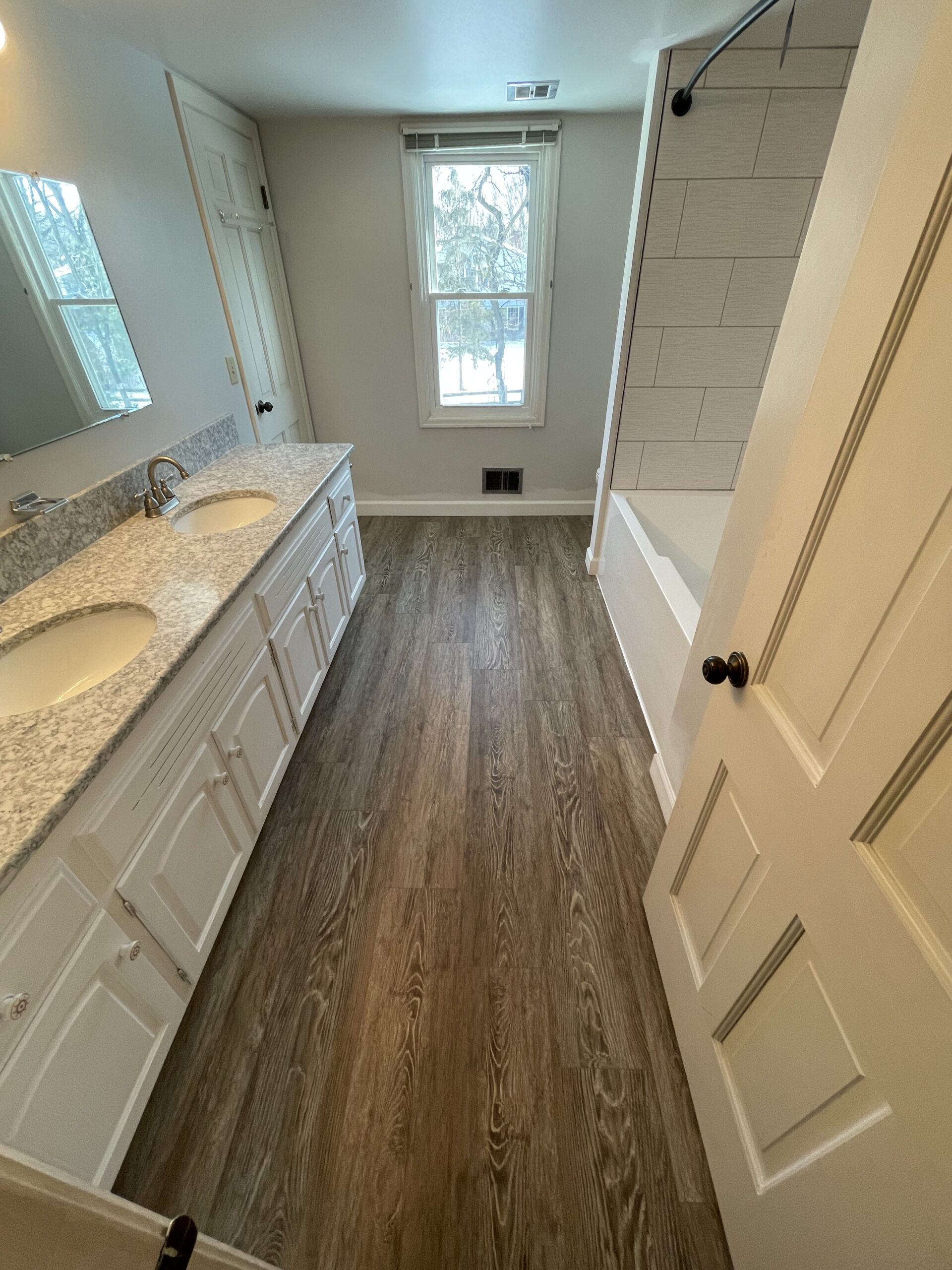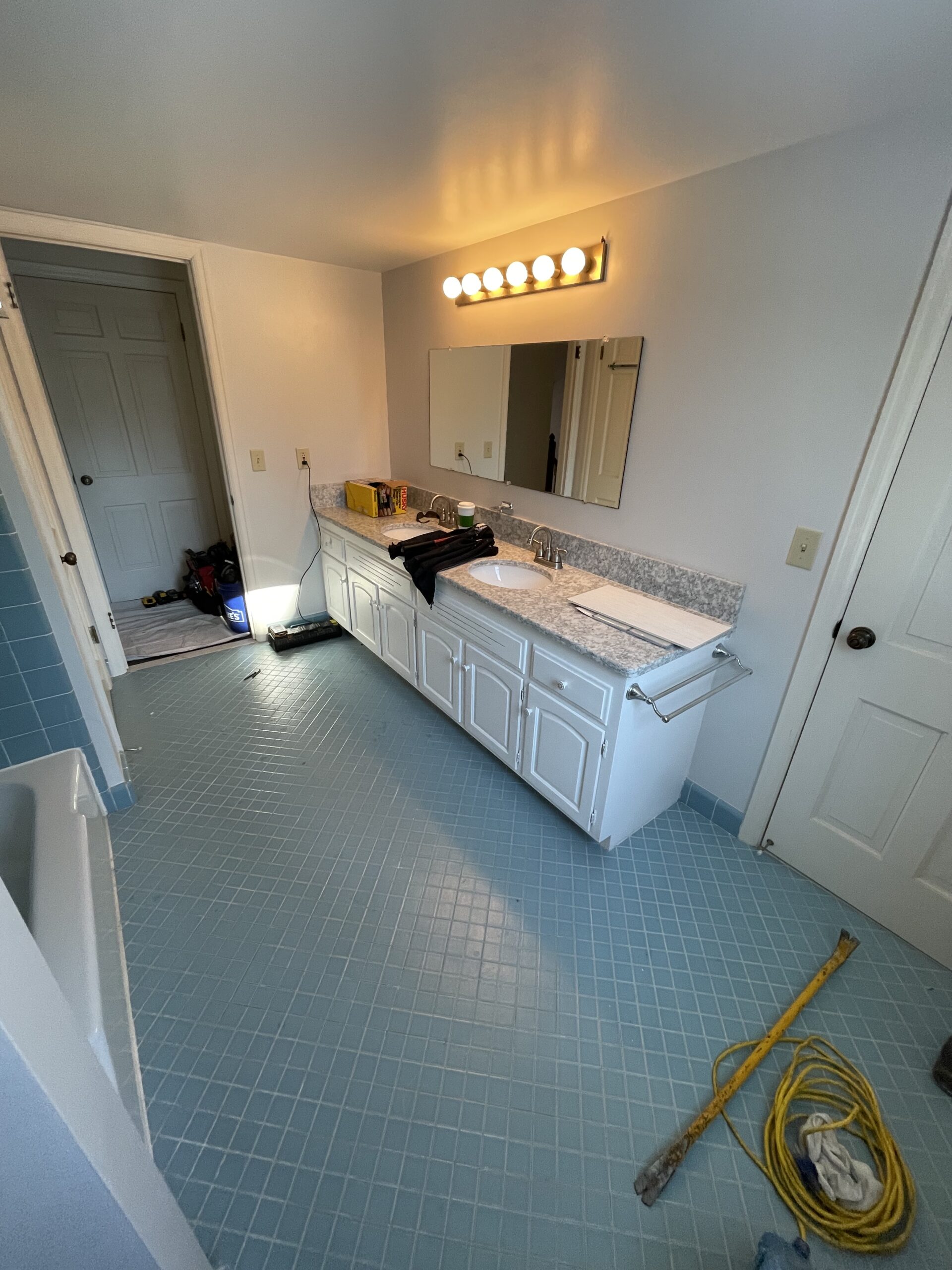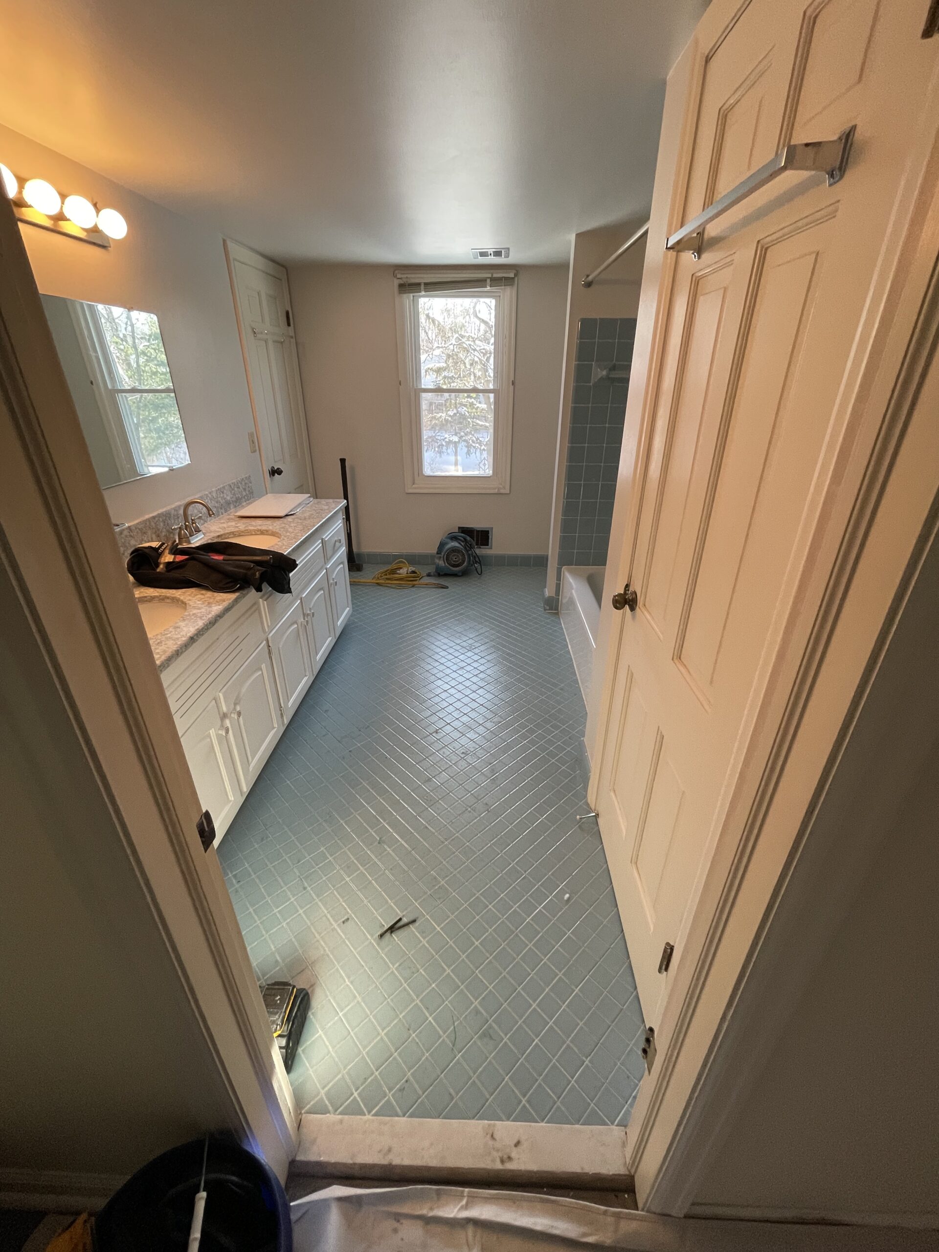 I’m sure you have seen this color and style before. They chose to keep the vanity to conserve on cost because it was relatively new. With this in mind, we proceeded to tackle the rest of the room. Once demo was completed, we proceeded to start putting the bathroom back together.