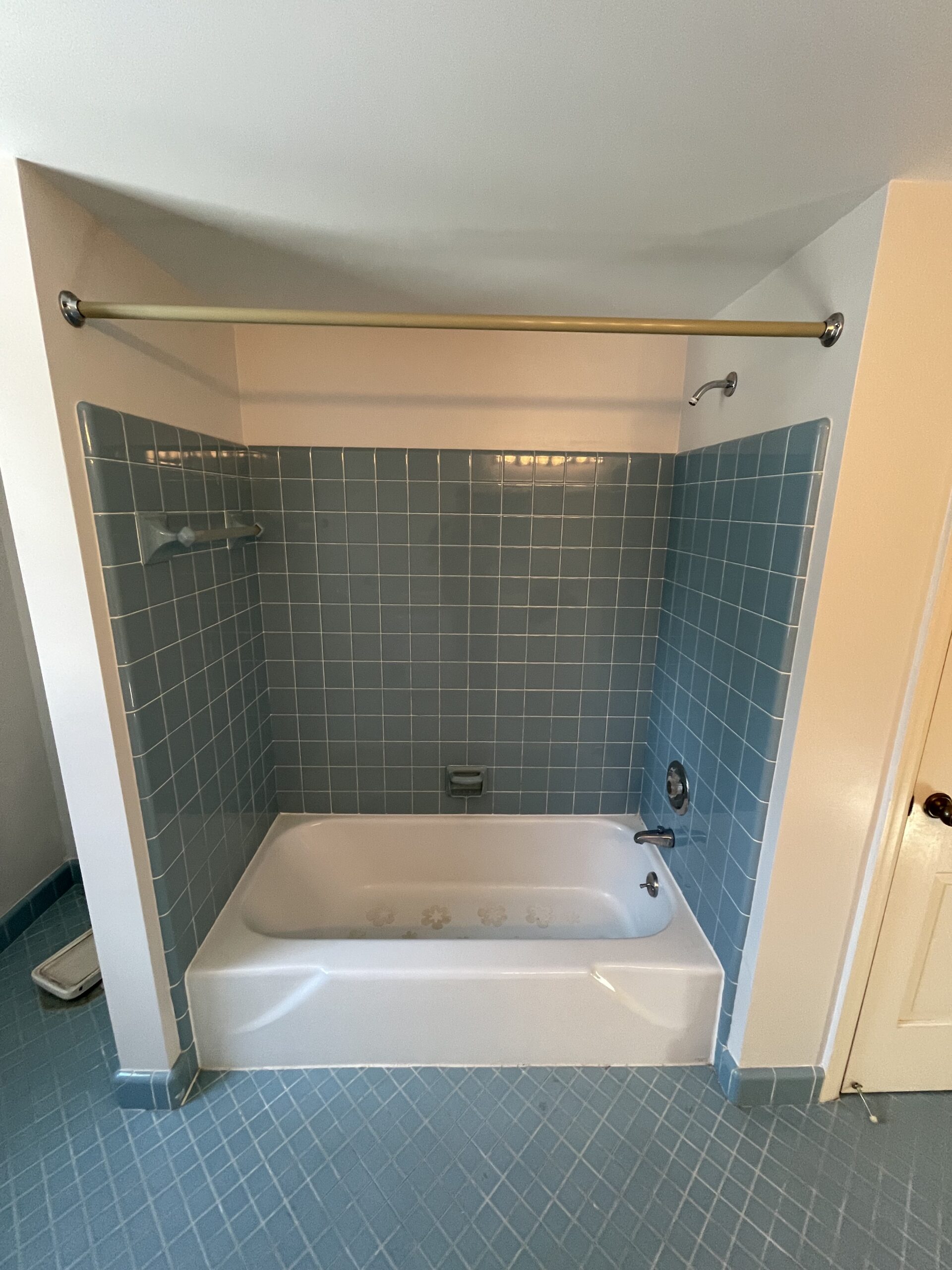 Let’s tackle our next bathroom facelift! Bathrooms have always been a space to showcase your taste and sense of flair. This proves true with older bathrooms as well. We have all seen the bright pinks, blues, greens – the list goes on and on. Unfortunately, this look has gone the way of the dinosaur. Clients from all over our service area contact us to rip out the old, colorful tile and install new, modern fixtures and layouts. Our client contacted us to get rid of the old look of their tub and blue tile flooring. After working together to select products, we went to work gutting the old room.