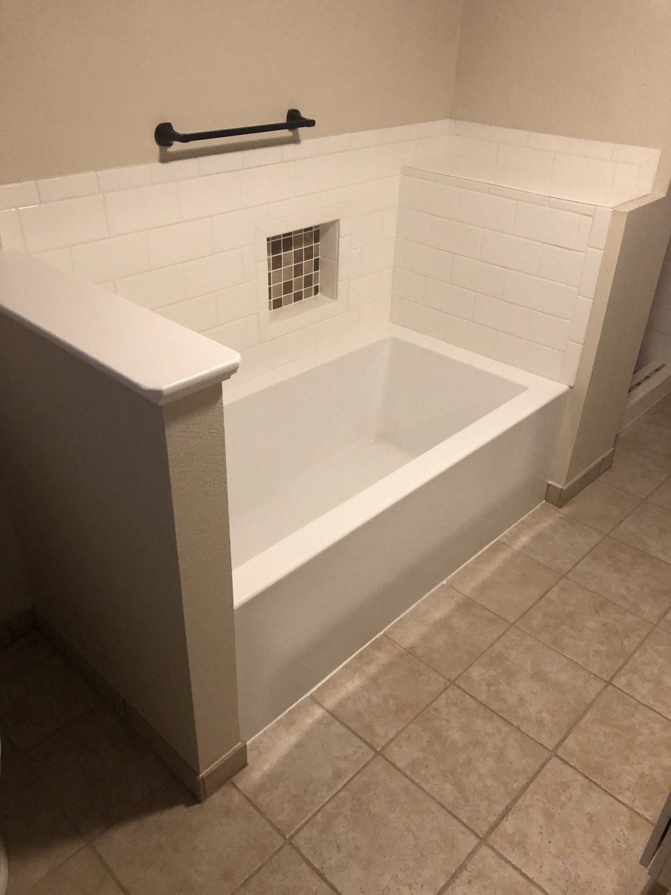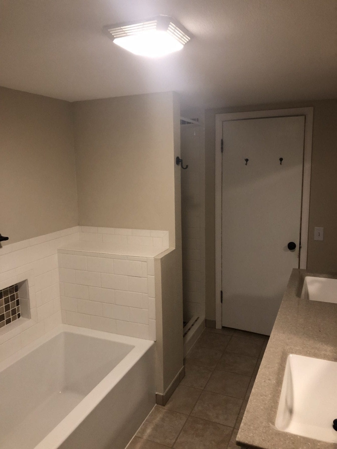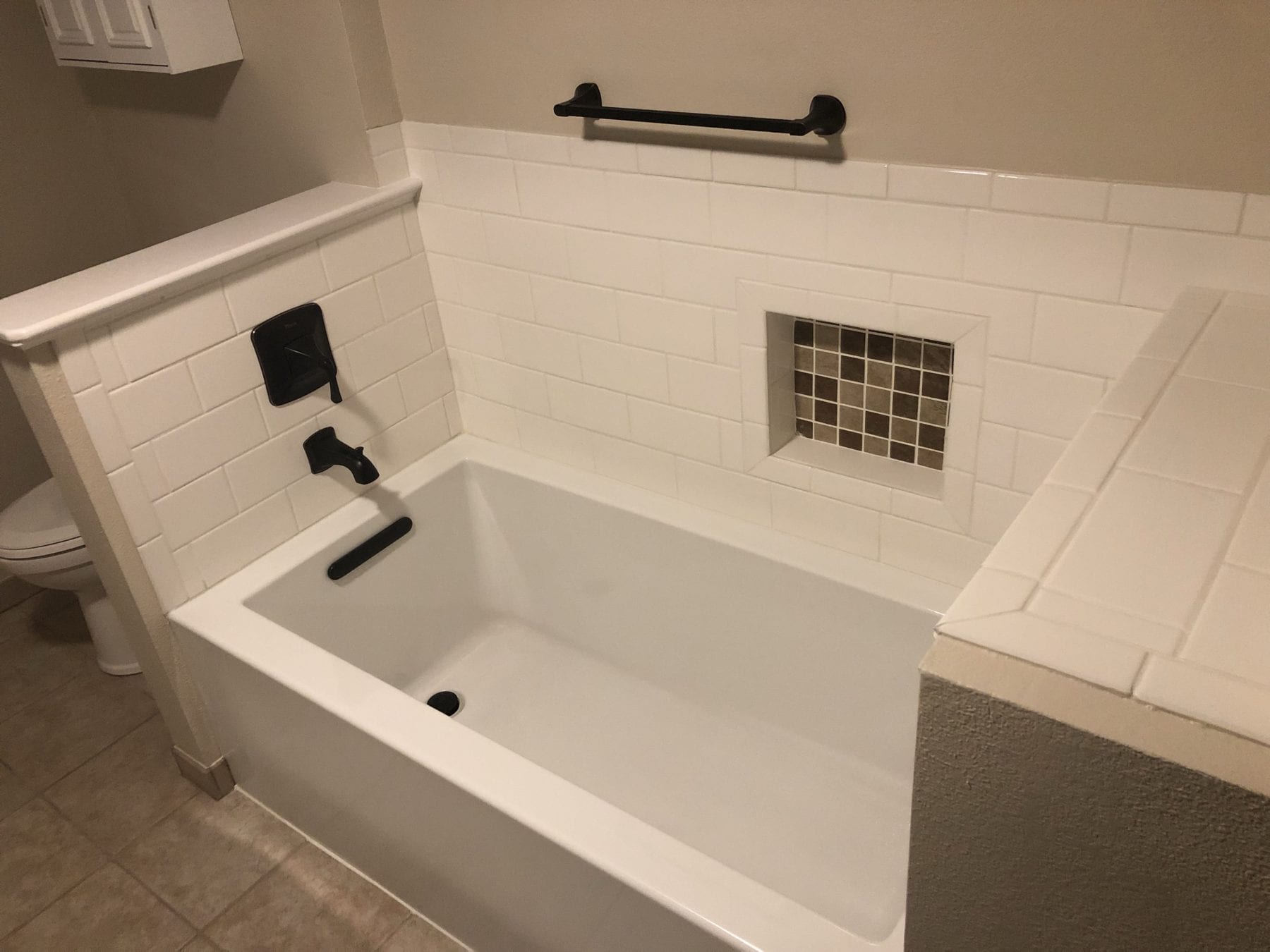 We have all seen the 4×4 pink, purple, gold and blue tiled bathrooms of yesteryear, right? Our client desired to update this dated look in favor of contemporary, yet simple, products to recreate the space. We installed a tile shower with a pretty accent inlay, and pulled the tub location together by installing the same subway tile as a splash. By installing the recessed niche near the tub, the client was provided with an easy place to set their toiletries. The double vanity with the white under mount sinks paired perfectly with the white subway tile. The space turned out to be exactly what our client was looking for, and we were excited to be afforded the opportunity to make their dream a reality!