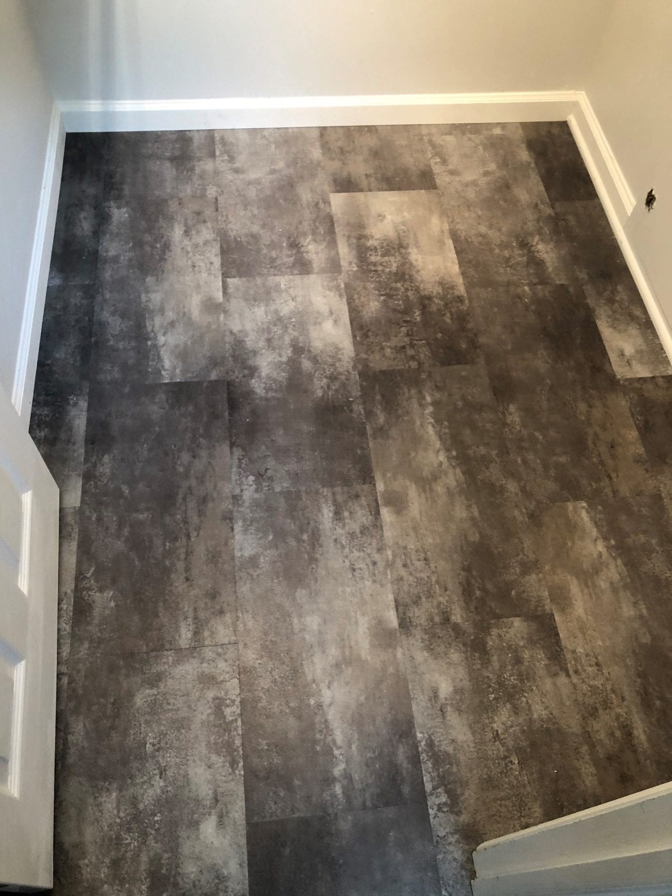 Our client knew what they wanted, which helped us procure the correct materials to pull this bathroom remodel together. One of the key parts was the shower – they desired a clean, streamlined look for this space. We delivered on this though process by installing a white Onyx shower system. These systems are easy to clean while providing a crisp, clean look.  The pivot shower door came from Basco, and has an integrated streak free coating to make cleaning a snap! The vanity became a focal point of the bathroom with its furniture-inspired appearance. The white, squared vanity top paired beautifully with the shower unit. Our client loved their existing large mirror, so we incorporated it into the new design. The final touch was the flooring.