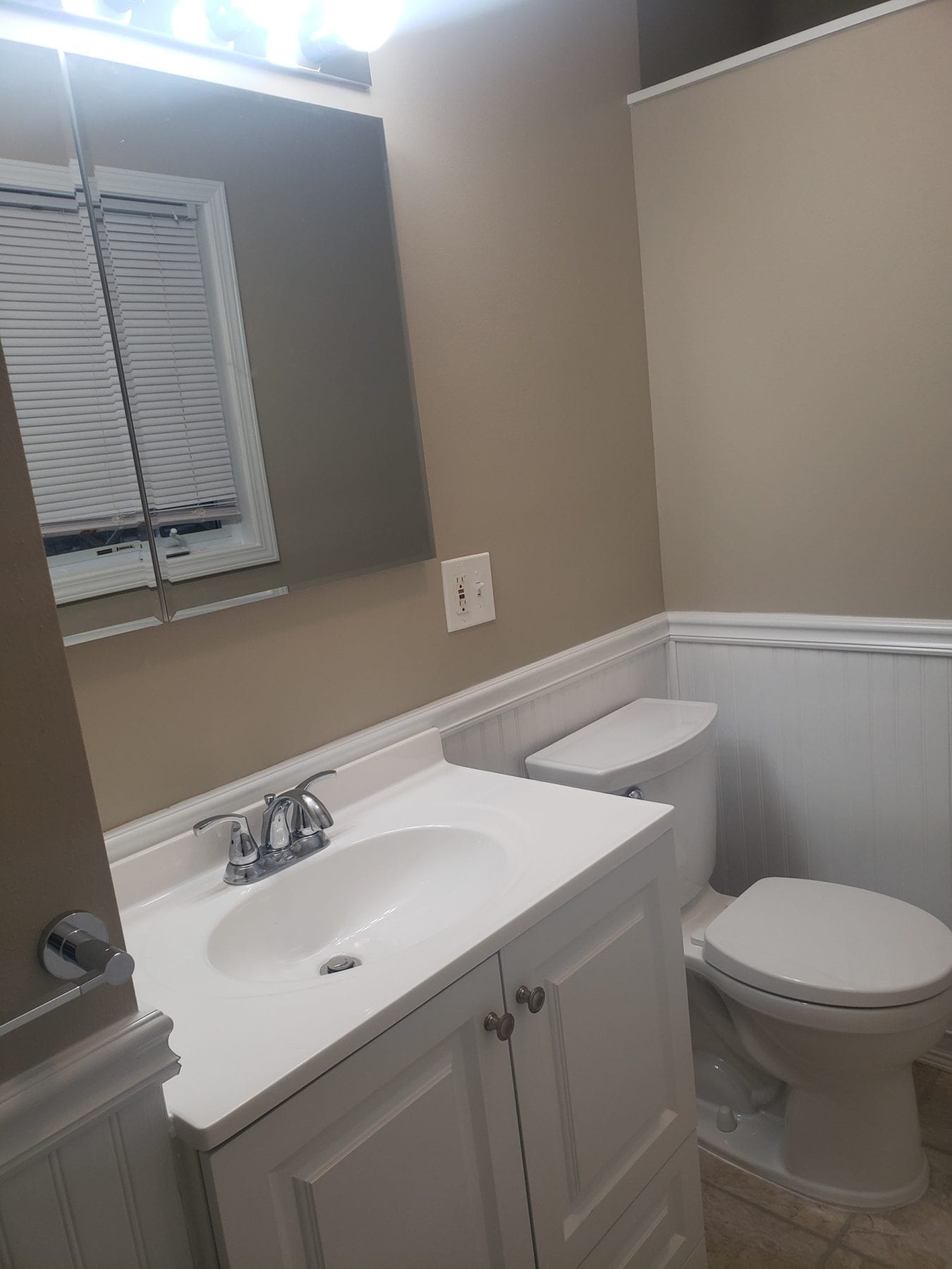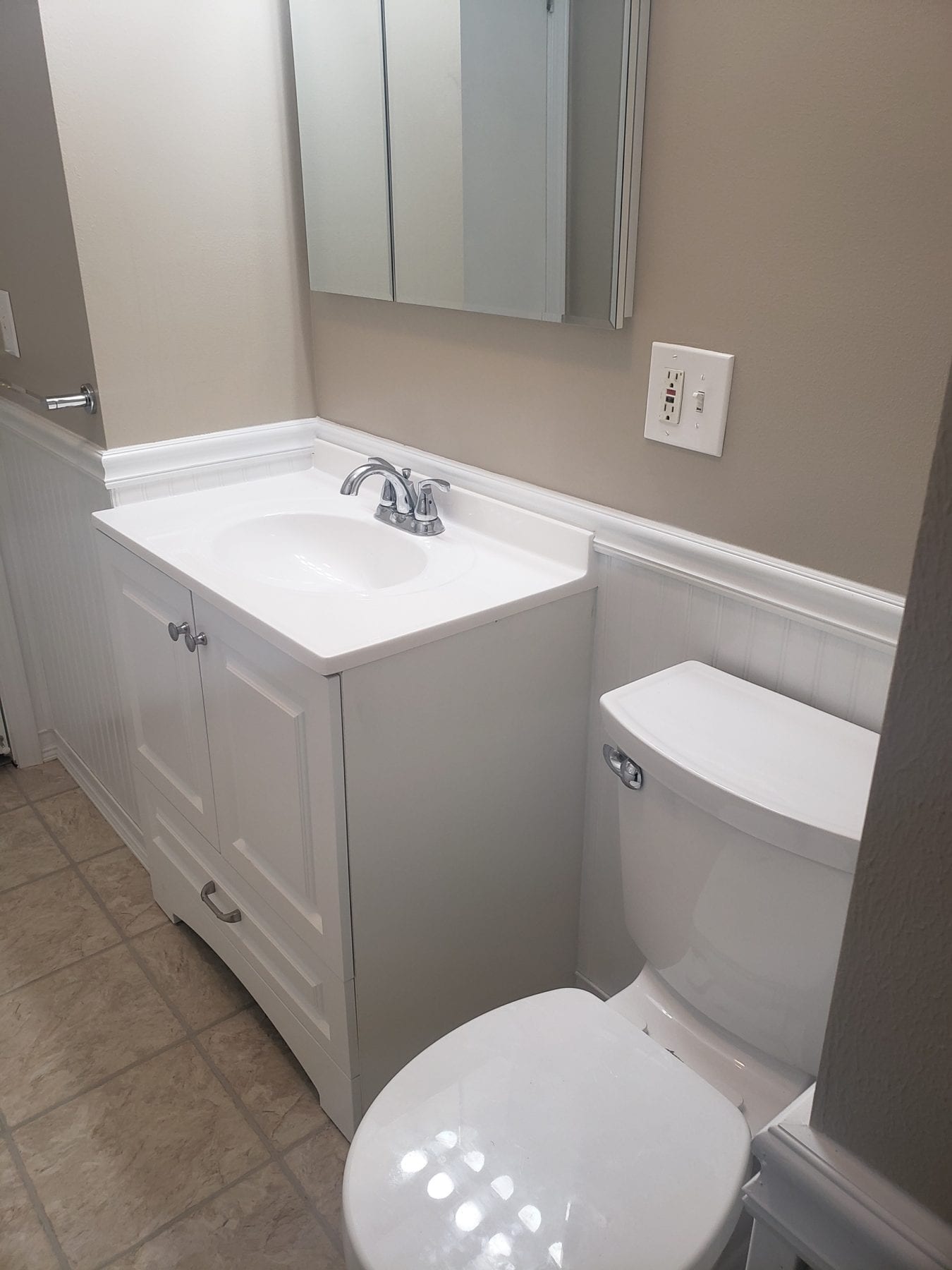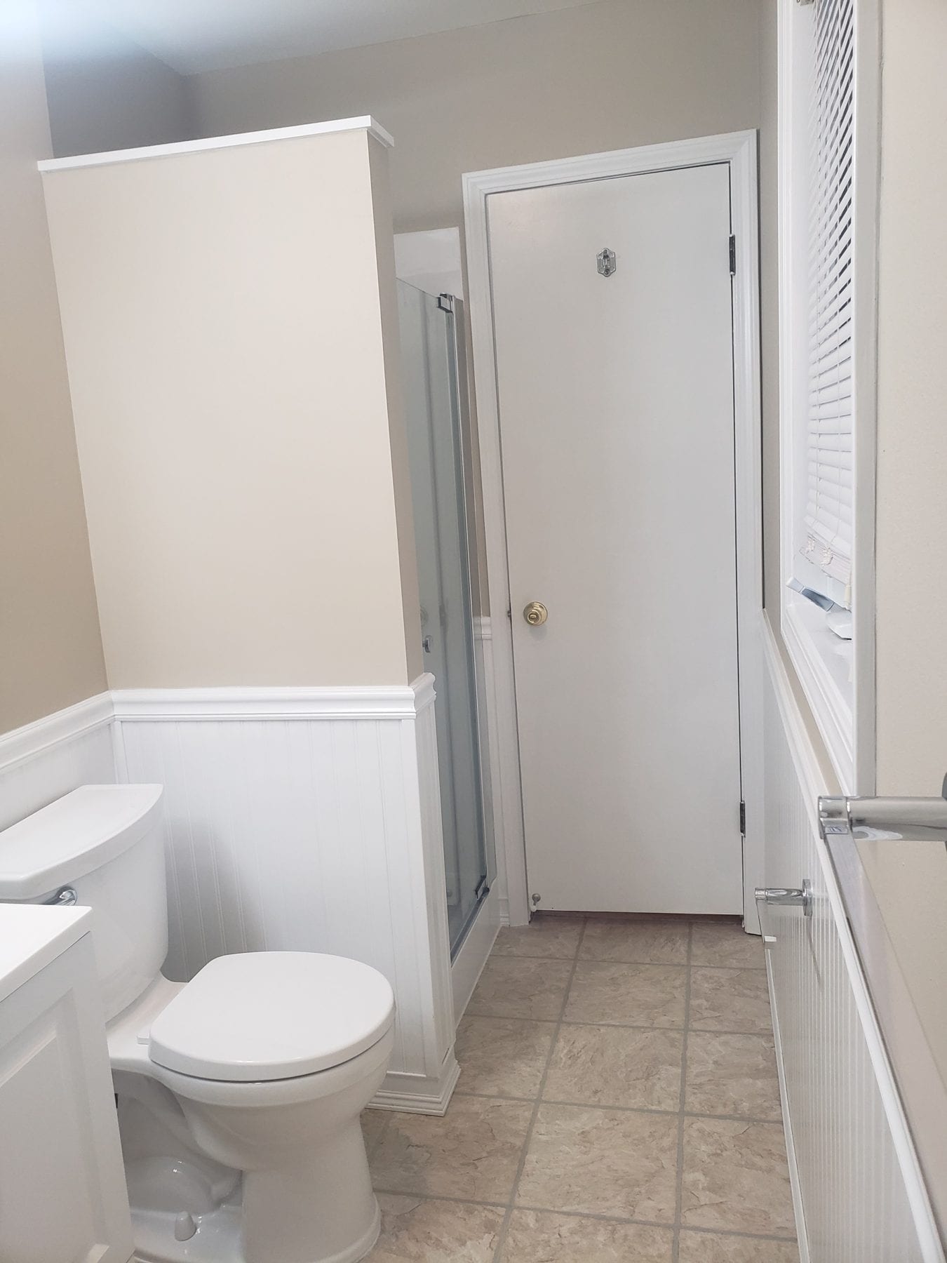 Our client’s main objective was simple – a clean looking looking bathroom that would be simple to maintain. We framed a pony wall to create the new shower space, but didn’t run it to the ceiling per our client’s request. Vinyl plank flooring replaced the dated tile, and crisp white mouldings left a clean appearance. We opted for a vinyl wainscot to ensure long-lasting performance. When it comes to the products you choose, be sure to read manufacturer recommendations to ensure that the product is installed properly. Case in point: the vinyl wainscot called for painting with nothing but oil-based paint, because standard acrylic and latex paint would not bond properly. The bathroom update turned out to be a resounding success, and our client remains absolutely thrilled with the results.