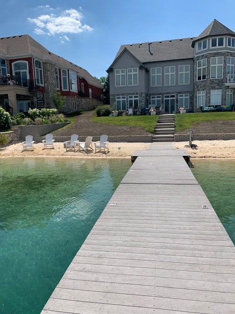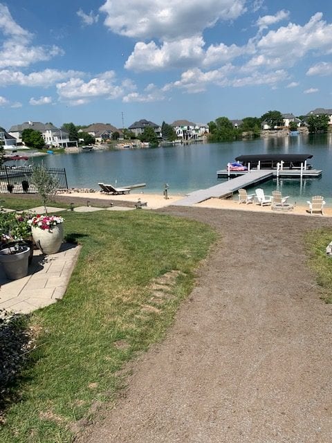 What an amazing view! Our client had sand installed to freshen up the actual beach area itself, and it looked like a whole new space. However, as with any project, there can be hiccups. With equipment coming in and out, we had to grade the soil in their back yard and reseed the lawn. Well, our client wanted the wall as low as possible to give a clean, sleek appearance. Unfortunately, mother nature decided to rain a couple of days after completion and eroded soil down onto the beach sand. Your know the saying: when it rains…. GRAB AN UMBRELLA AND GET TO WORK! We raised the level of the wall temporarily with metal landscape edging to allow the new grass seed to take root before it could all be washed away.