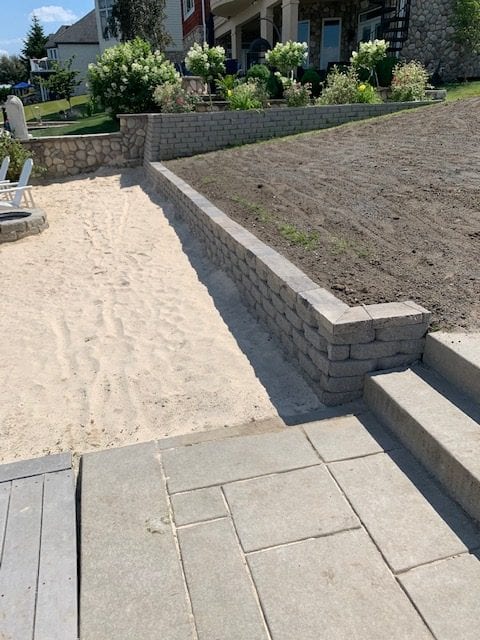 Typically you travel out of state to get to a sunny beach area. A quiet spot to relax and soak up the sun. In our client’s scenario, the beach was in their back yard! The landscaping surround the beach area, however, caused the sand to wash away and created a mess. The client tasked us with installing a new retaining wall and making the space great again.