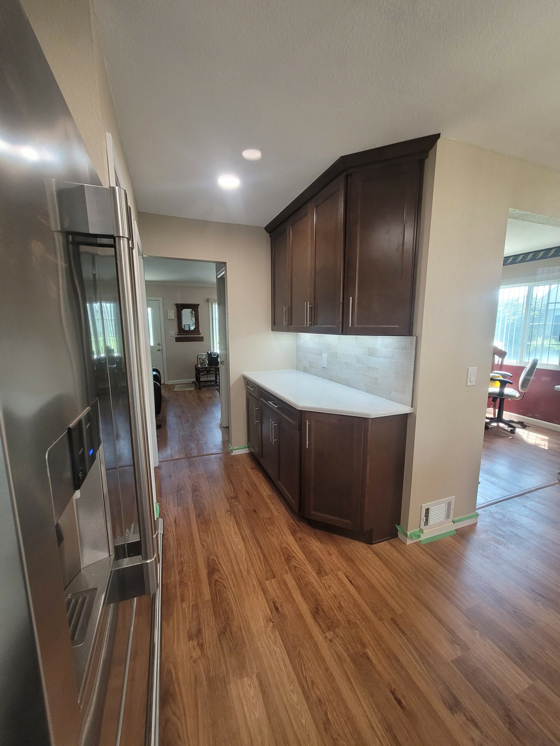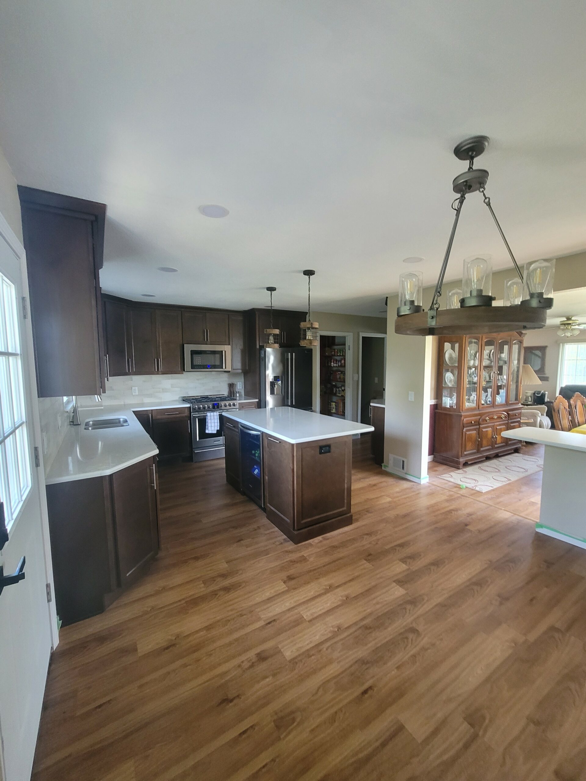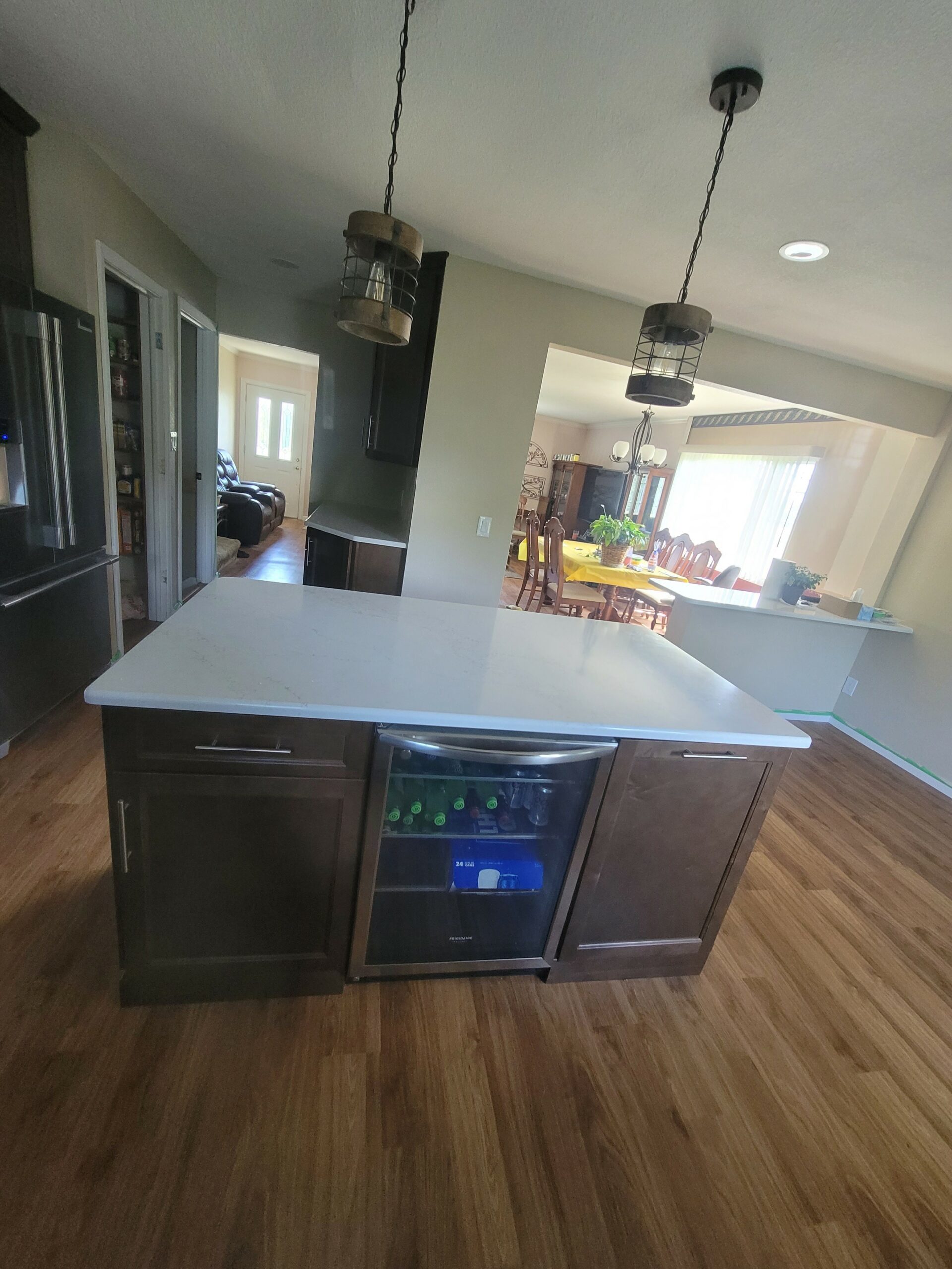 We eliminated the bulky peninsula and trenched through the slab for our island electrical. The dated florescent lighting was eliminated and new LED recessed fixtures were installed. We also installed a couple of pendant lights over the peninsula to add some ambient lighting. To add some more usable space, we installed a beverage center at the island. Undercabinet lighting added additional character to the space as well. Our client hated how closed off the space felt due to the small doorway leading from the kitchen to the living room area, so we opened the space and installed a bar seating area to bring the rooms together. The finished results turned out even better than imagined: