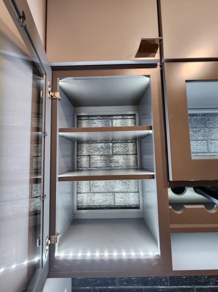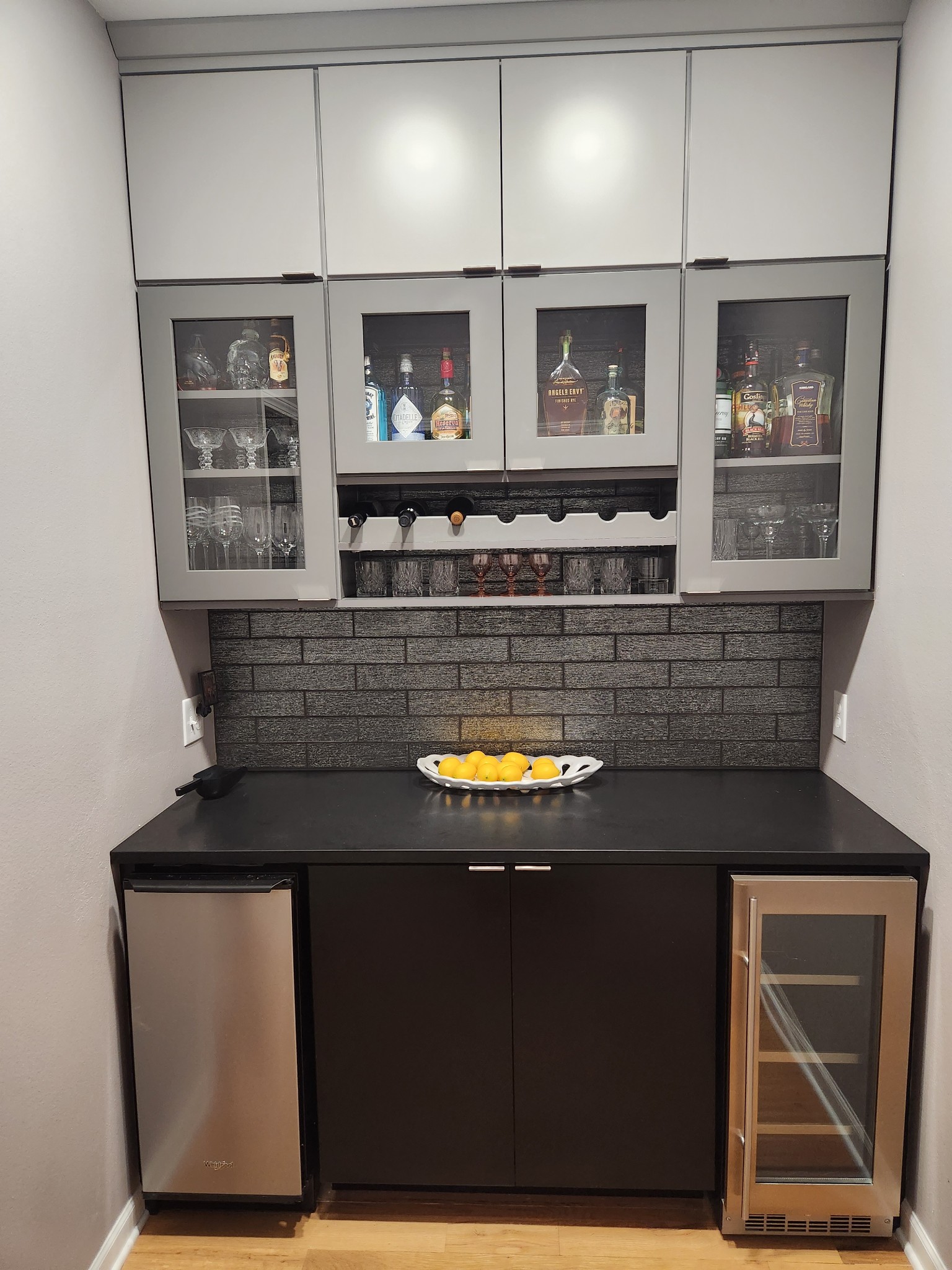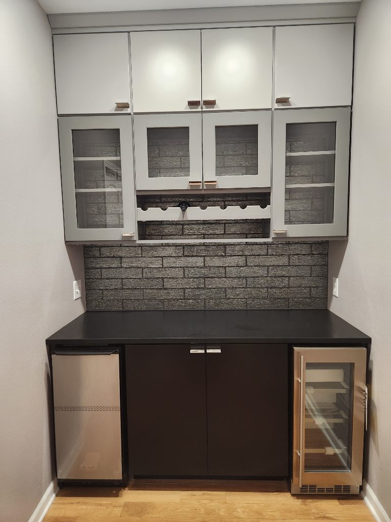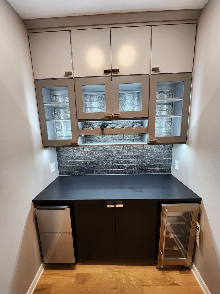 The space may be small, but it had a lot going on! We ran water lines for the built in ice maker, as well as a condensate line for defrosting. A small beverage cooler created the perfect spot quick grab drinks. Contrasting stacked cabinets added to the allure of the space, but something else really made it pop. We installed led tape lighting on the backside of the cabinet stiles to provide a perfect glow to light up the new beverage station. The lighting also showed off the gorgeous tile that the home owner chose. Our client loved the results, and we enjoyed the challenge of tackling the project. Do you have any unique ideas that you would like to see brought to life? Give us a call to get your project rolling today!