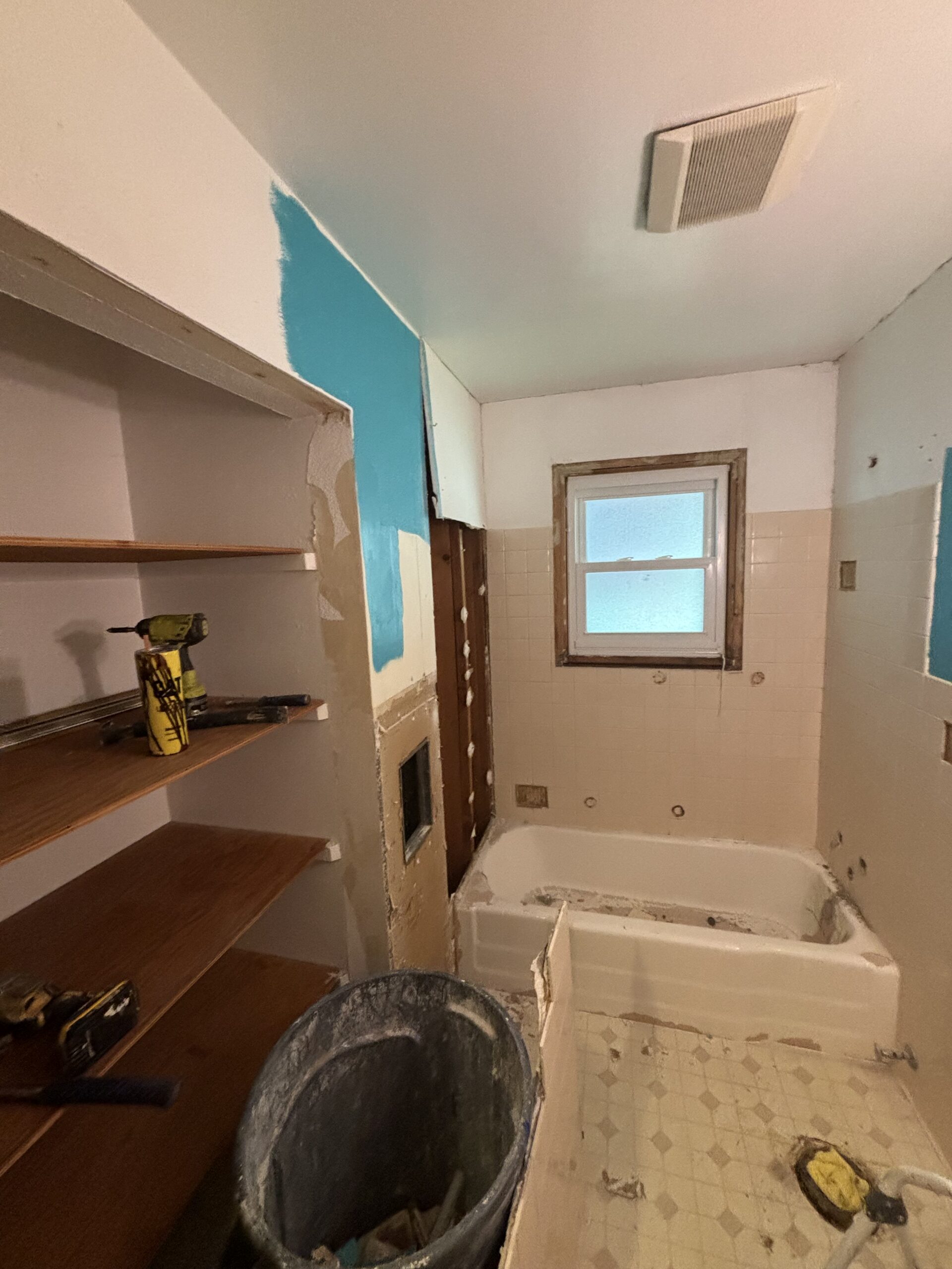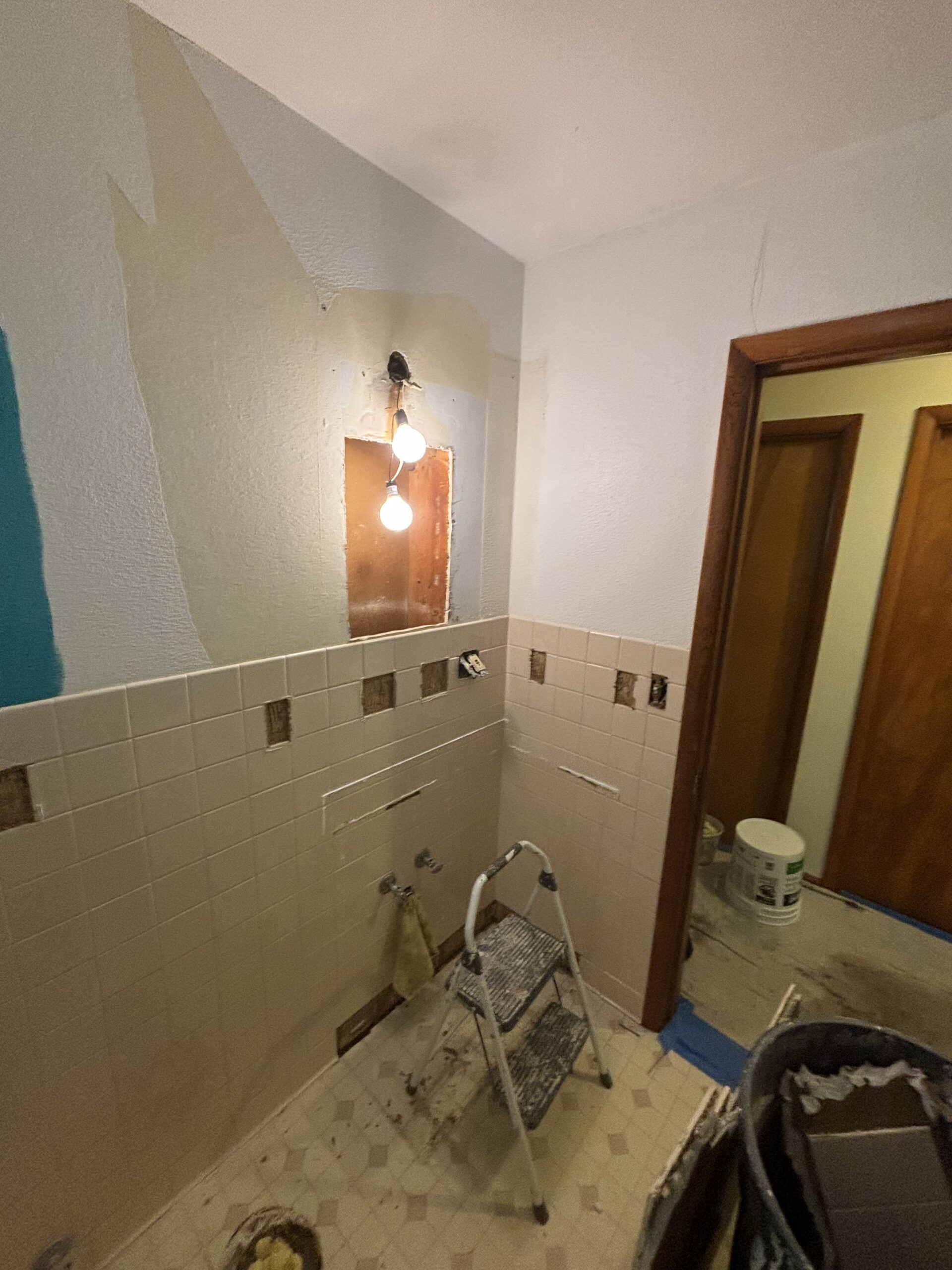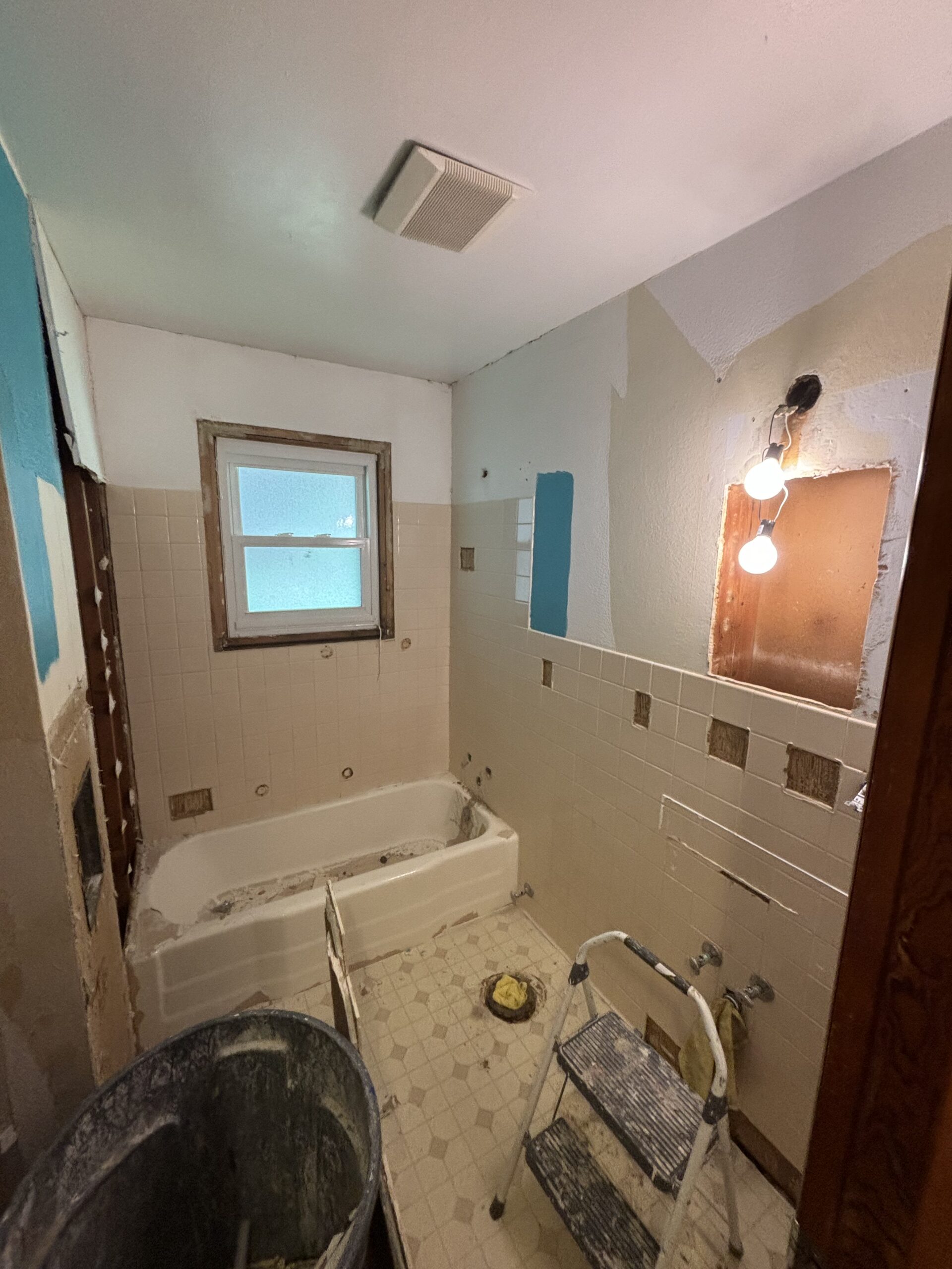 Hello Everybody! Welcome back to another A+ Home Improvements’ project!! Our next client’s home contained a severely dated bathroom that needed some help. Having a bright bathroom topped the list for this home owner. We went over a number of options to achieve the goal, and our client made some neat selections. We started by extracting the old, tan tile and cast iron tub that showed the bathroom’s age. For ease of access and use, our client opted to install a walk in shower. After pondering over options, Flexstone became the shower material of choice. With its ease of cleaning and stunning look, Flexstone shower enclosures provide great bang for your buck. Let’s see what we started with: