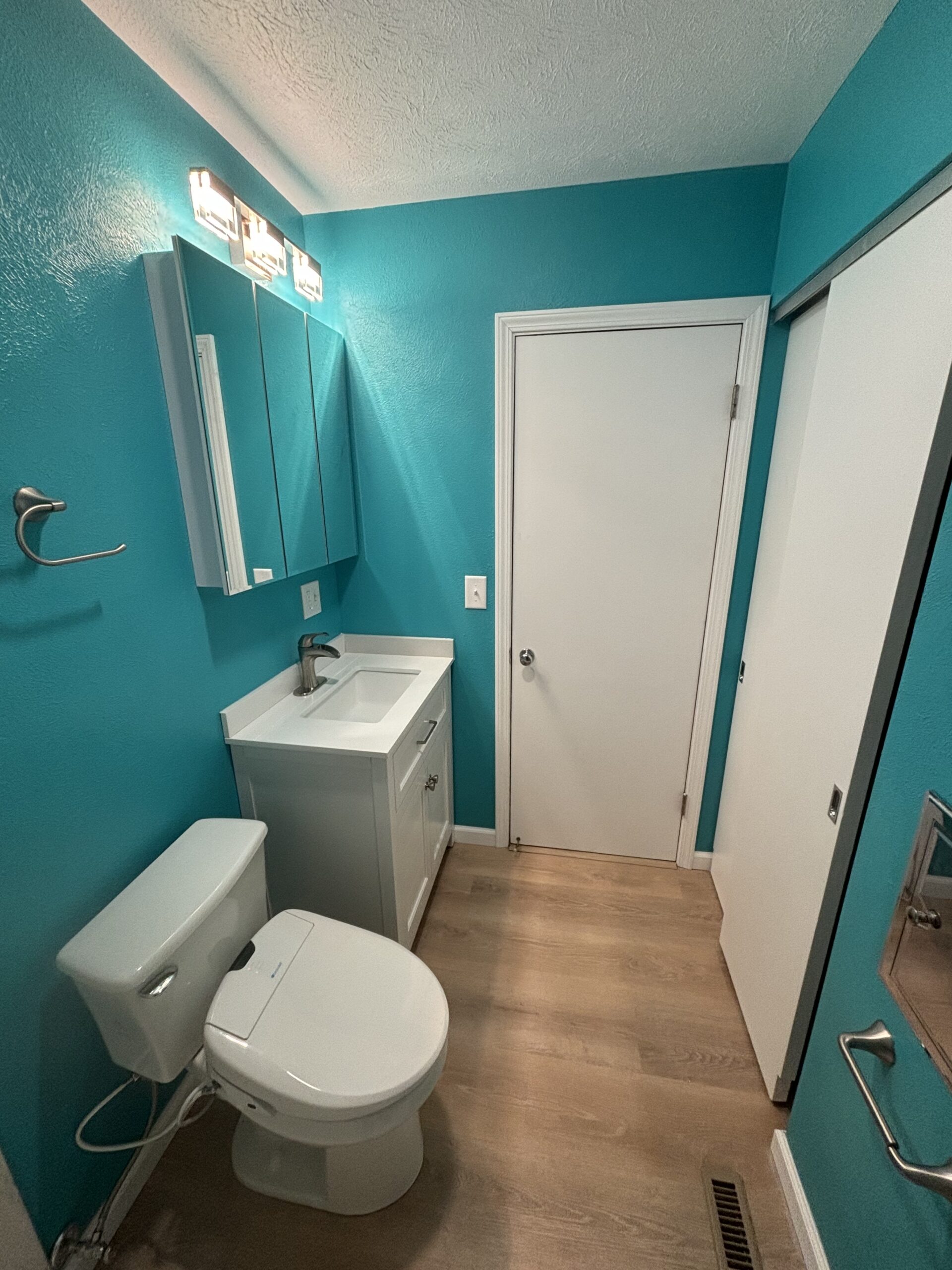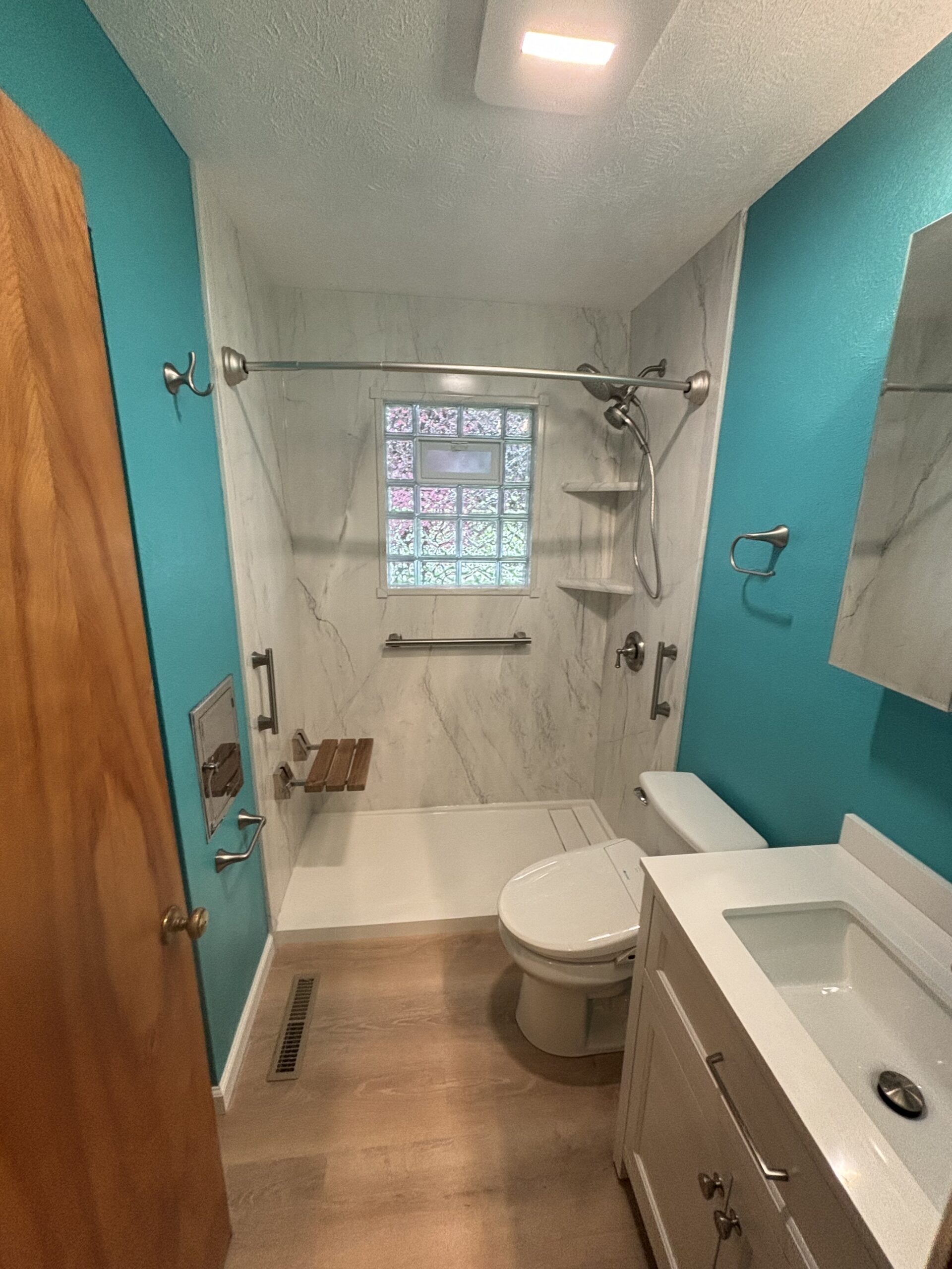You can see in the picture that our client tried to see what a bright splash of color would do to the space. We always recommend trying a few colors out on the actual walls because the small color samples can be deceiving. We removed the tile wainscot and dated flooring and prepped for the new fixtures. To ensure safety while showering, we install a couple of grab bars at the surround. We also installed a folding shower seat to be useful when needed and out of the way when not. Take a look at the surround! Flexstone shower surrounds provide numerous color options to perfectly suit your tastes. To round out the project, we installed water proof vinyl flooring and updated fixtures. Take a look: