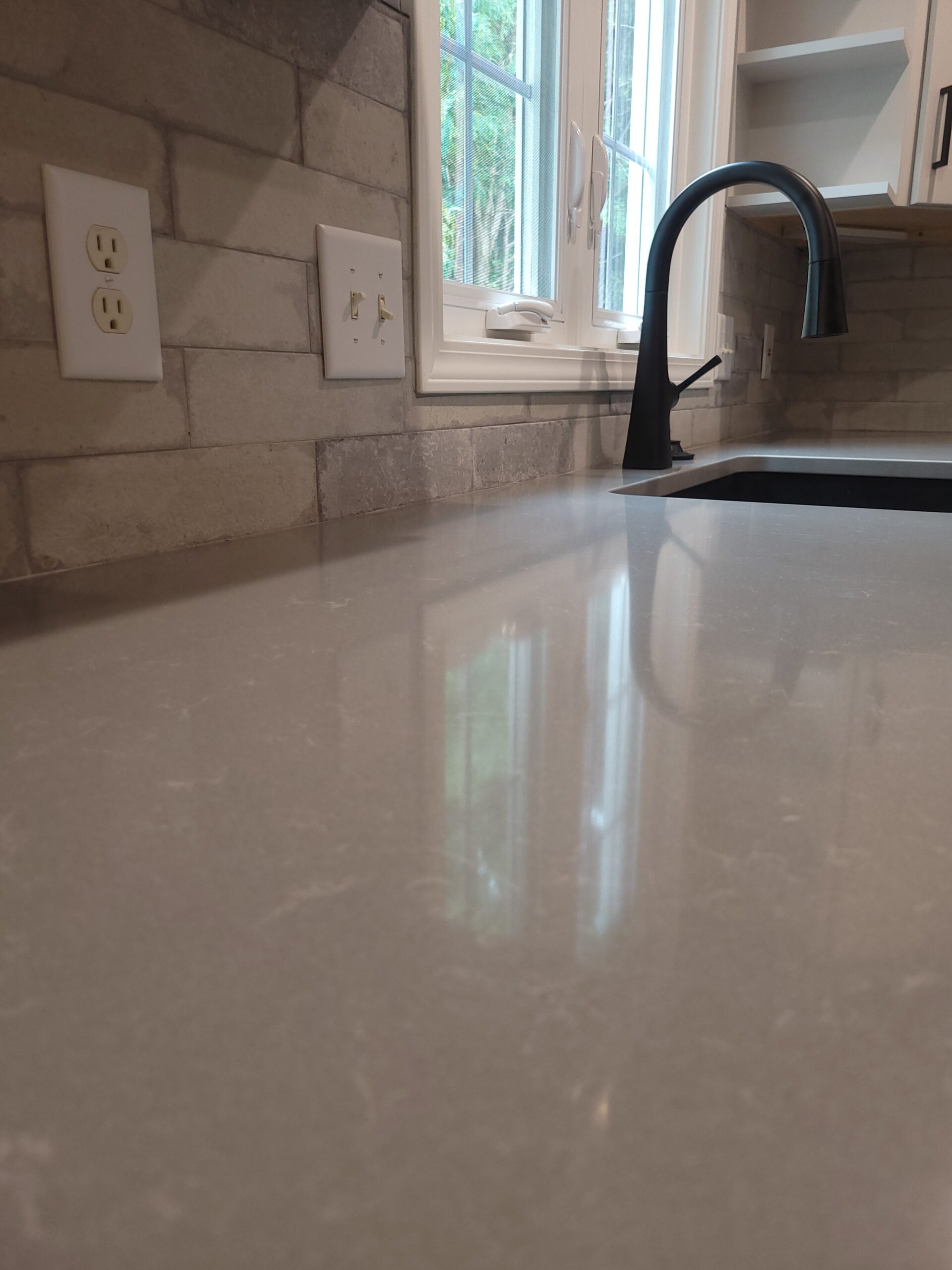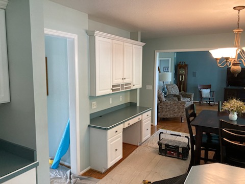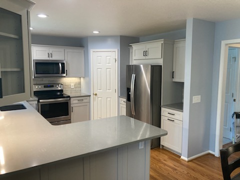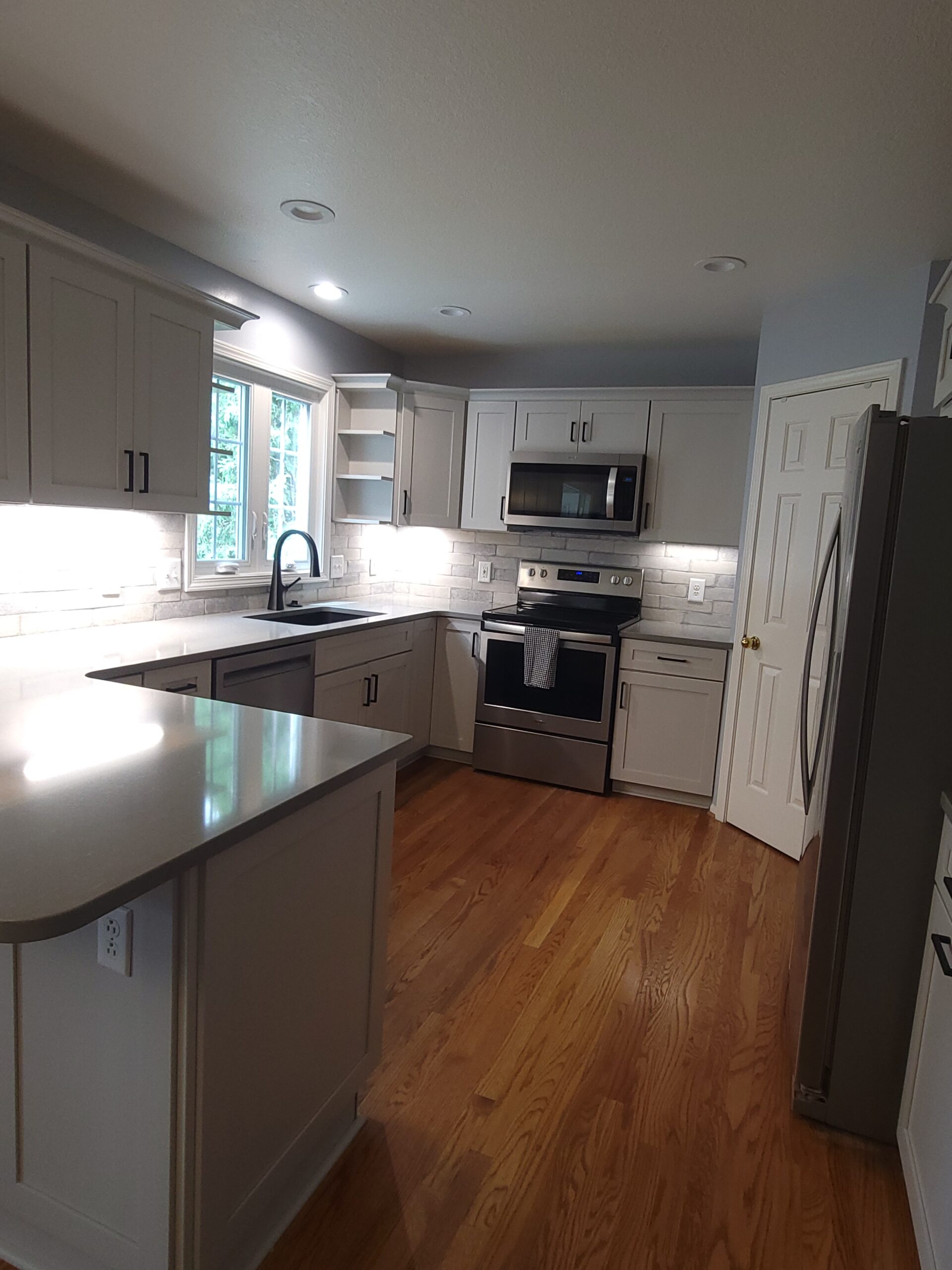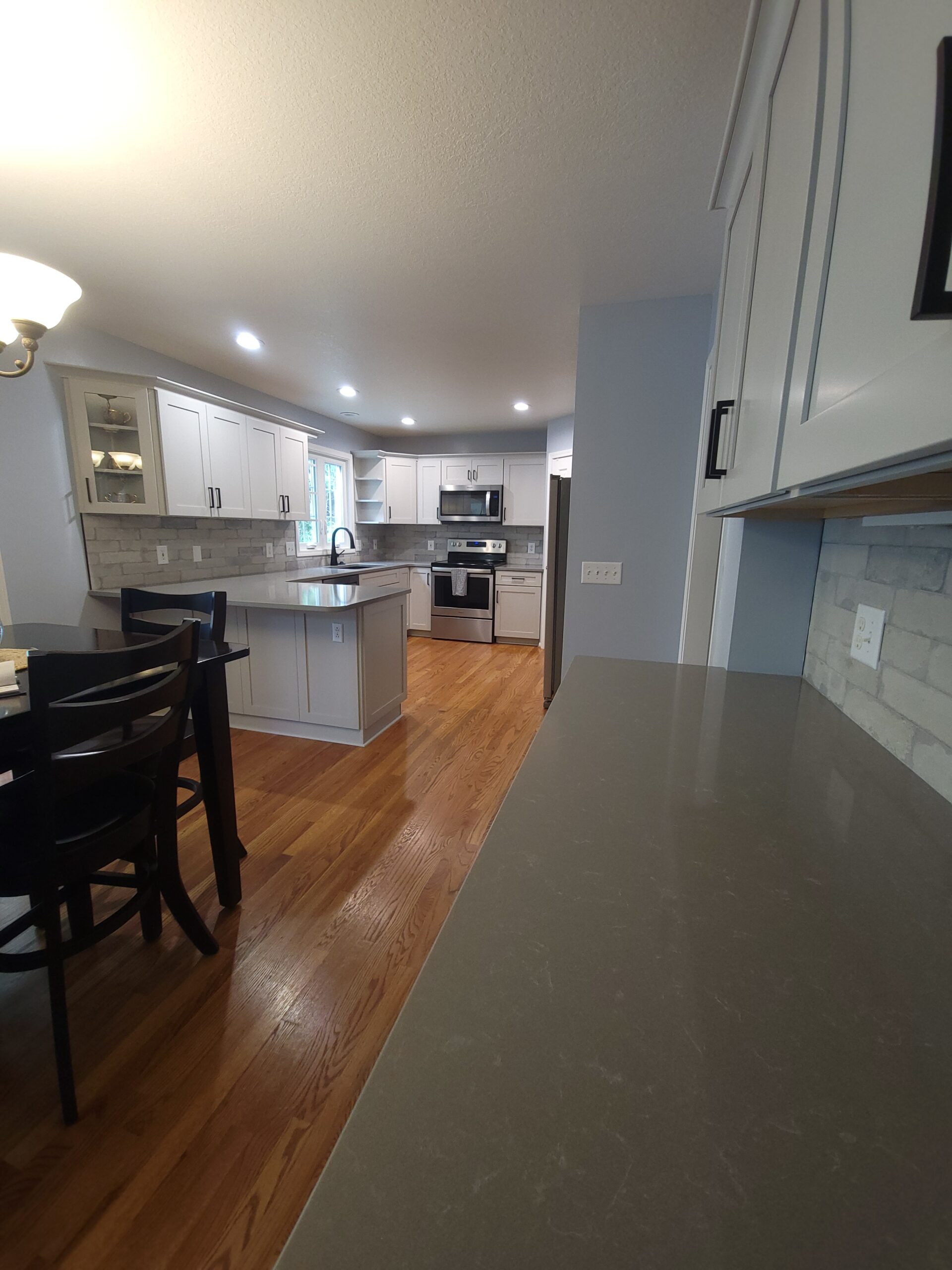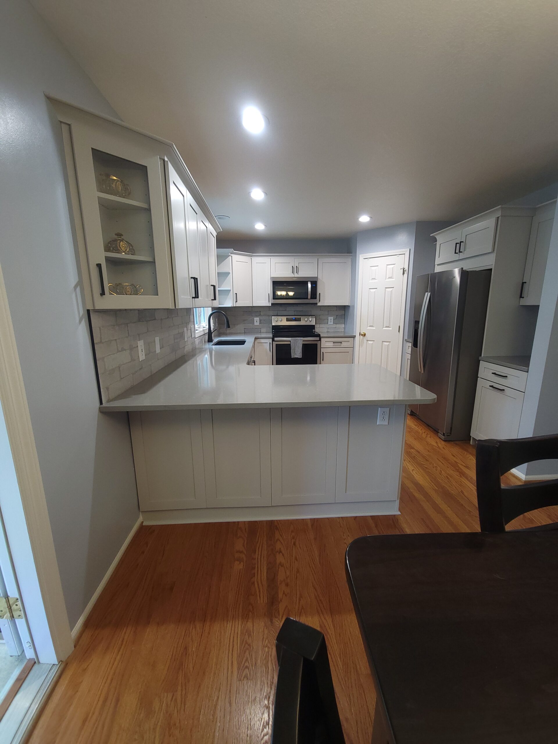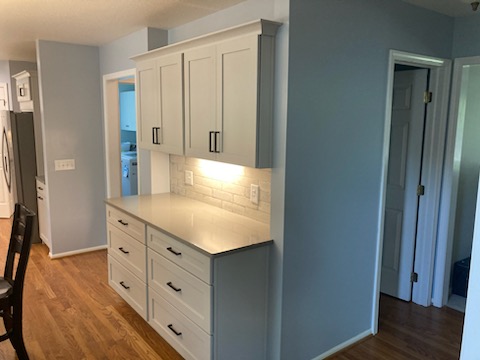 Aside from small functionality issues, the unused desk area presented the biggest problem. Our client opted for cabinets to create a serving area that made more sense for their lifestyle. We paired the new cabinets with a gray quartz top and beautiful tile backsplash to pull the room together. New led trims replaced the dingy bulbs and baffles at the existing lighting to provide better lighting. Let’s take a look: