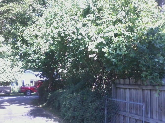 In the pictures, you can’t even see a portion of the fence. Likewise, no one would know that there is actually some unused space next to the garage. We rolled up our sleeves and went to work clearing the unsightly overgrowth.