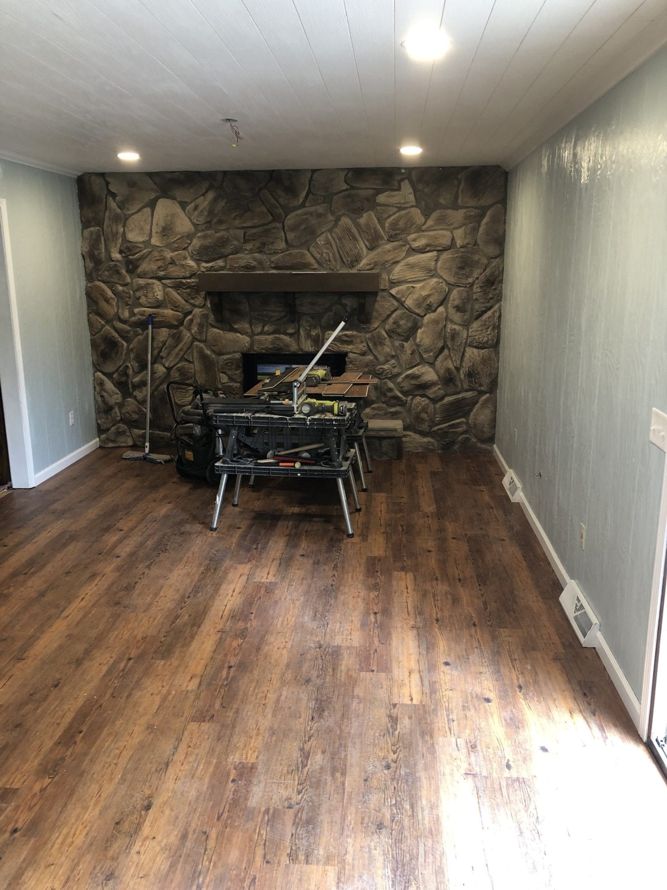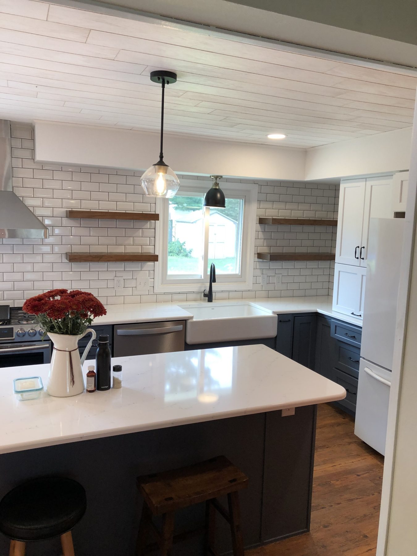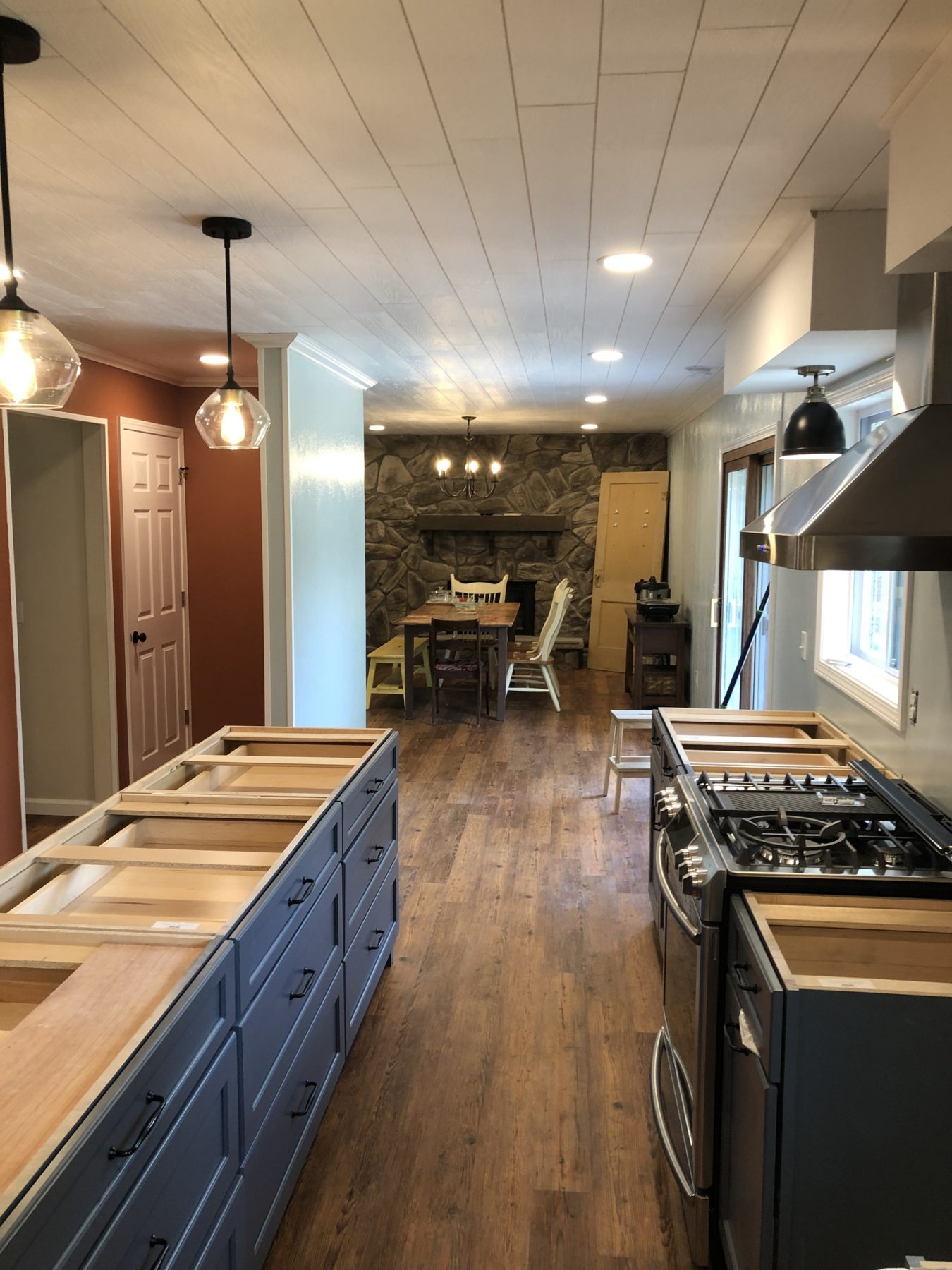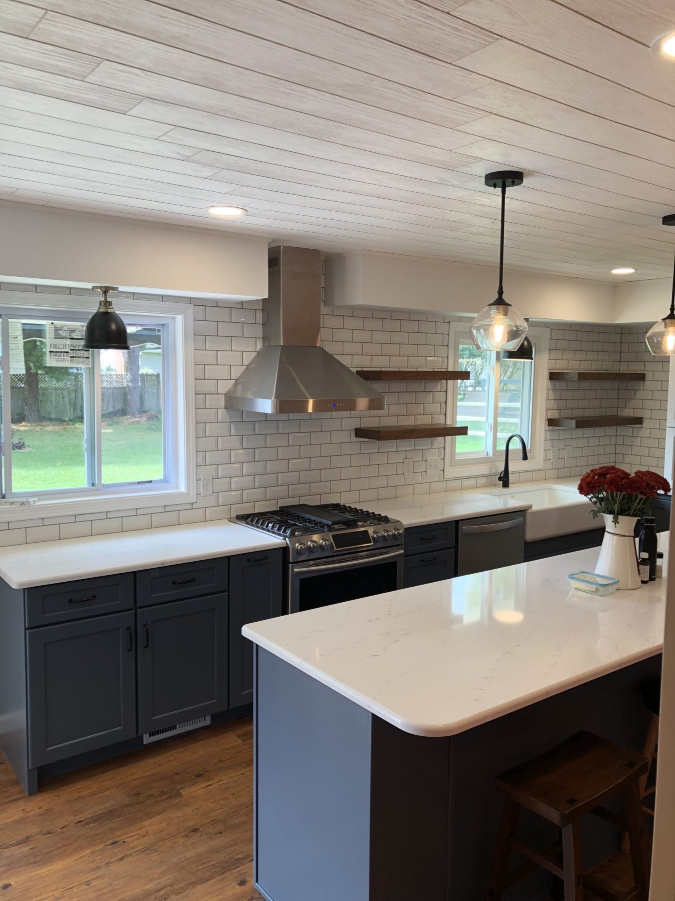 The fireplace already existed, and after weighing the cost of removing it, our clients decided to build around it as an accent piece. We installed new flooring throughout the entire first floor, which added to the feeling of an open, connected space. To add further character, our client opted to have a faux wood ceiling plank installed, which turned out perfectly! The space was started to come together. All that was left was the complete kitchen renovation.