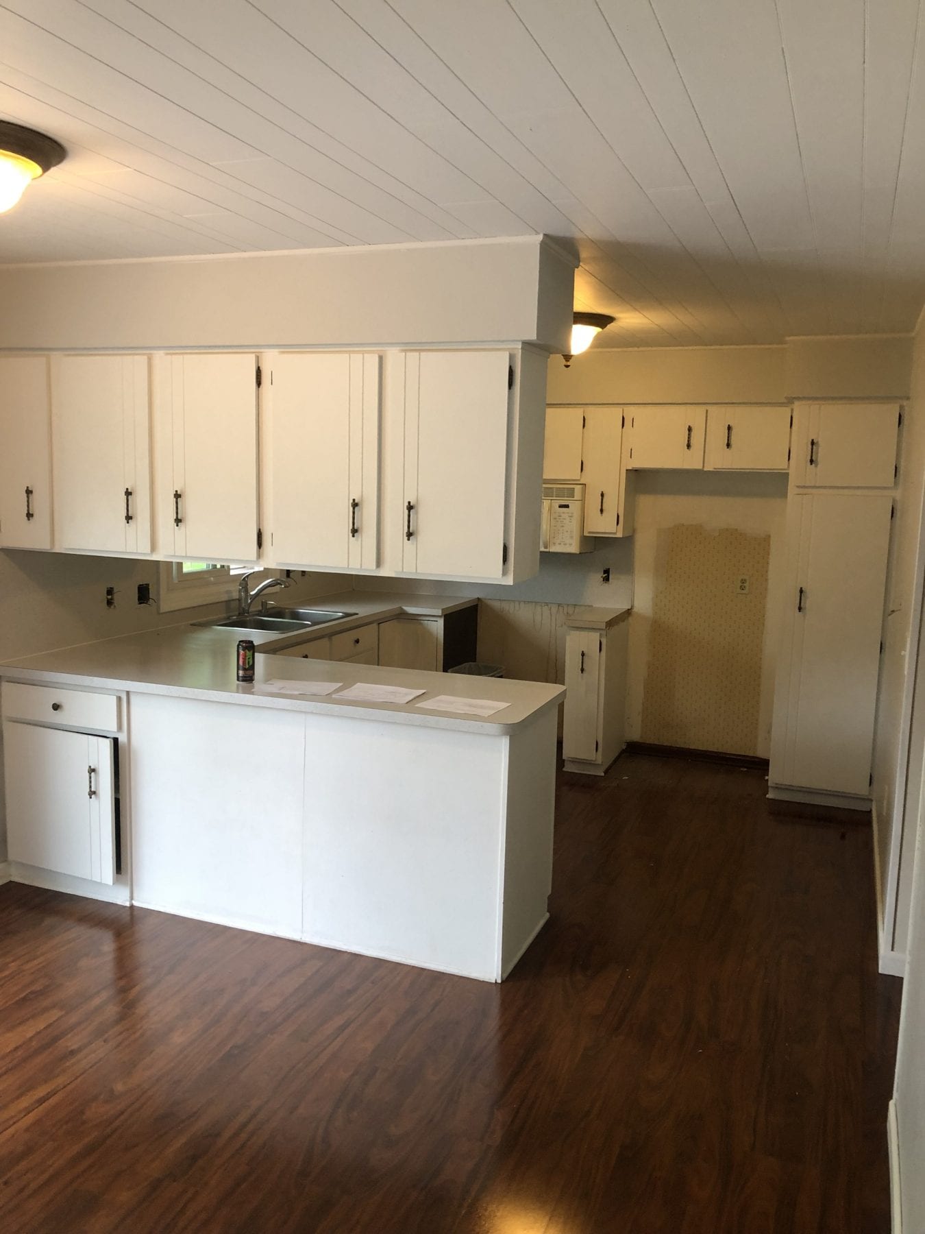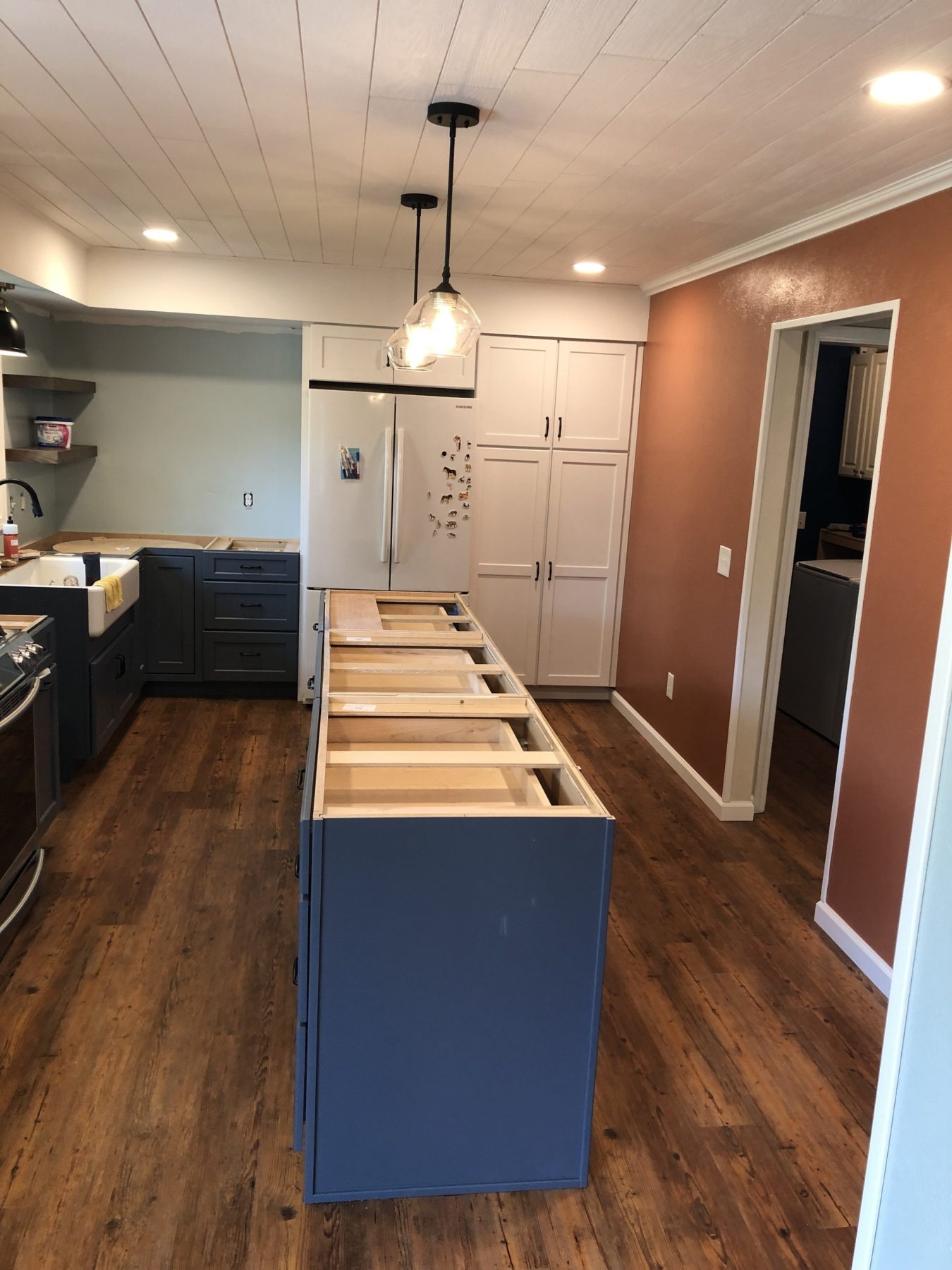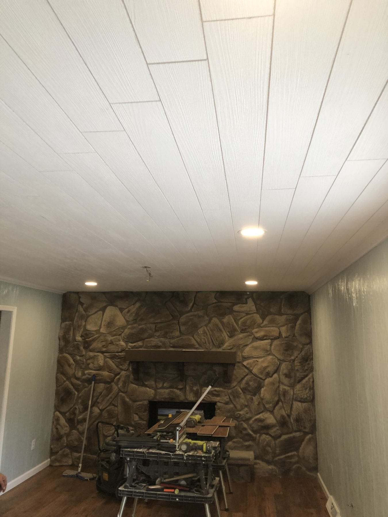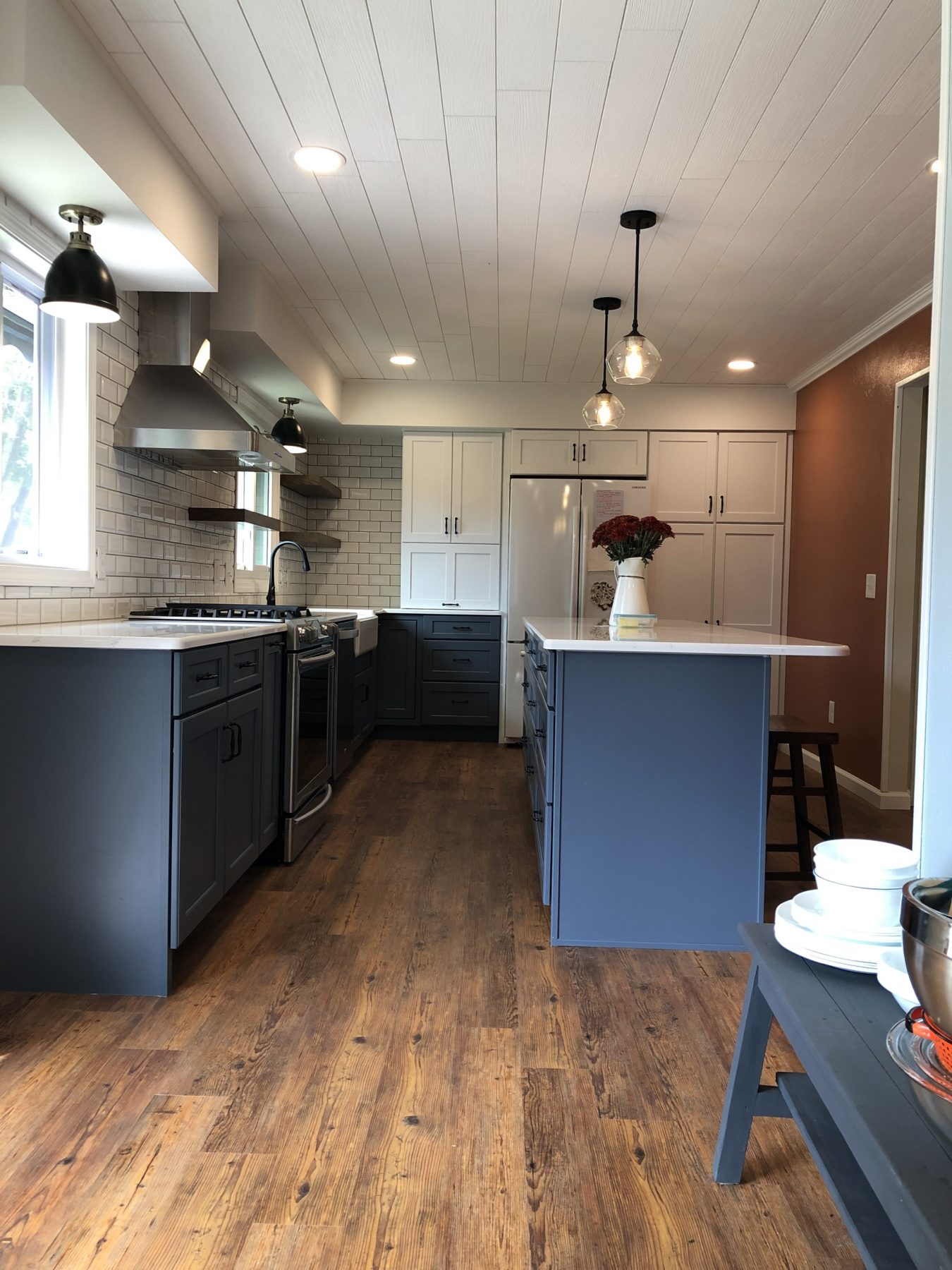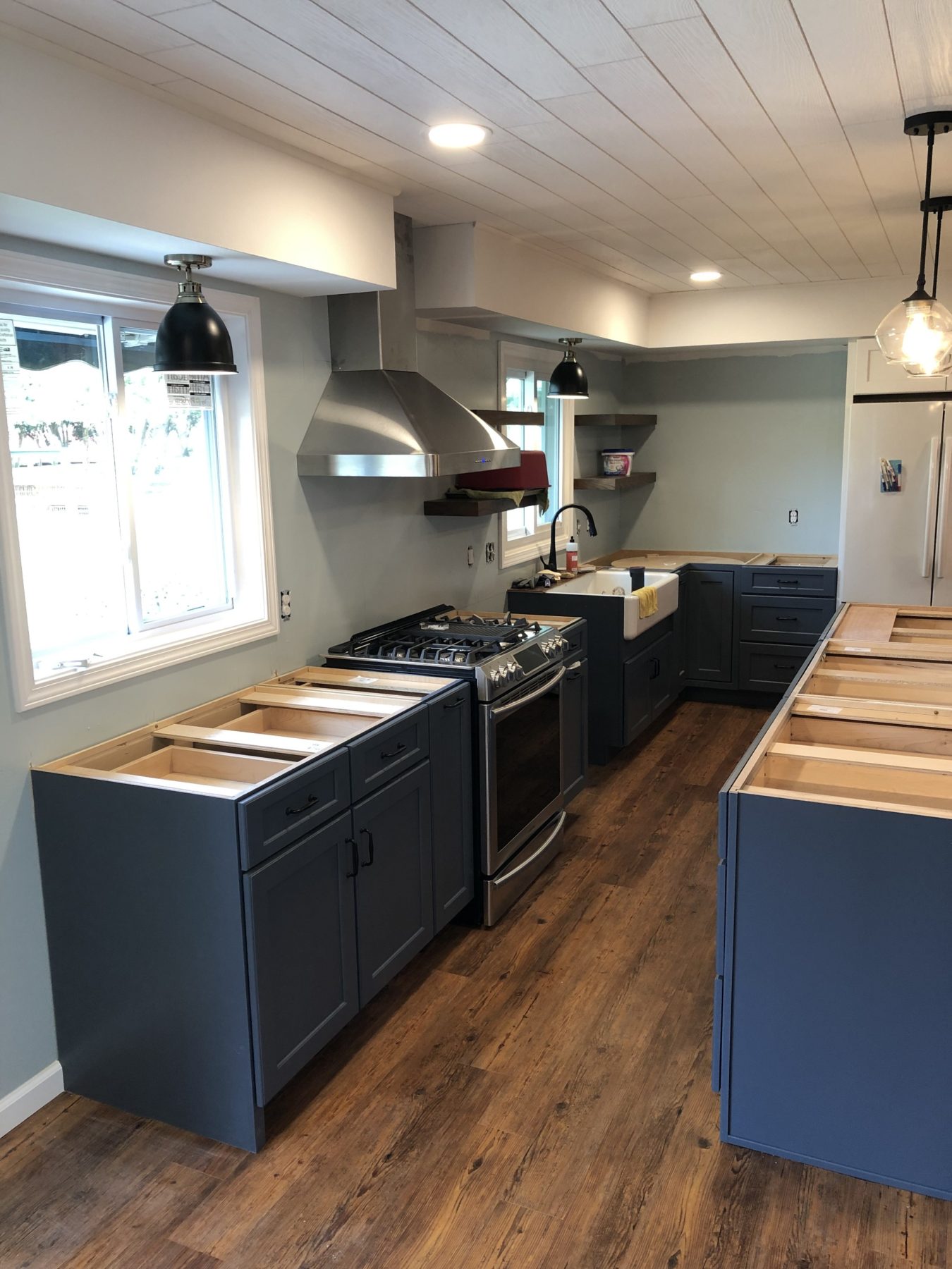 The fireplace already existed, and after weighing the cost of removing it, our clients decided to build around it as an accent piece. We installed new flooring throughout the entire first floor, which added to the feeling of an open, connected space. To add further character, our client opted to have a faux wood ceiling plank installed, which turned out perfectly! The space was started to come together. All that was left was the complete kitchen renovation.