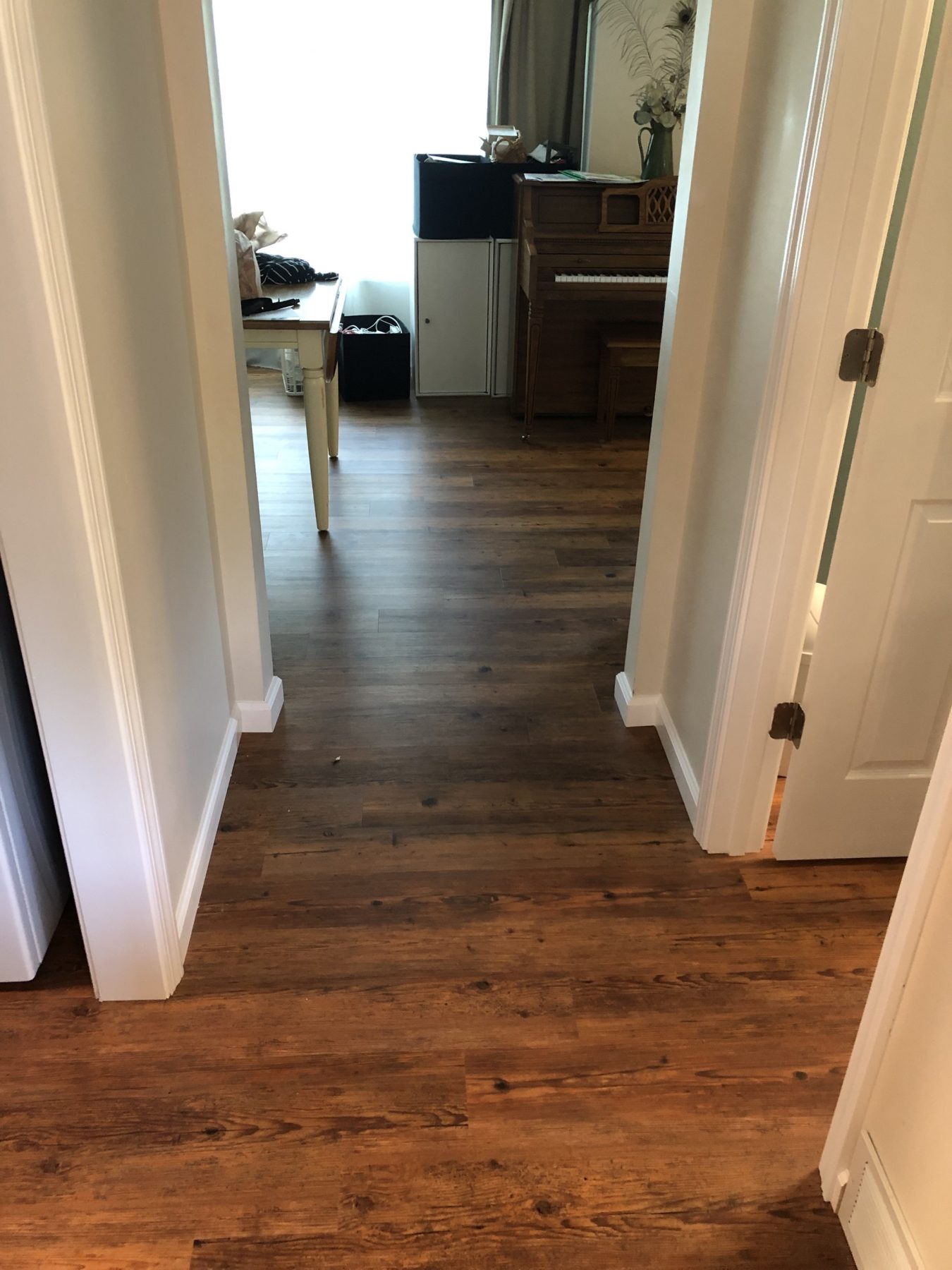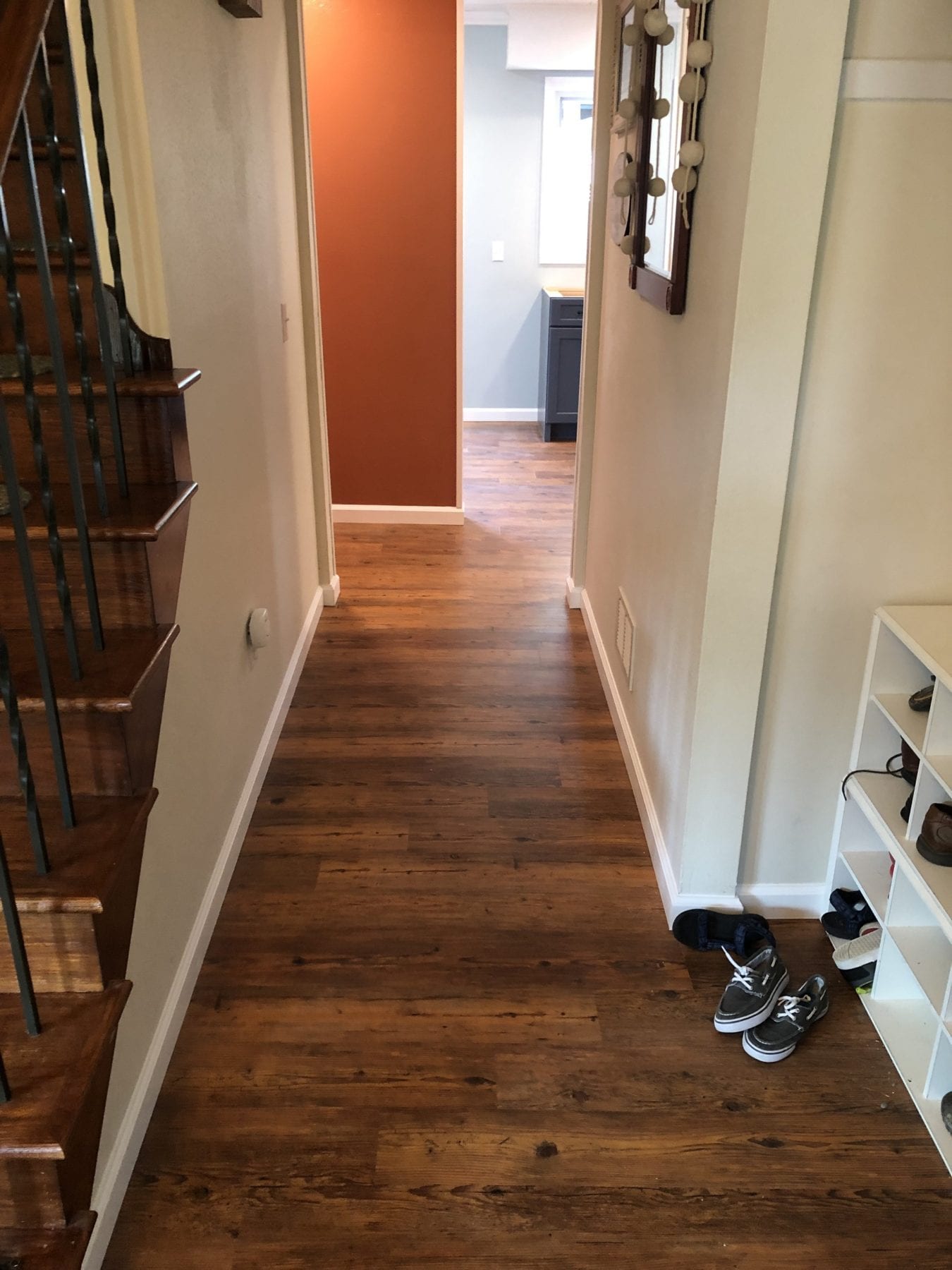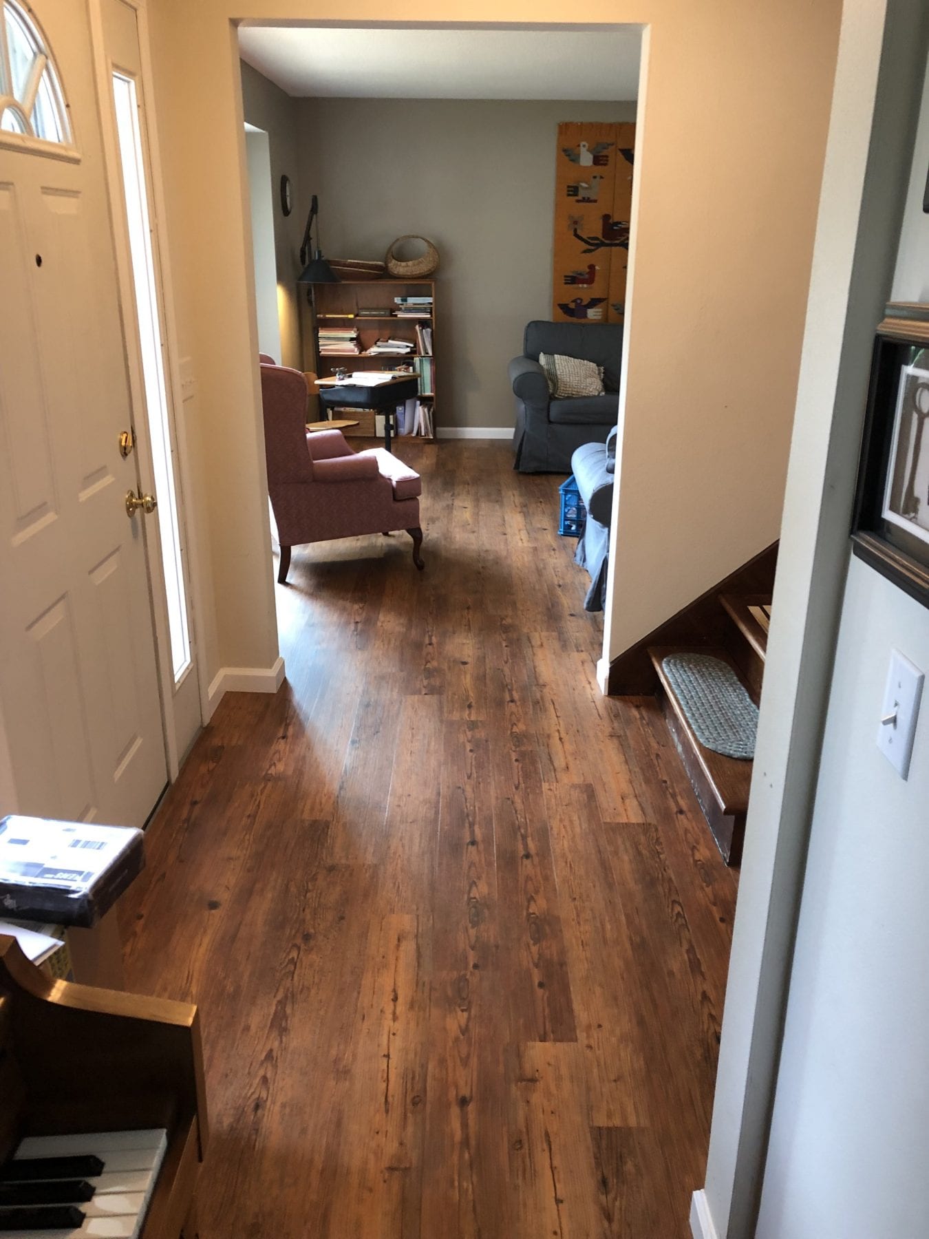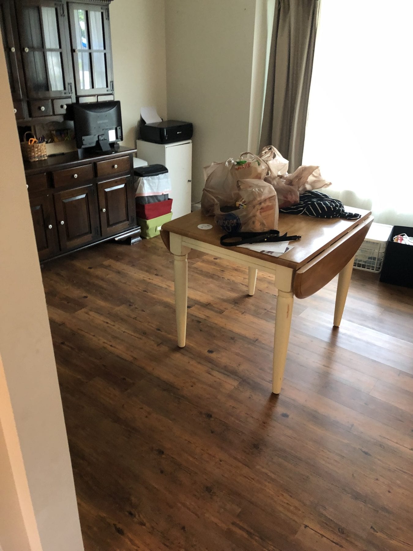 The fireplace already existed, and after weighing the cost of removing it, our clients decided to build around it as an accent piece. We installed new flooring throughout the entire first floor, which added to the feeling of an open, connected space. To add further character, our client opted to have a faux wood ceiling plank installed, which turned out perfectly! The space was started to come together. All that was left was the complete kitchen renovation.