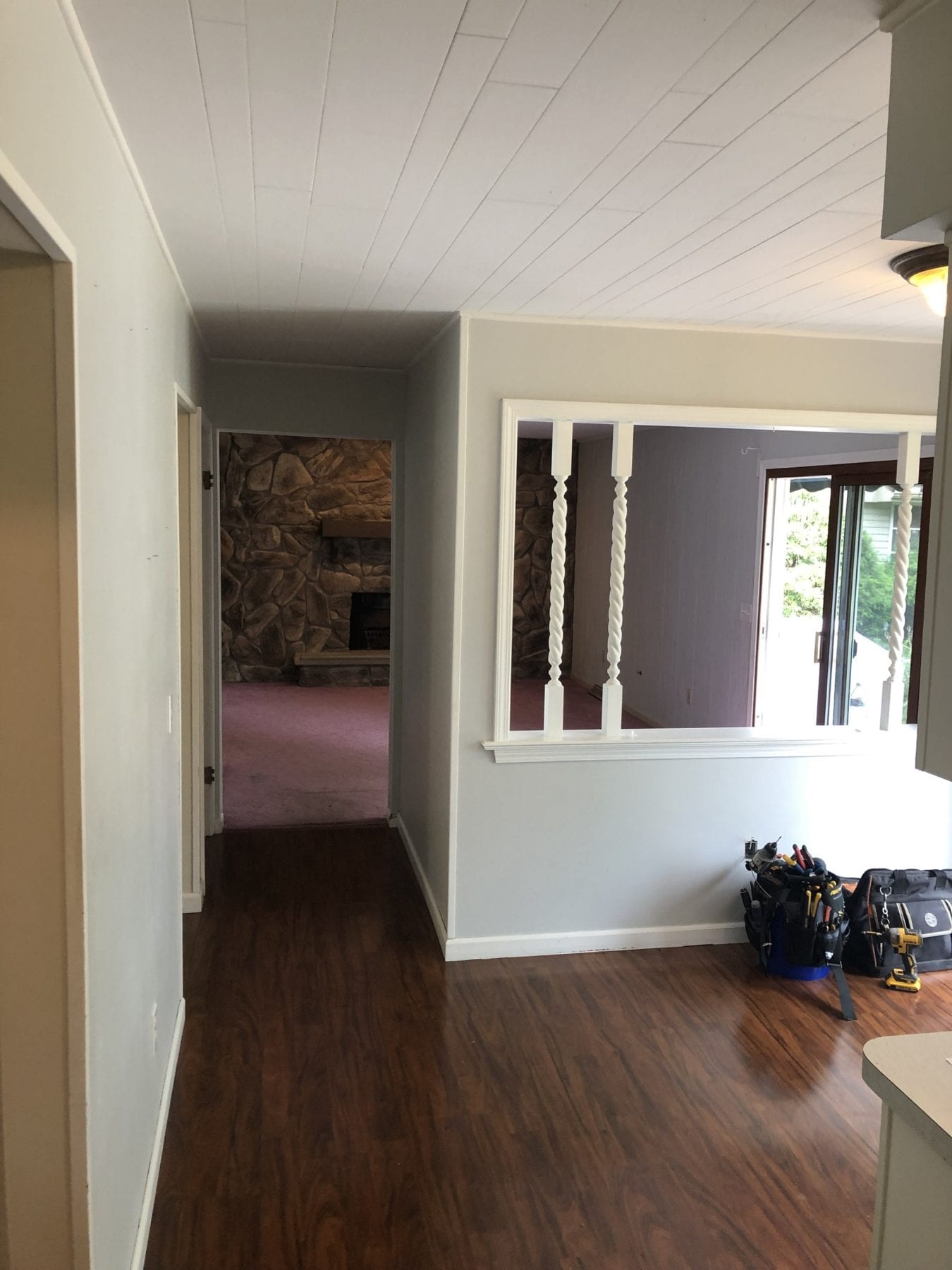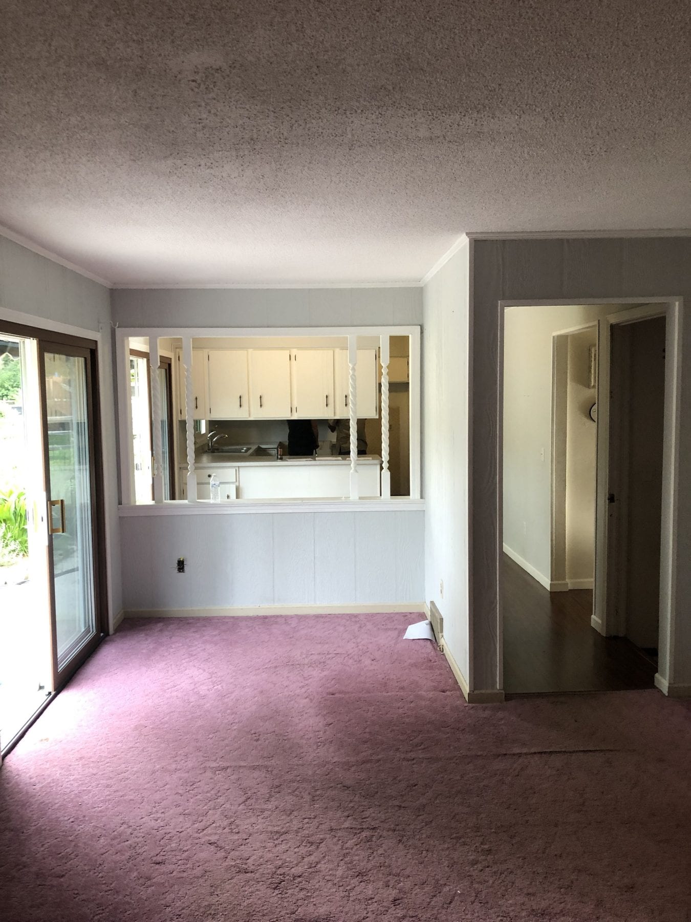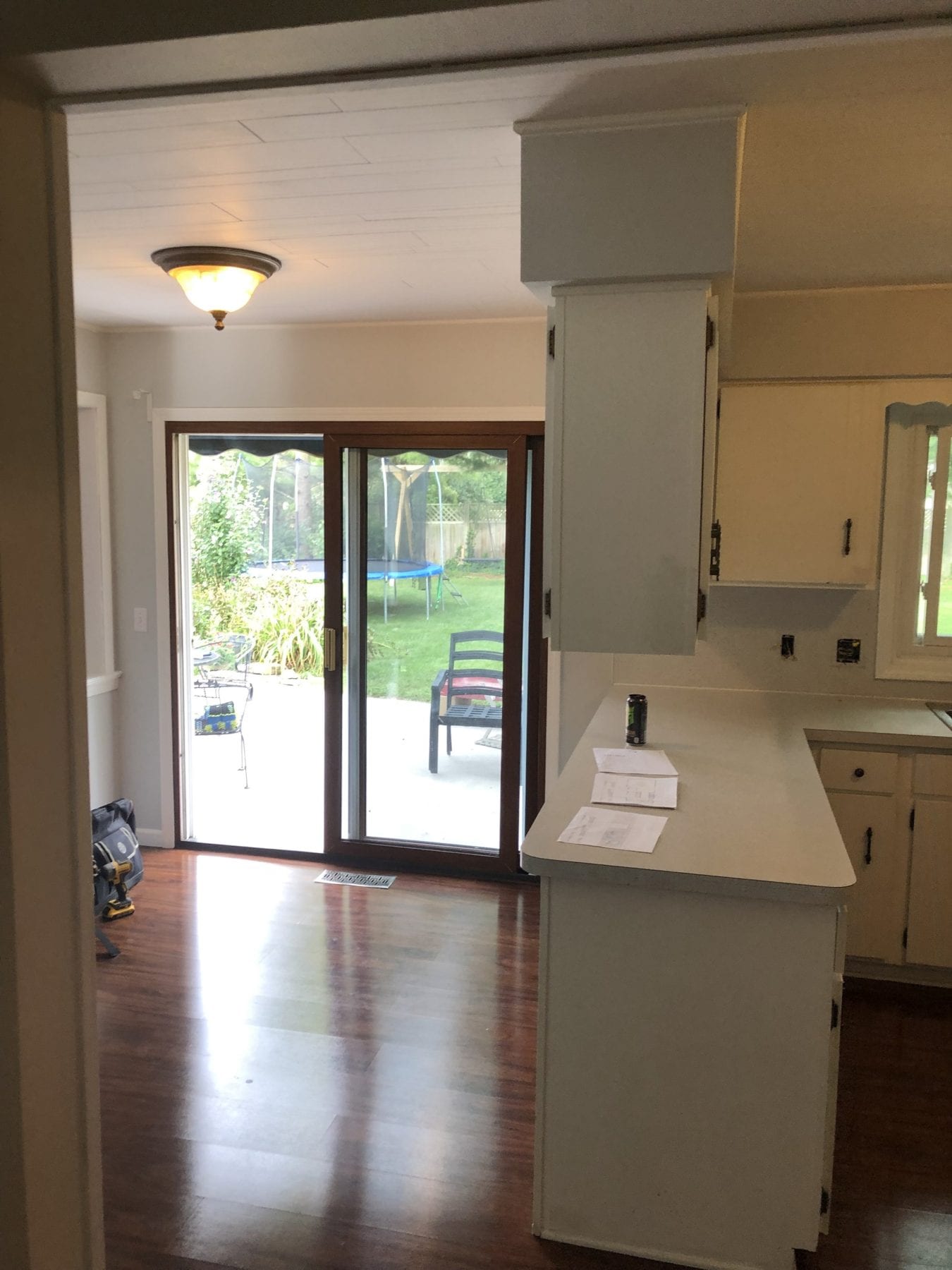 A complete kitchen renovation allows you to bring your dreams to life from the ground up! Projects of this sort range greatly in detail and design, so they provide an awesome challenge to tackle hand in hand with our client. This project started as a kitchen renovation, but quickly escalated into a renovation for the whole first floor of the home. Below are pictures of the layout before we starting swinging hammers. The wall with the look through opening gave the space a blocked in feeling. Paired with the peninsula, this chopped up space didn’t suit the needs of our client with their young children. Having 2 patio doors close to each other seemed rather redundant, so one of them had to go. Notice the inadequate lighting? Major update needed!