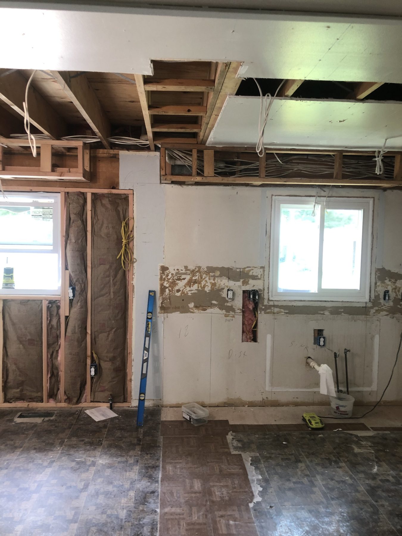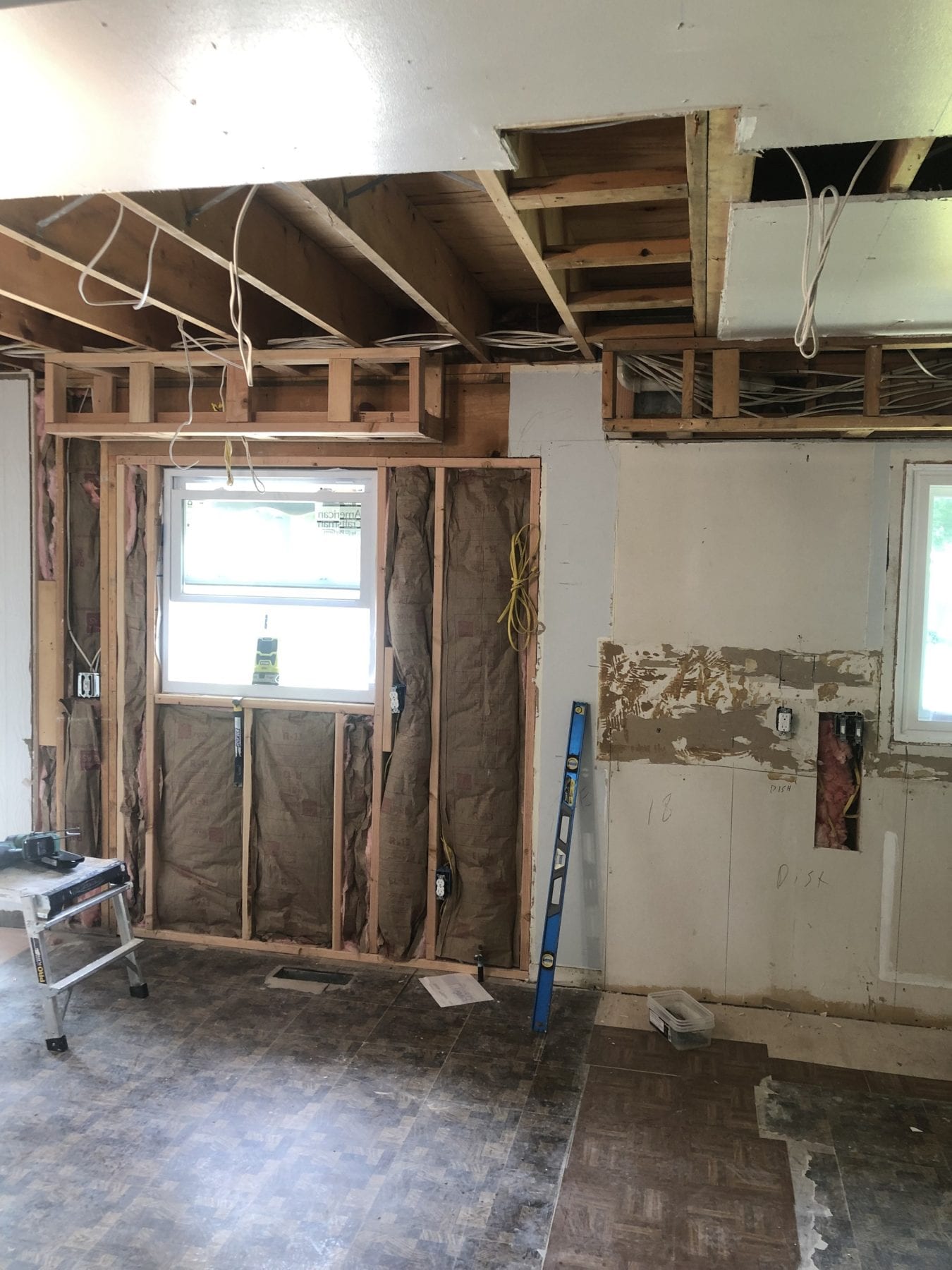 OPEN SPACE! We deleted the wall to create a free flow from the dining room to the kitchen. We remove the redundant patio door and framed in the opening for a new window. See the problem with the windows? We accidentally ordered a double hung window instead of a slider to match the existing window over the sink. This just shows that little problems arise from time to time, but we quickly ordered the correct one, which you will see in the finish pictures to follow. The soffits housed quite a bit of utilities, so we framed them in a way to make fit perfectly with the new space and the wall mounted range hood.
