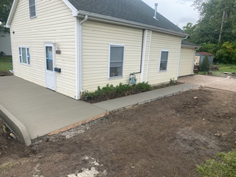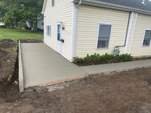 The patio turned out perfectly – now we had to turn our attention to the problem area. The grading around the home caused water issues, and we couldn’t grade it properly due to the proximity of the house to the street. With that obstacle in mind, we worked together to come up with an alternative plan. To circumvent the drainage issue, we poured an integrated taller curb with the front pad. We then installed a drainage tile along the back of the curb to divert the water away from the area. The last step was pouring a sidewalk to connect the two concrete pads. Our client loved the results! We helped solve the water area while also providing a beautiful patio to hang out on.