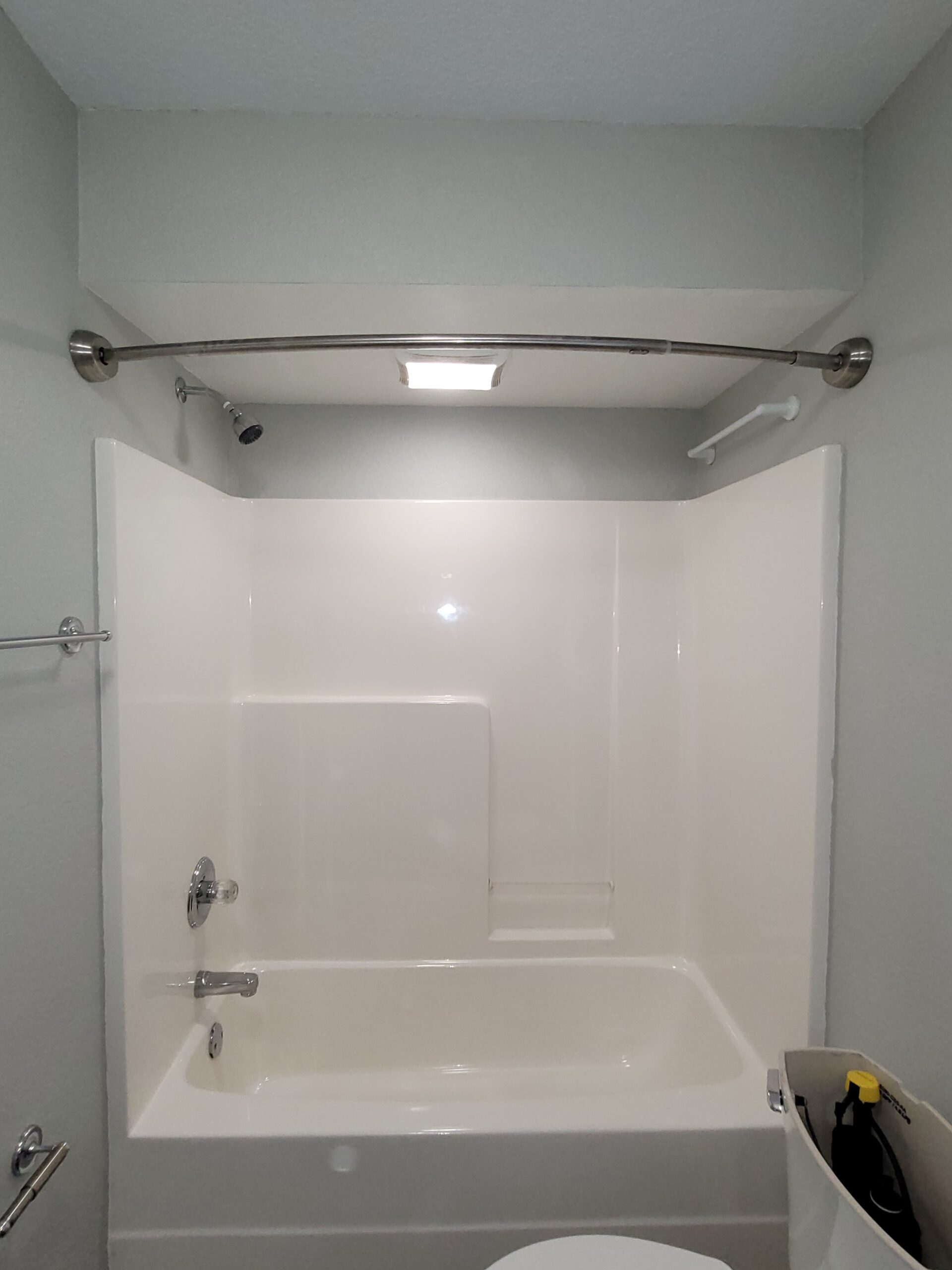 Hello, Everybody! A+ Home Improvements remains hot of the remodeling trail! Our latest client desired to convert a tub to a tiled shower. The existing master bathroom contained a builder grade one-piece tub and surround enclosure. The home owner had already updated a number of items in the bathroom, and this was next on the hit list. The client chose a color scheme they wanted to implement, and we helped with the product selection process. Now it was time to tear out the old unit and prep for the new tiled shower enclosure. Let’s see what we were dealing with: