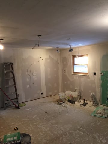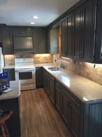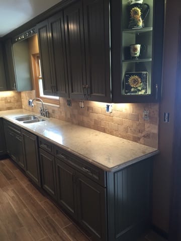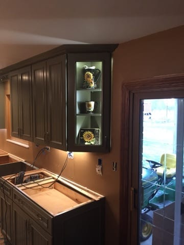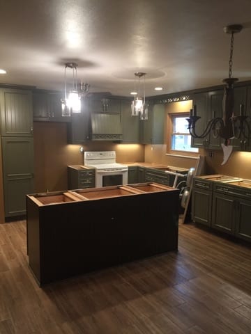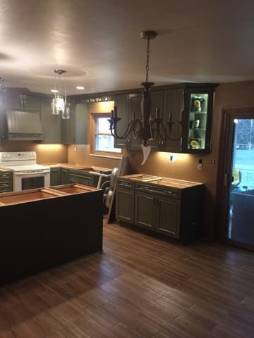 Not everyone wants a cutting edge, modern looking kitchen. This client wanted a country kitchen style, so that is exactly what we gave her! The green and earth toned fixtures and cabinets blended beautifully. The natural stone splash gives a warm feeling to the room. While they didn’t want a modern styled kitchen, we were able to integrate updates such as in-cabinet lighting to provide accents. These pictures show the room while we were finishing drywall, all the way up to finished install. What a difference!!! The cabinets, paired with the chosen flooring, made this kitchen stand out as one of our favorites.
