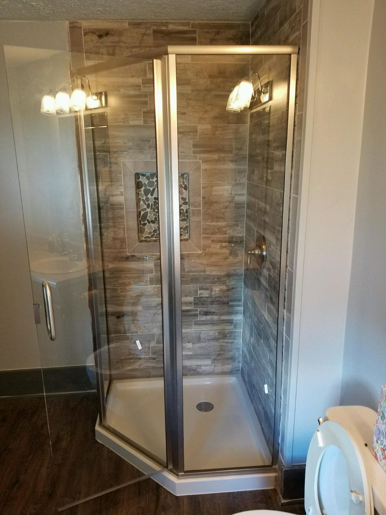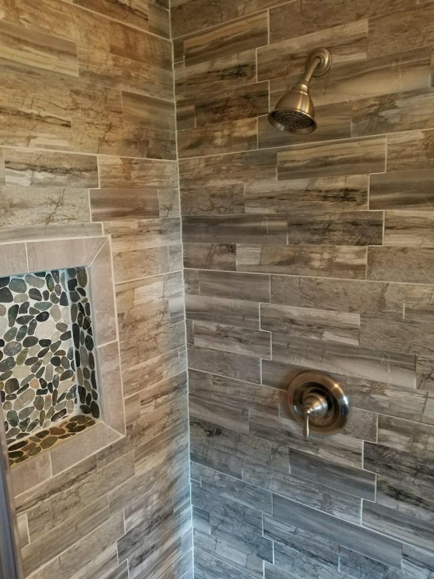 What a wreck! As you see from the pictures, the existing space left much to be desired. A custom tile shower jumps off the wall of any bathroom. We Paired a wood look tile with a recessed tiled niche, which resulted in a stunning space. Clean lines and elegant neo-angle glass enclosure helps resurrect a dead space! Envision taking a shower in the serenity of you new tile enclosure. You make the choices – we just help steer you in the right direction. Give us a call to turn your dream into a reality!
