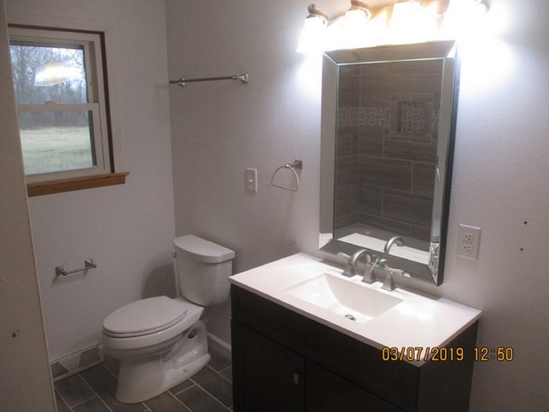 Our client didn’t stop with just doing the tub area. We installed new tile flooring to coordinate with the tile in the surround. We also installed a new vanity, vibrant mirror, lighting, toilet and fixtures. Our client chose the perfect items to make their new bathroom perfect! The results were great, and we were thrilled to be afforded the opportunity to help with the renovation.