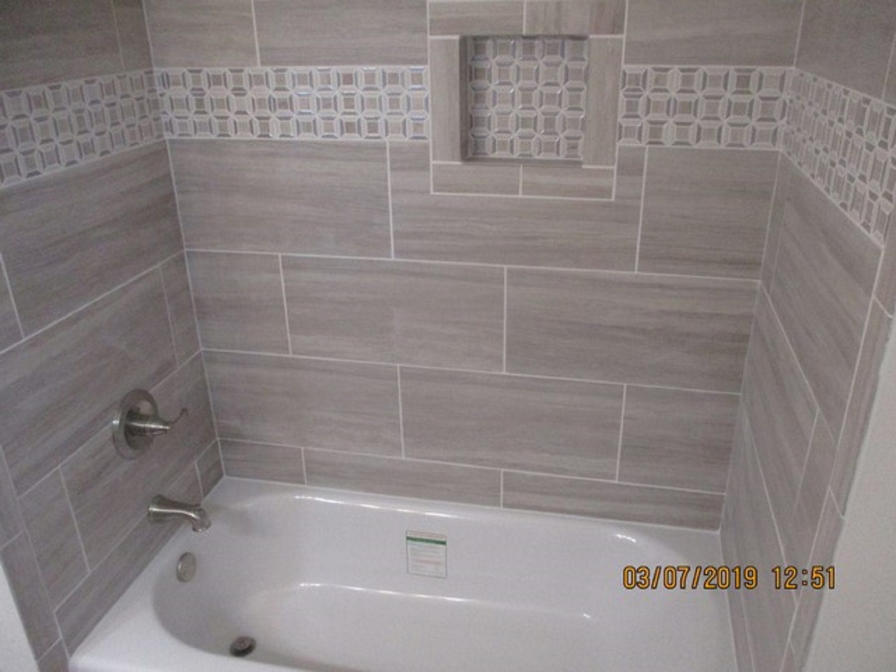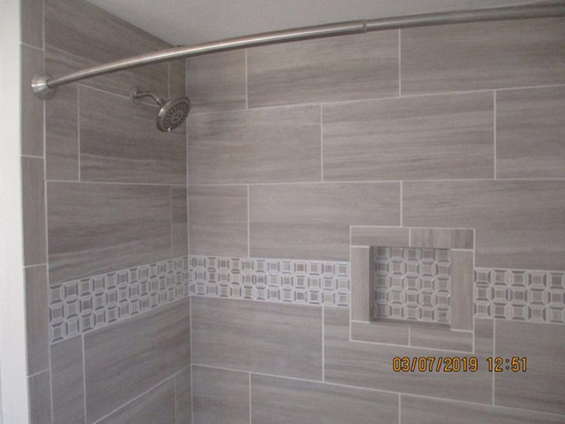 A custom tile surround stands out in any bathroom. Limitless layout options exist due to the vast amount of tile options out there. Our client opted to install a tile ribbon, as well as installing the accent tile in the rear of the niche. The colors mesh perfectly and deliver a stunning appearance. When choosing a tile, however, it is important to watch for the water absorption rate. While some tile may look fantastic, it may not be rated to withstand the water of a shower surround. We take the headache out of this selection process by helping direct our clients to the proper tile. A beautiful tile surround sounds great, but only if it is going to last the test of time.