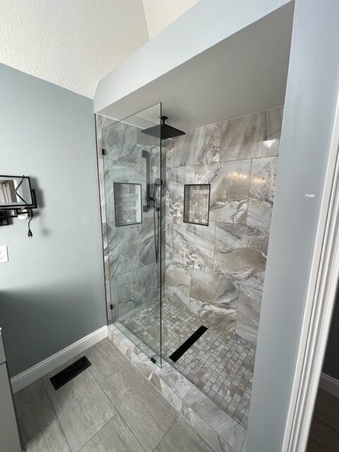 Welcome back to anther A+ Home Improvements’ project! We are gearing up for the holiday season, and client’s are scrambling to tackle their projects before guests arrive. Our next project entailed converting a master bathroom into an oasis for our clients to enjoy. The focal point of this bathroom, however, centered around the shower enclosure. Our client desired a large custom tiled shower. We worked with them on product selection to ensure a smooth renovation, and geared up to deliver their dream space. The location we had to work with provided ample space for a large shower enclosure. Our client wanted a larger format tile for the surround, accented by smaller tile for the shower pan and niches. Let’s see how it turned out: