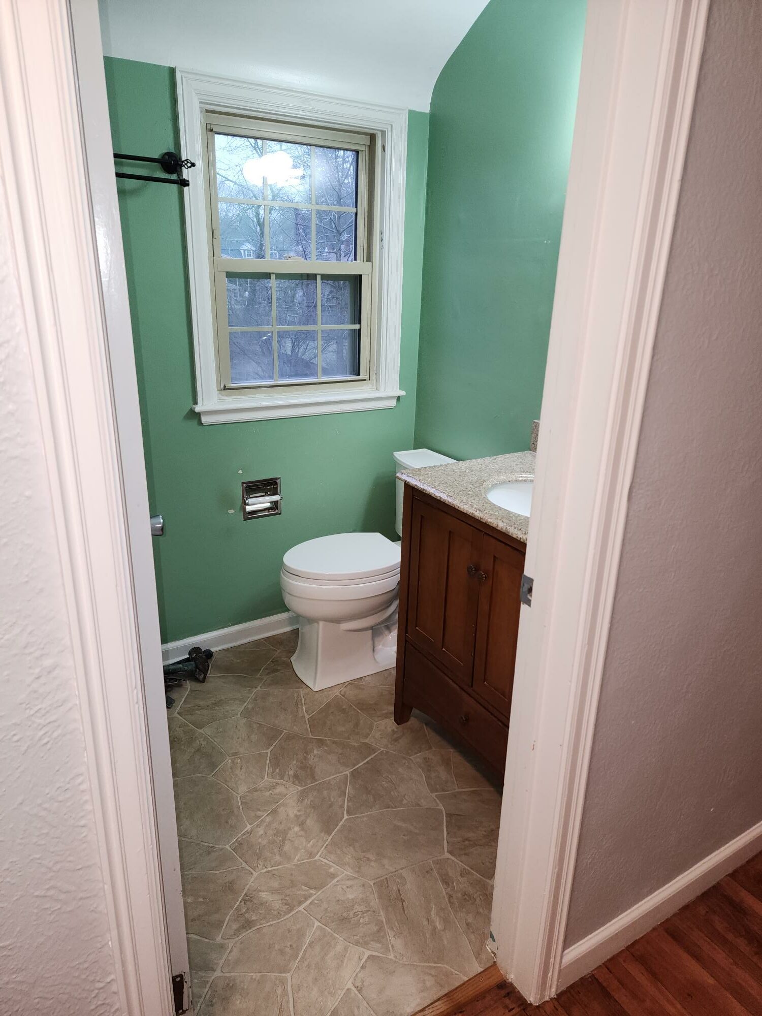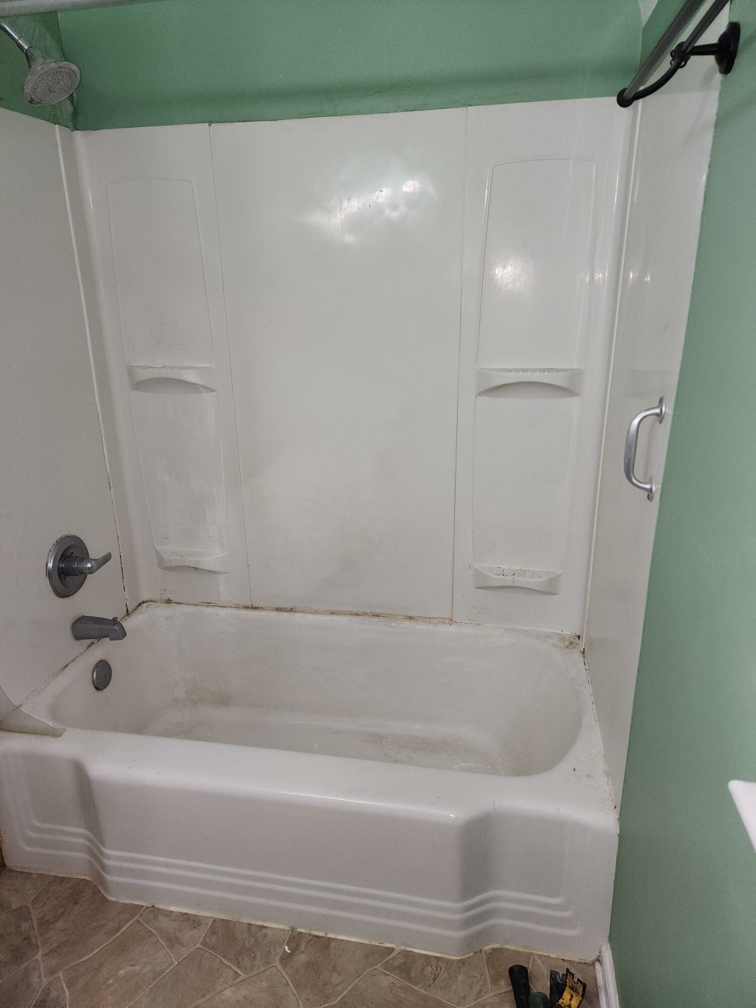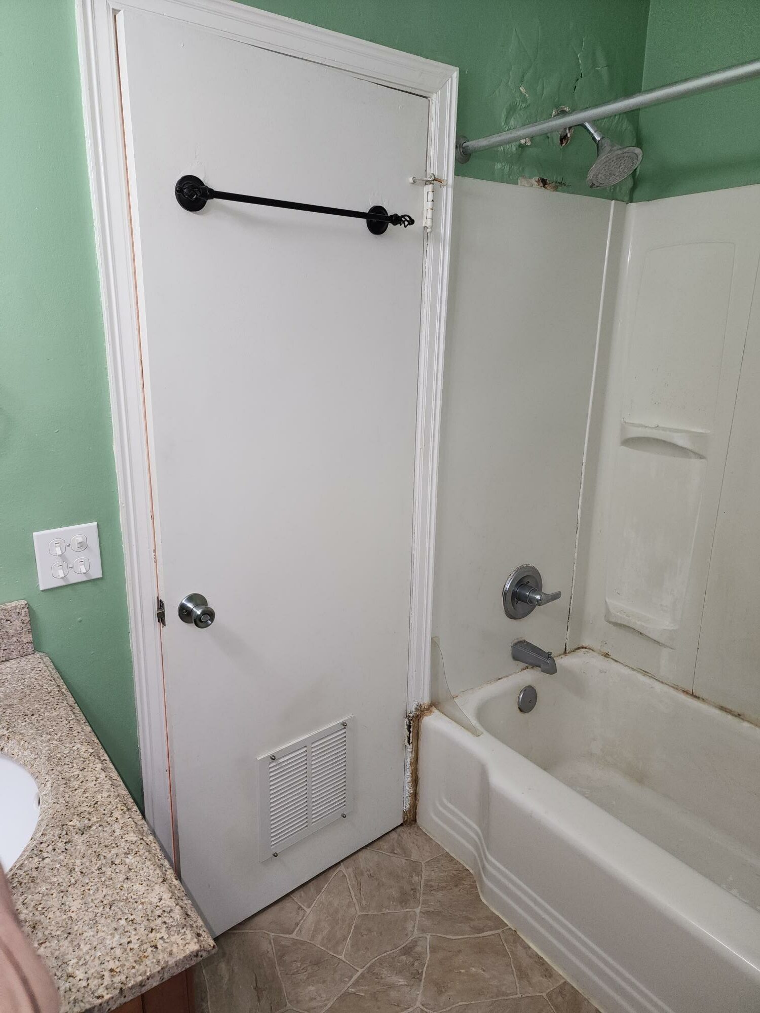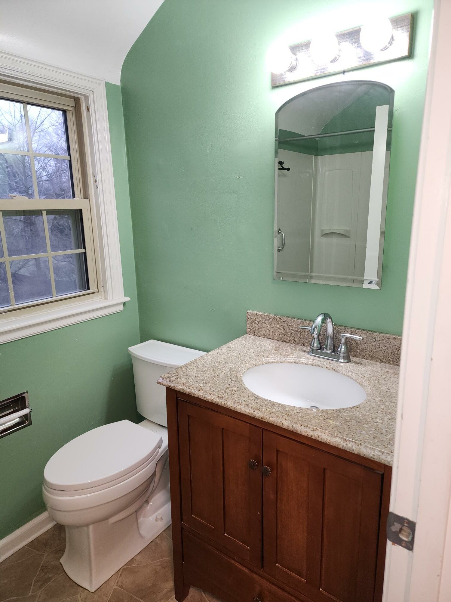 Hello, Everybody! Welcome back to another A+ Home Improvements’ project!! The next project up on the docket entails renovating a cute little bathroom. While functional, this bathroom needed an overhaul. Our client desired to rip out the old flooring and fixtures and replace them with a modern, subway tile shower paired with a spectacular penny tile floor. Smaller bathrooms often limit the scope of ideas that can be incorporated into the plans. However, a small bathroom space shouldn’t limit your ability to infuse your own personal flair and style into it. Other than being dated, the existing bathroom served the needs of our client. With this in mind, we helped the homeowner select products to update and modernize the space. Let’s see what we started with: