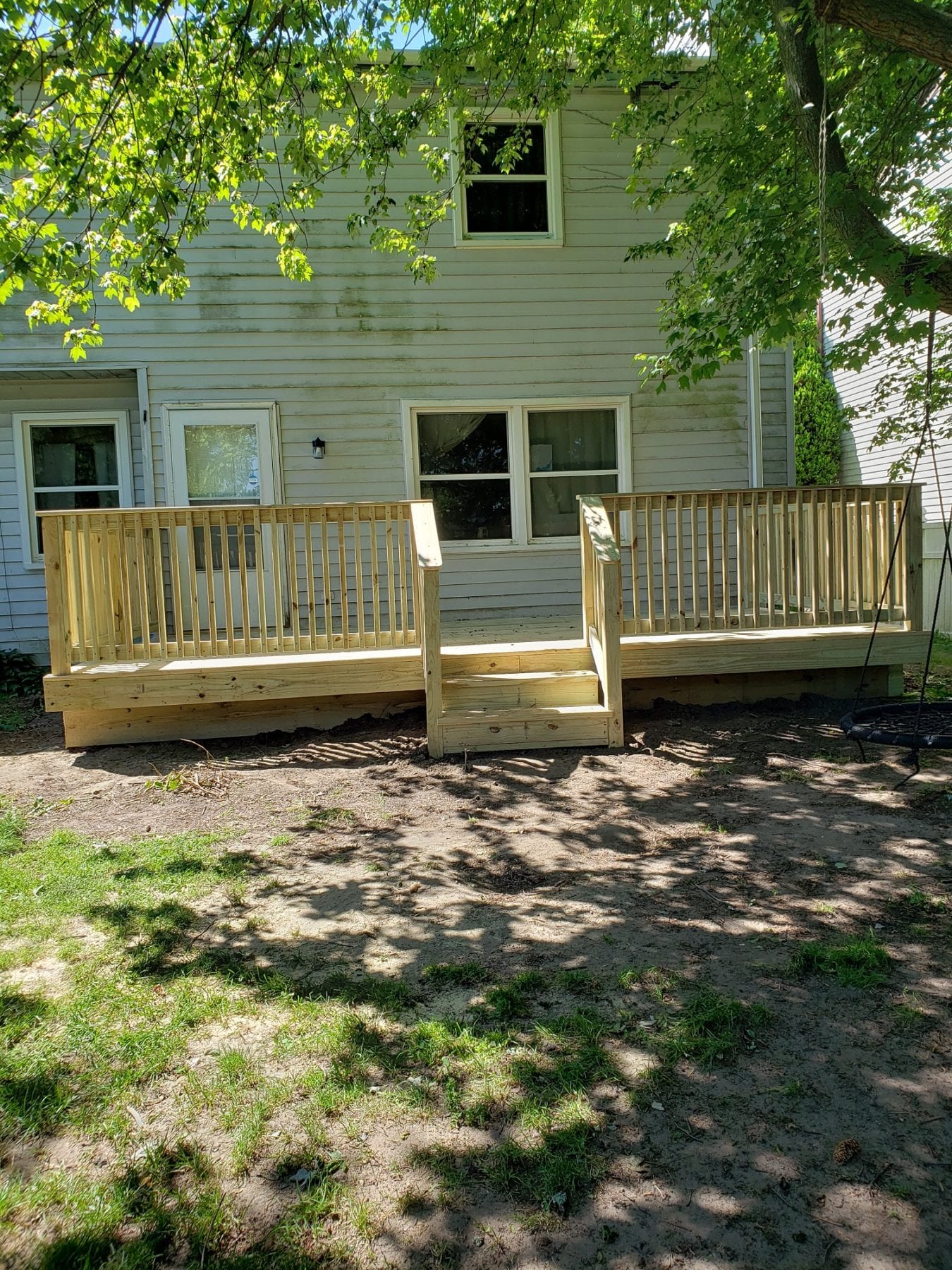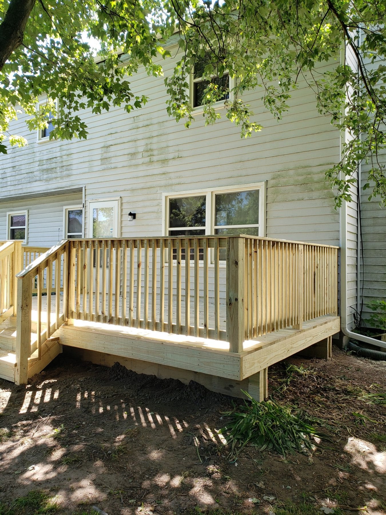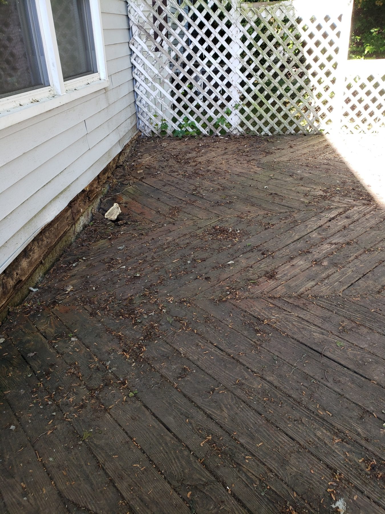 We love building decks, but a complete deck renovation was needed in this instance. While the deck definitely showed signs of wear and tear, the water damage at the rim joist and sill plate were not as obvious. That is, until the deck fell away from the house due to the rot. We removed the old deck and replaced the rim joist and sill plate. Once we sealed up the exterior of the home, it was time to build the new deck.