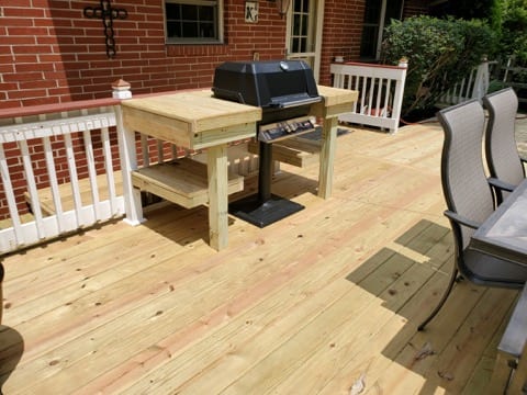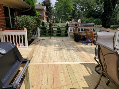 Basically looks like a whole new deck, right? We replaced the deck boards at the lid and skirting of the deck, and replaced the benches and built in tables around the grill area. As previously mentioned, the handrails remained untouched. Working on a large deck like this can be a tedious job, but the results are well worth the effort. When you walk out the back door and see a dilapidated deck, it can feel depressing. Fast forward to the end of the project, and you can’t help but smile with pride while looking at your new space.