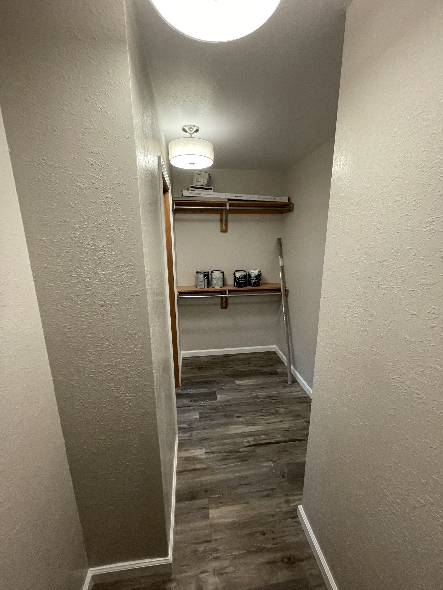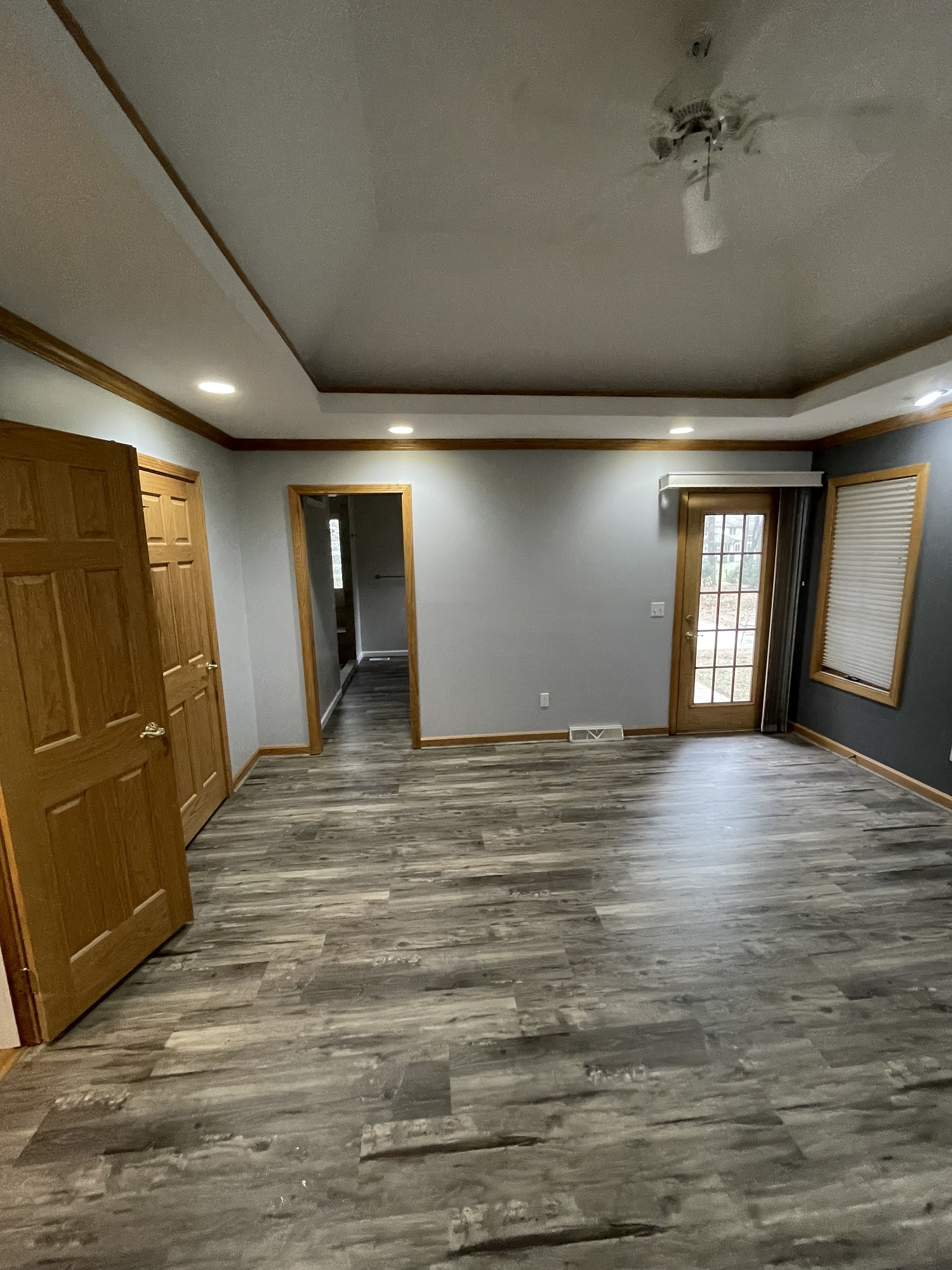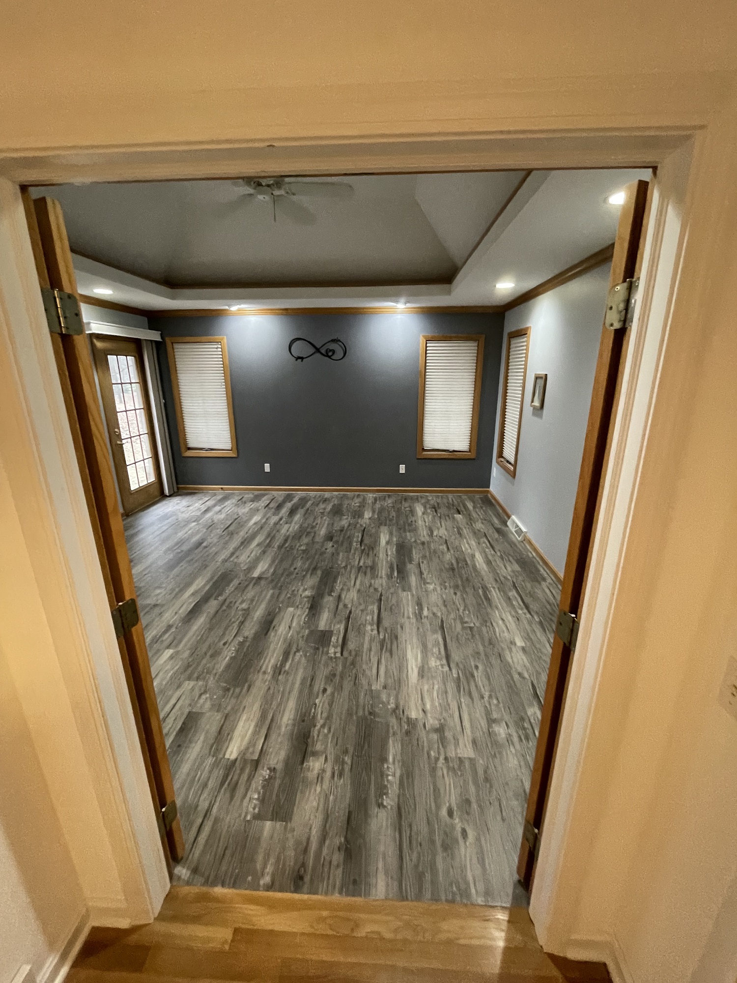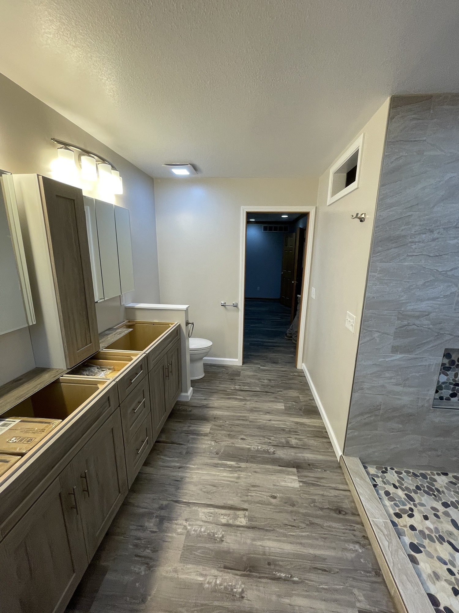 Our client liked the idea of continuing water proof vinyl plank flooring from the bathroom through their master bedroom as well.