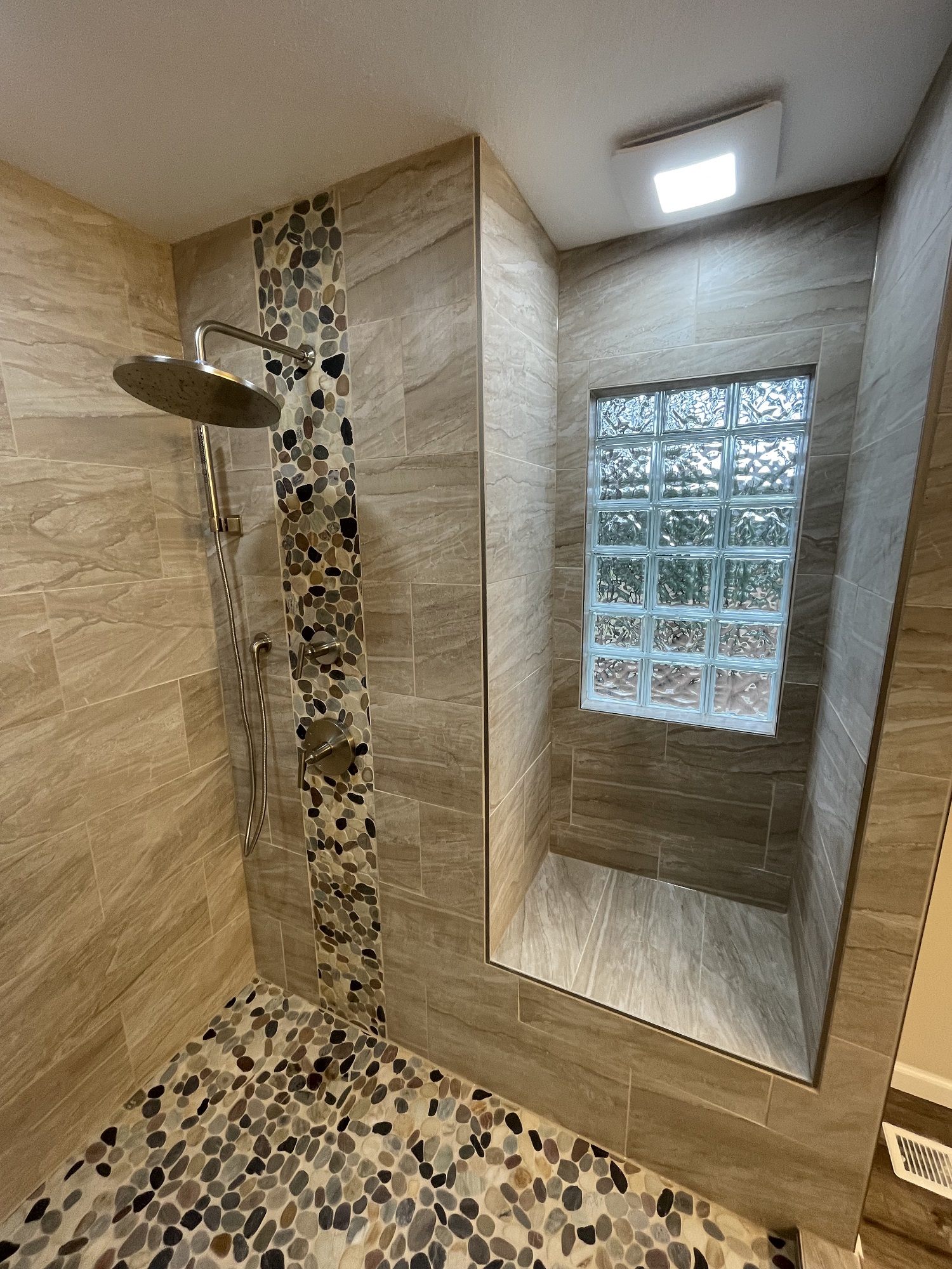 While the shower size was adequate for the typical home owner, it simply was not what our client wanted. We replace the window with glass block and moved the toilet out of the room. Then we proceeded to install 2 separate shower faucets with diverter valves and slide bar mounted hand-held shower wands. We totally transformed the space: