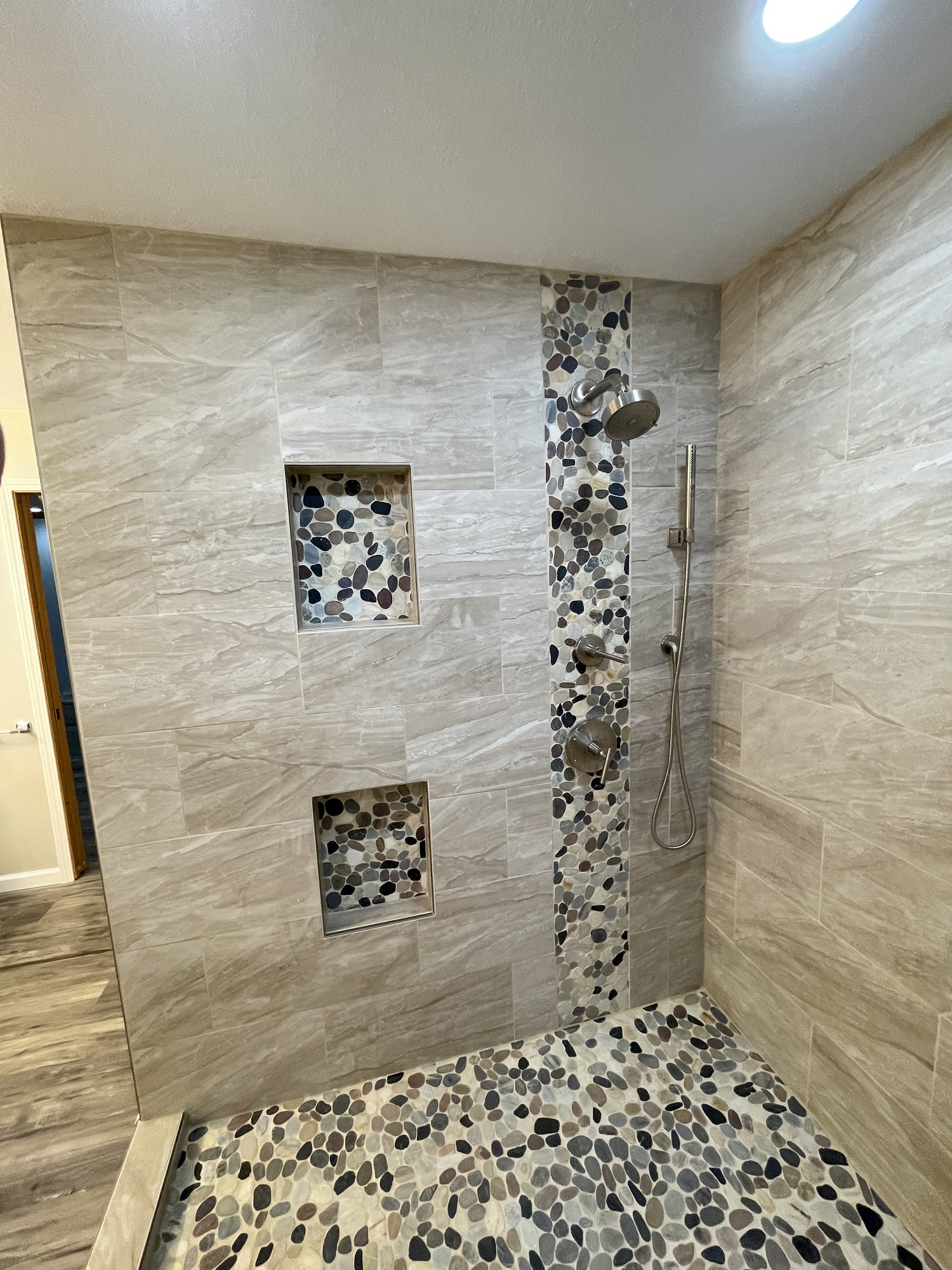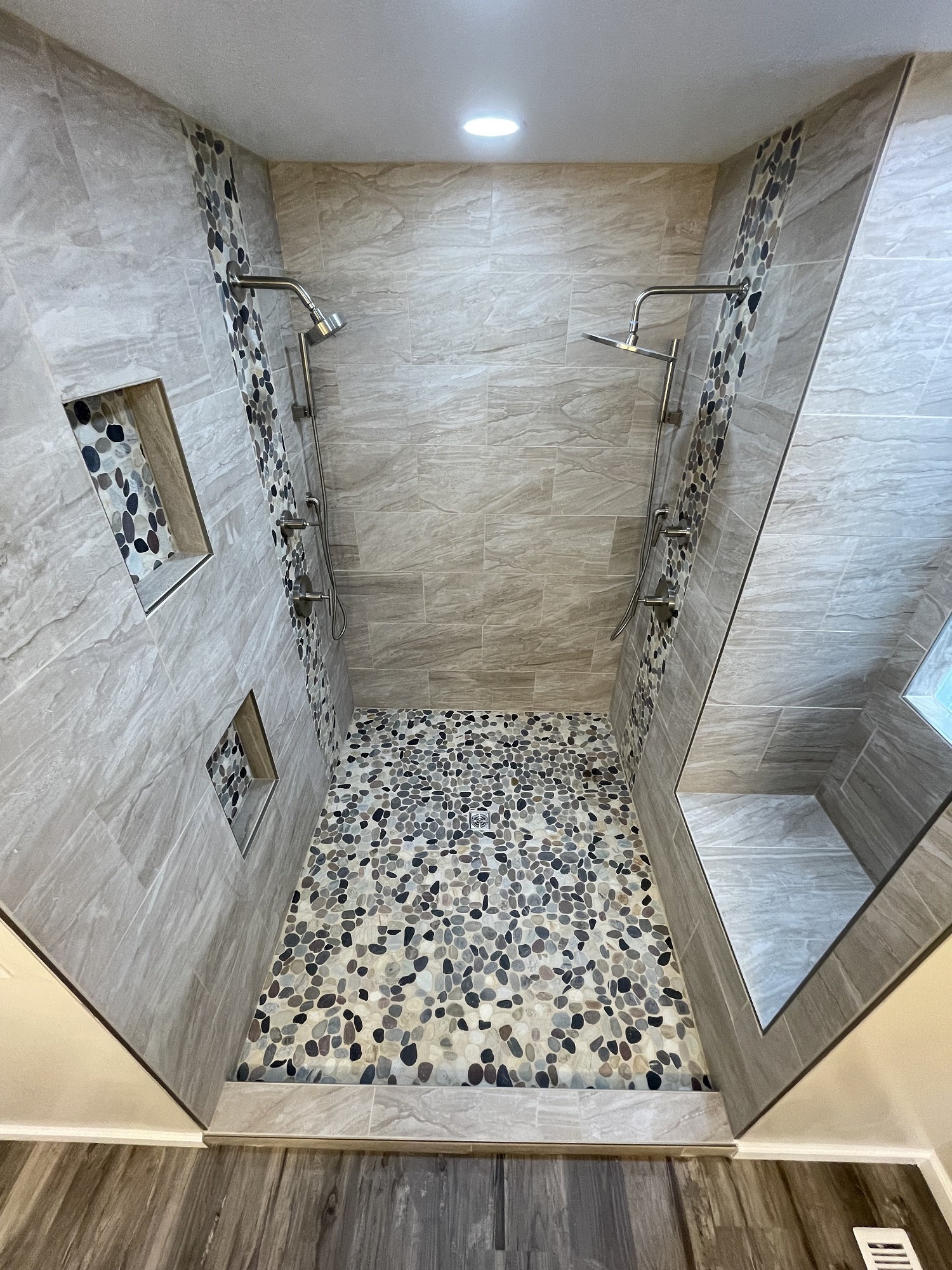 No this is a party shower! The tile our client selected paired perfectly, and provided an eye-popping tiled shower enclosure.