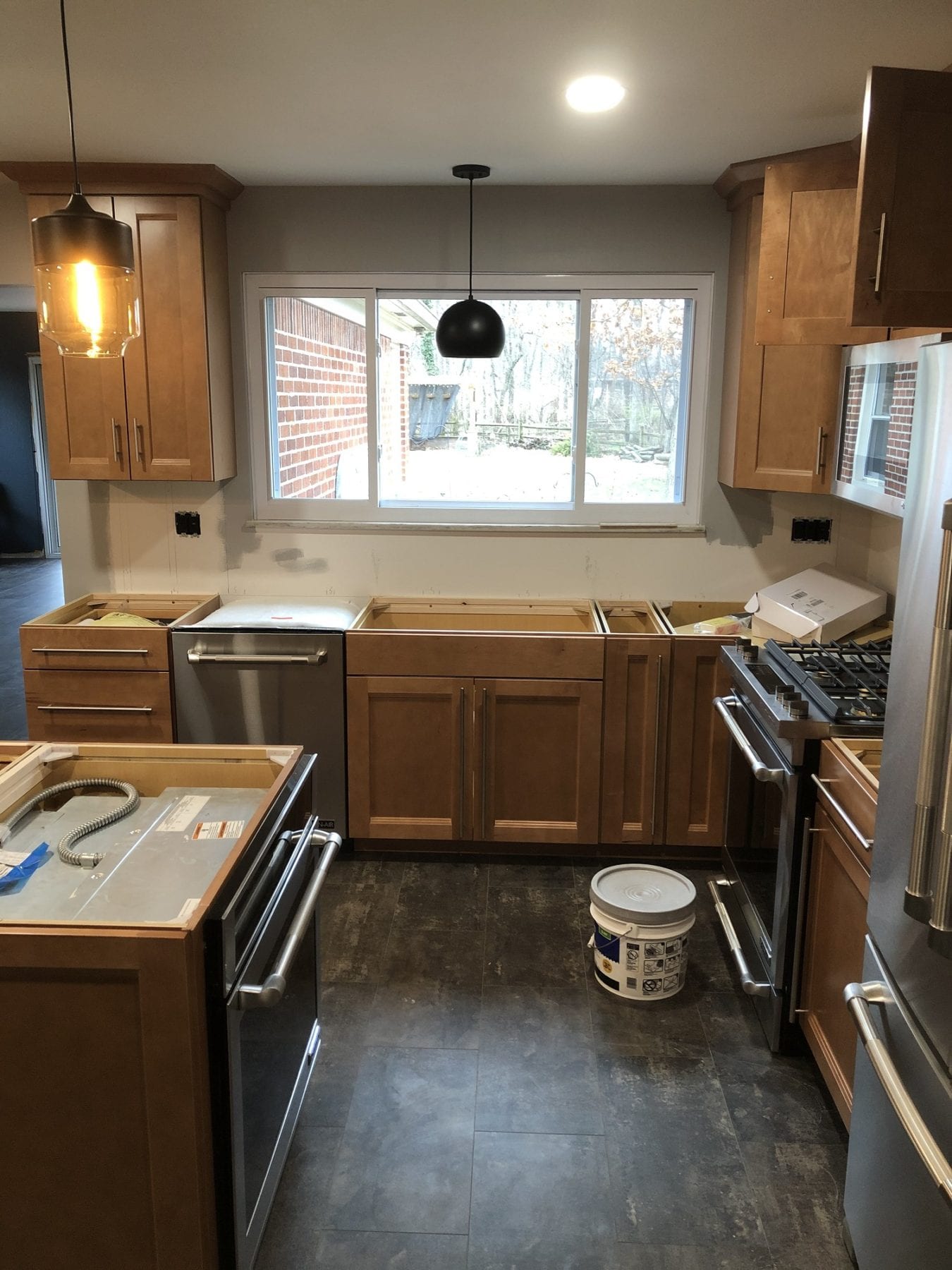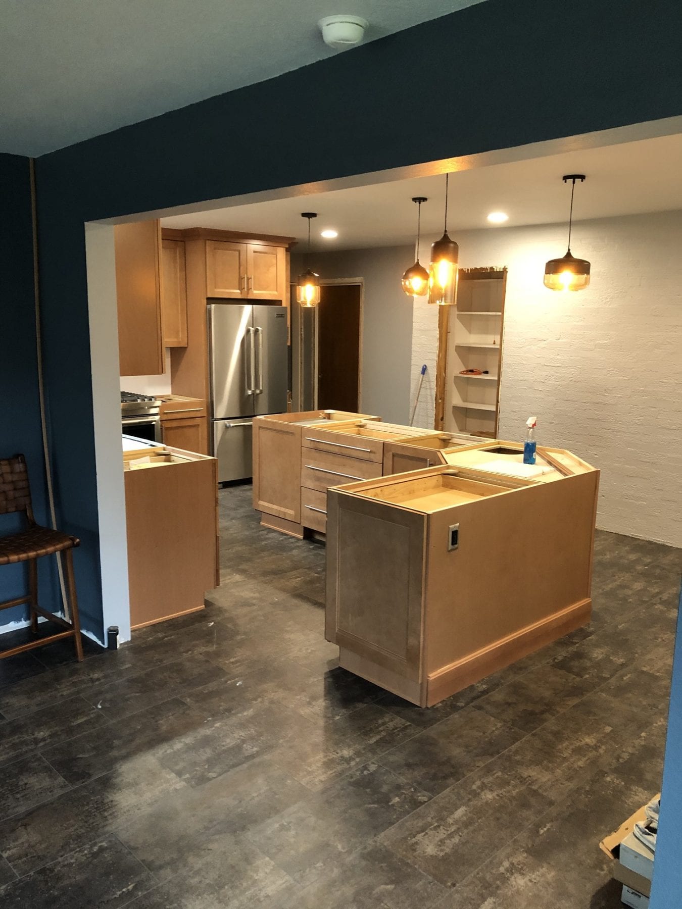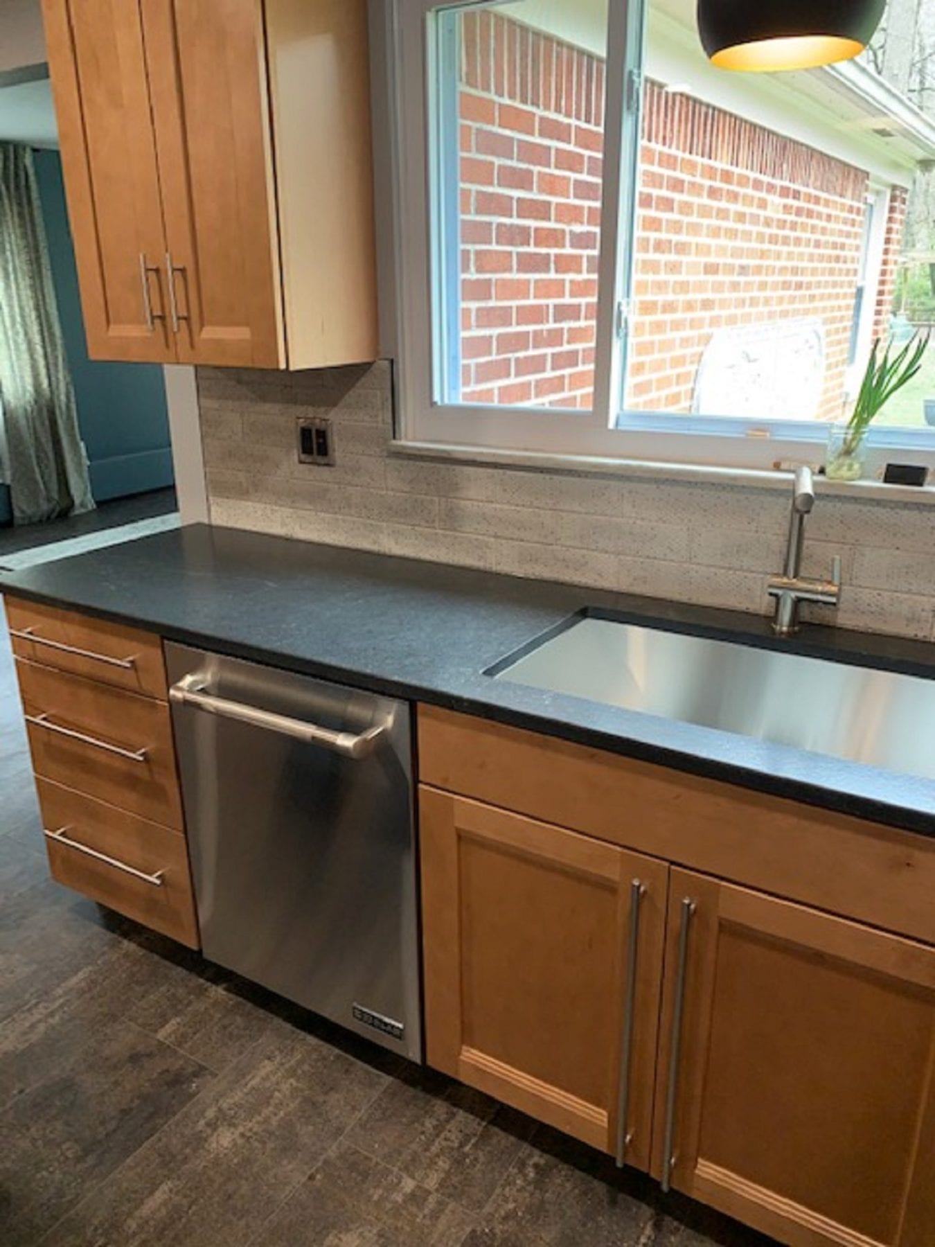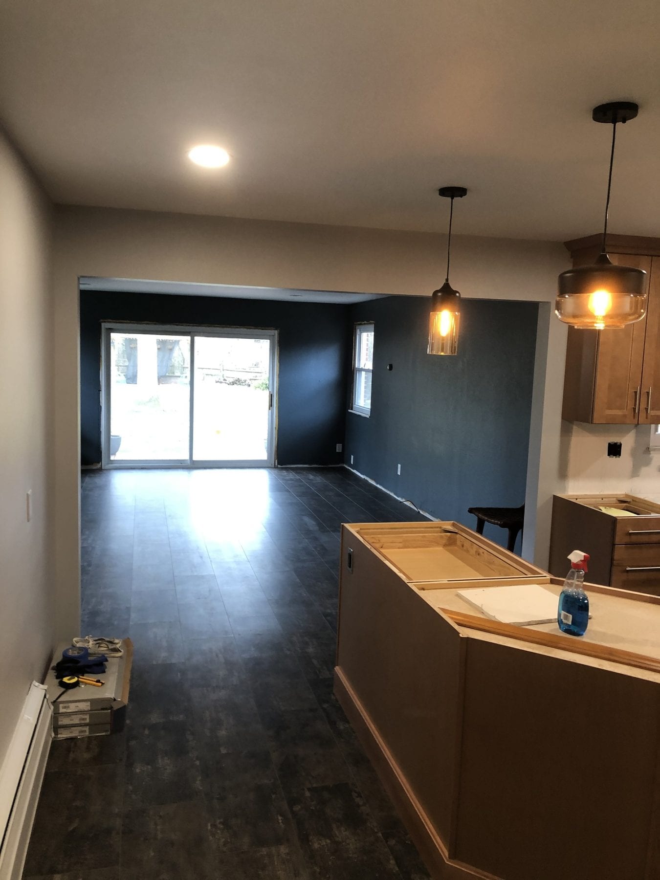 Other facets of this project included deleting the old soffits and replacing the window over the sink. With the soffit and peninsula gone, the whole look of the kitchen changed dramatically. The vinyl plank flooring paired perfectly with the cabinets, and the back splash provided the perfect accent for the new space. The lighting fixtures that our client chose definitely added the finishing touches. We thoroughly enjoyed this project, and were ecstatic that our client loved the results!