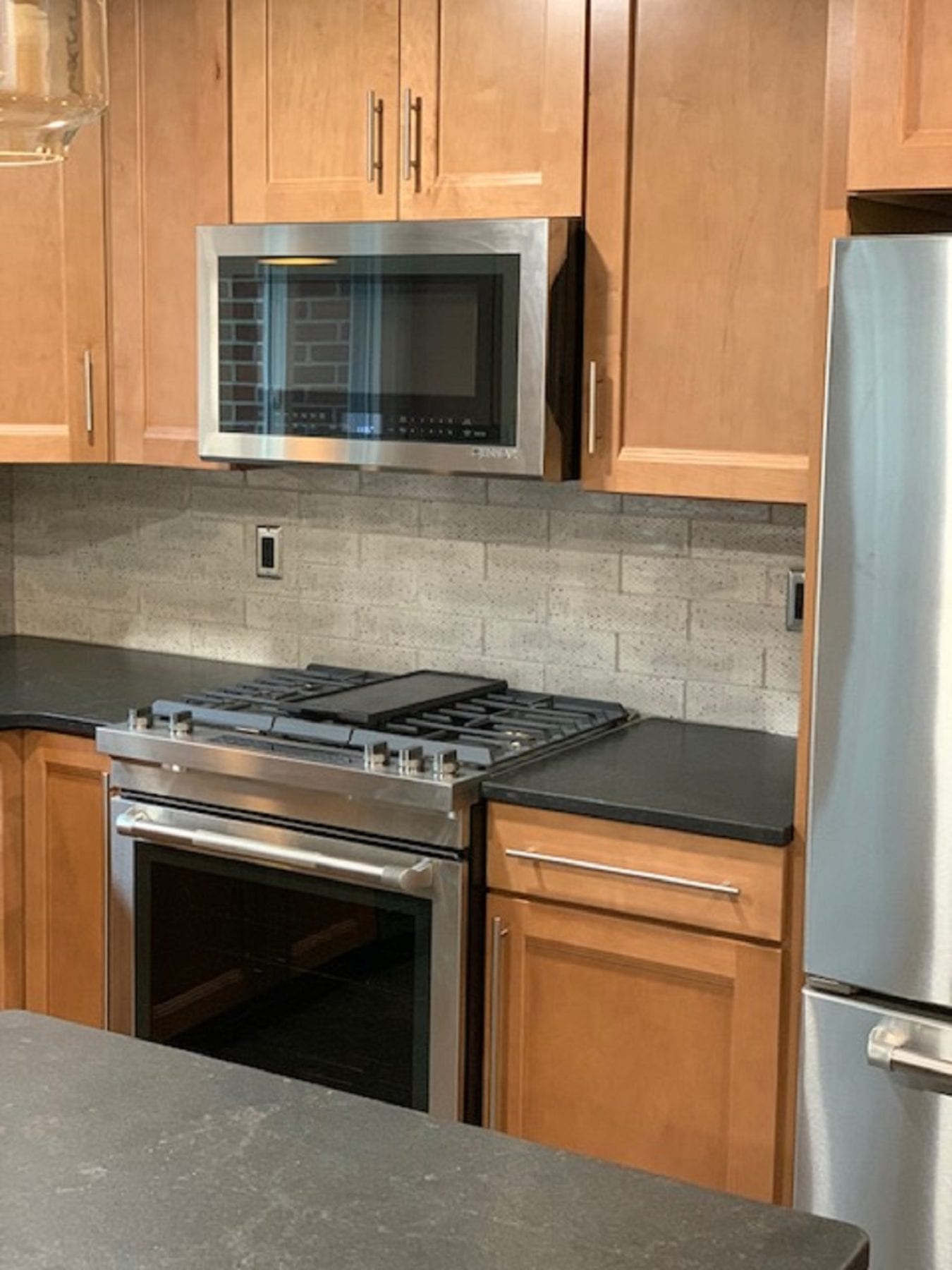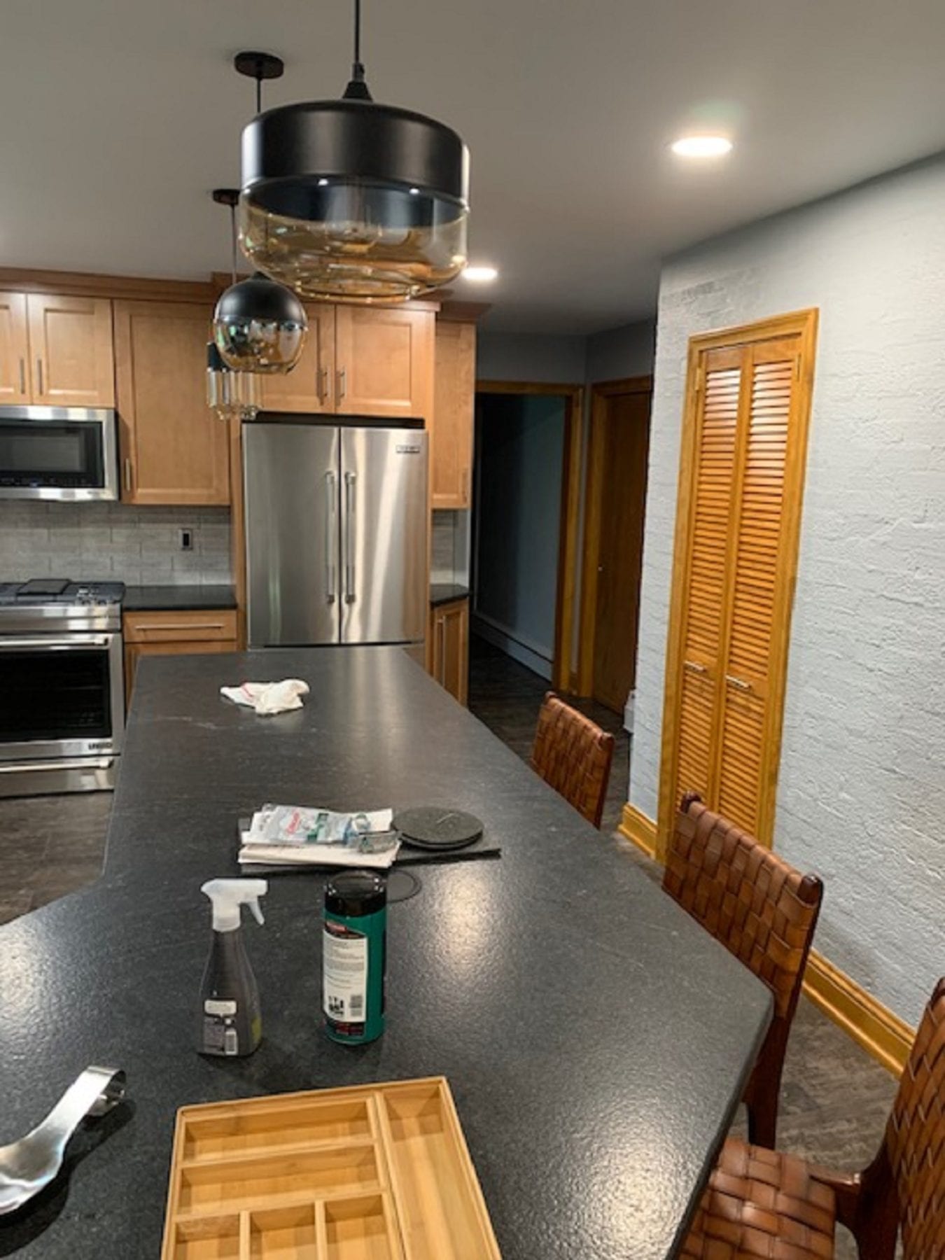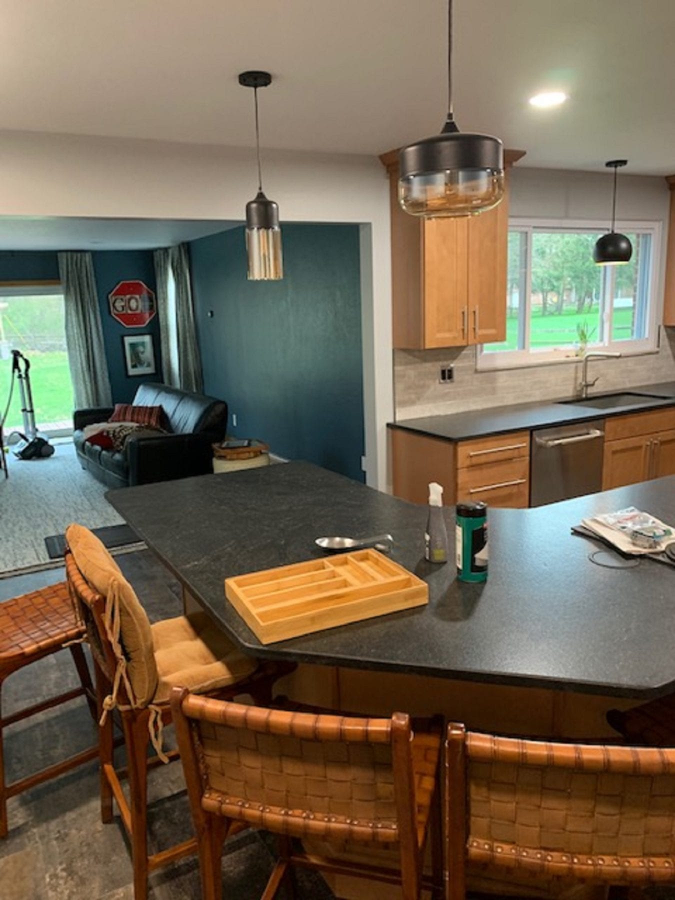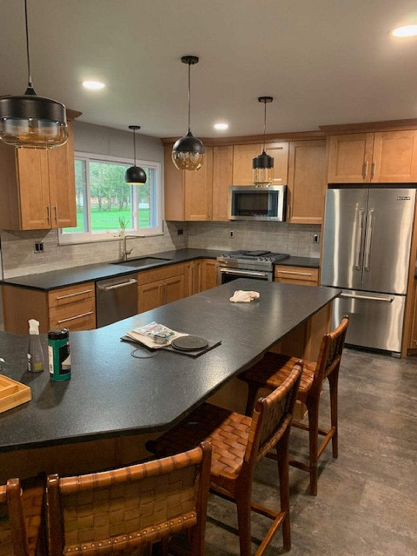 Other facets of this project included deleting the old soffits and replacing the window over the sink. With the soffit and peninsula gone, the whole look of the kitchen changed dramatically. The vinyl plank flooring paired perfectly with the cabinets, and the back splash provided the perfect accent for the new space. The lighting fixtures that our client chose definitely added the finishing touches. We thoroughly enjoyed this project, and were ecstatic that our client loved the results!