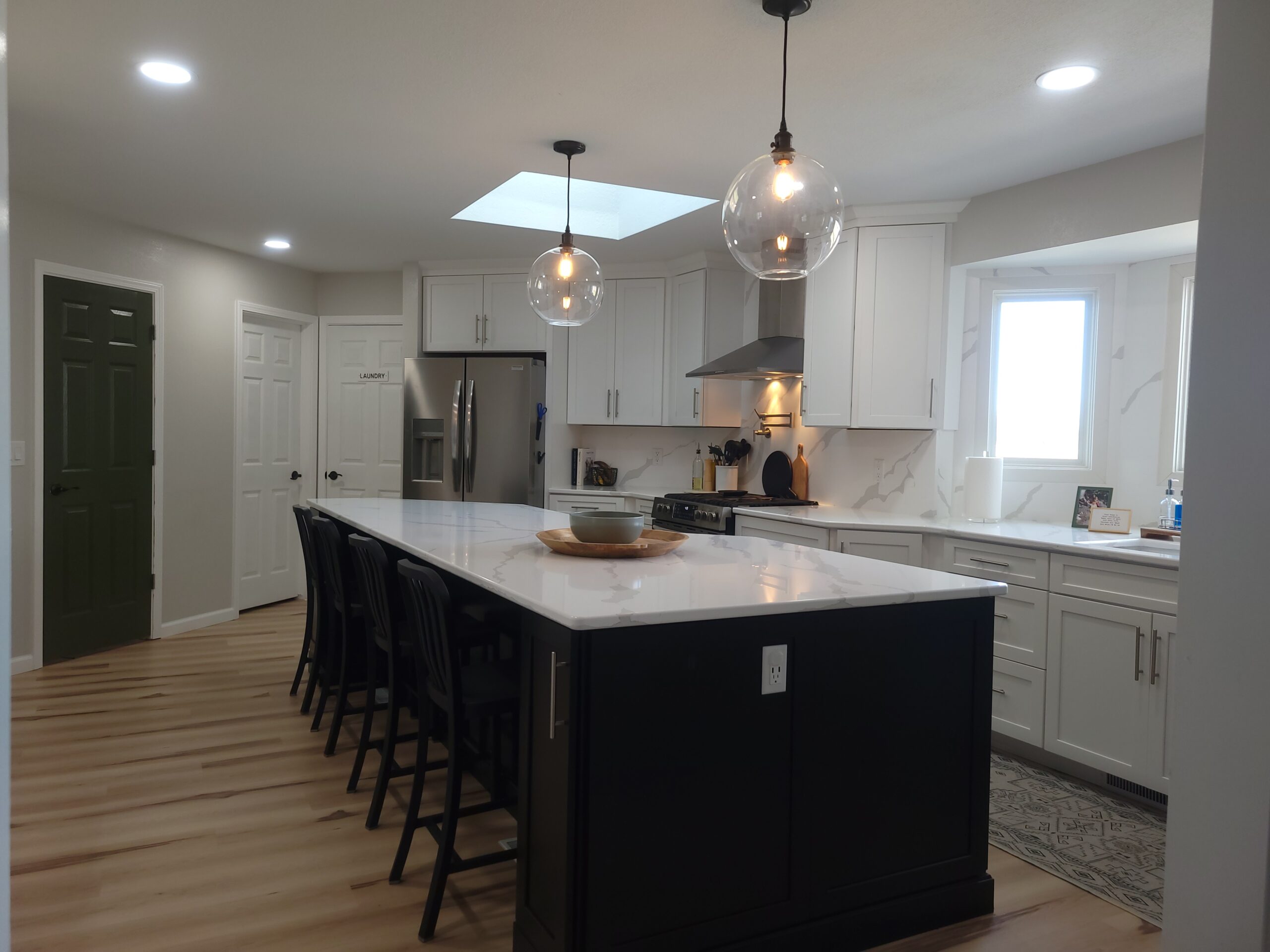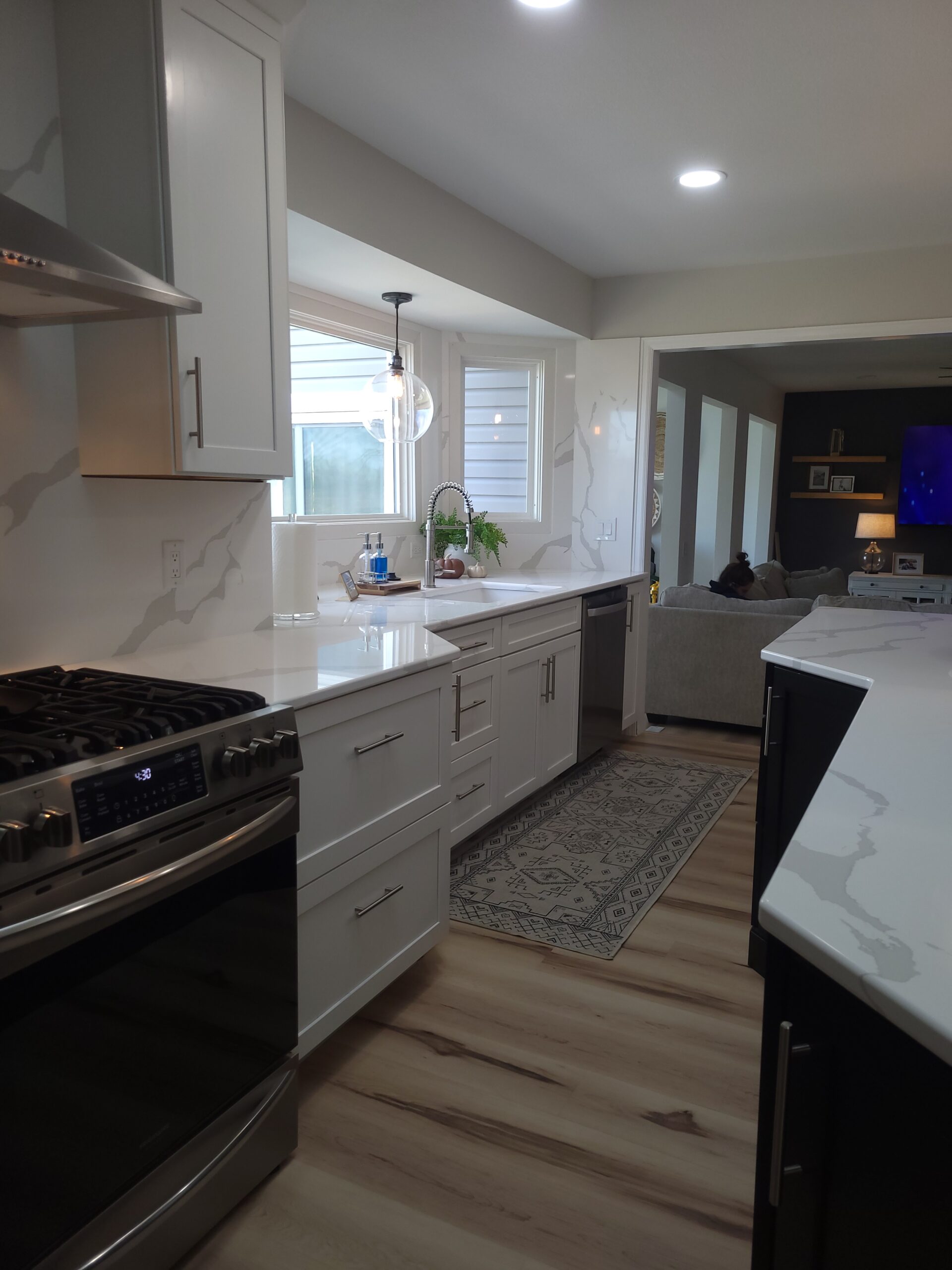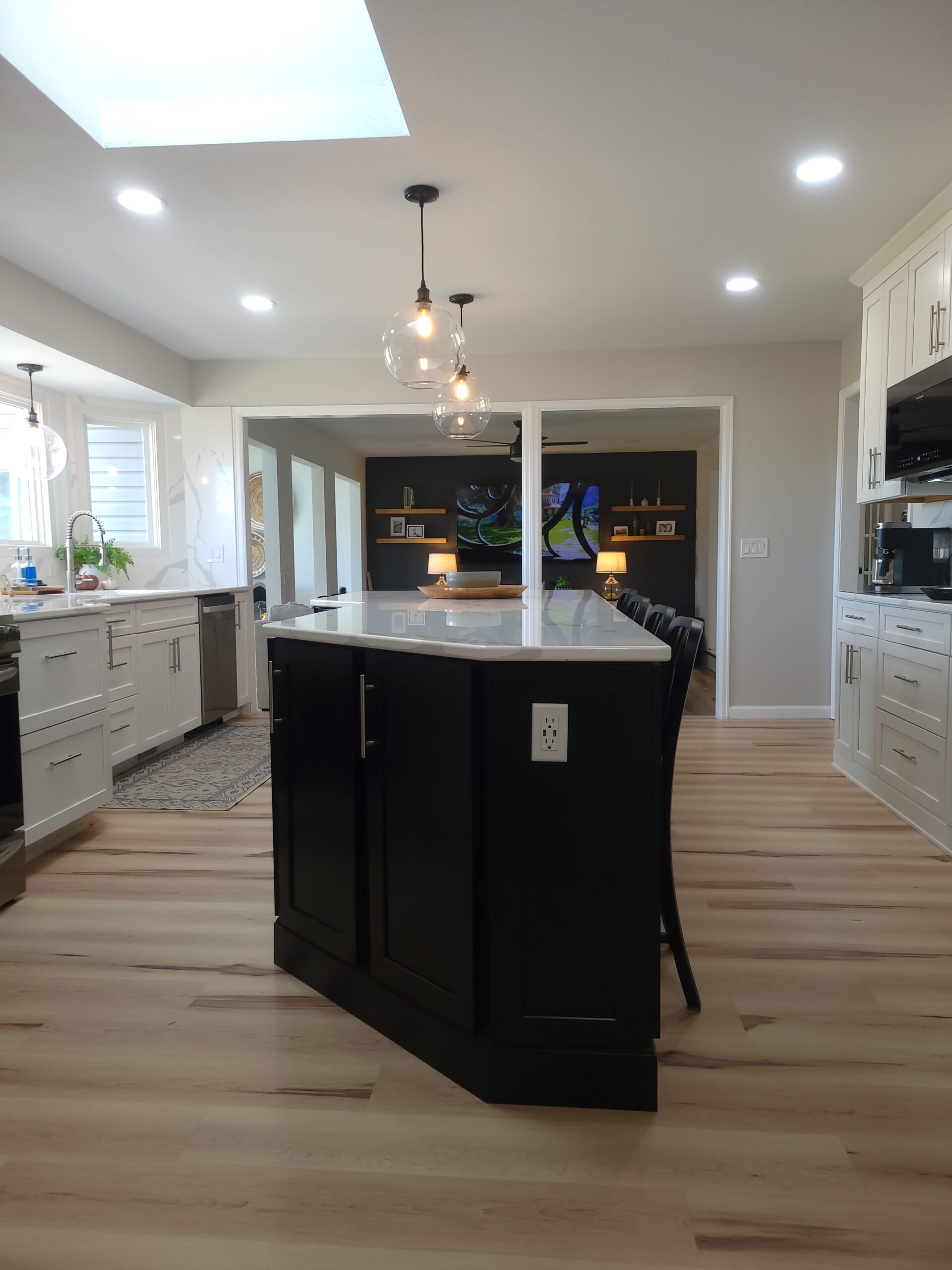 What a waste of space! We removed the cabinets and deleted the wall that created the hallway area. Our client opted to extend the cabinets down toward the bump out to create a longer space. The new island became the perfect focal point of the kitchen and provided the ideal gathering spot! We also installed quartz tops with a matching splash to provide a clean finish. Another feature that we installed was a pot filler to provide effortlessly cooking. The final results were amazing: