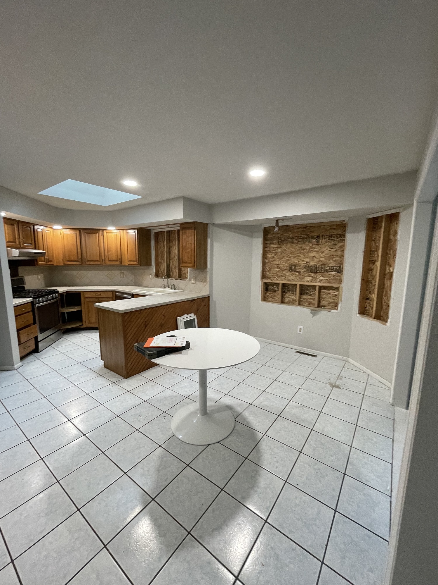 Welcome to another A+ Home Improvement’s project!! Our next project centered around a fabulous kitchen renovation. The crew on this project definitely knocked it out of the park! Below are some pictures of the existing space. As you can tell, the kitchen was functional but cramped. The walls created a hallway that was unnecessary, and the peninsula made it feel claustrophobic. Our clients desired to open the space up and create a fun space for the family to gather. After playing with the design, they settled on the perfect layout and we went to work. Let’s take a look at the existing space: