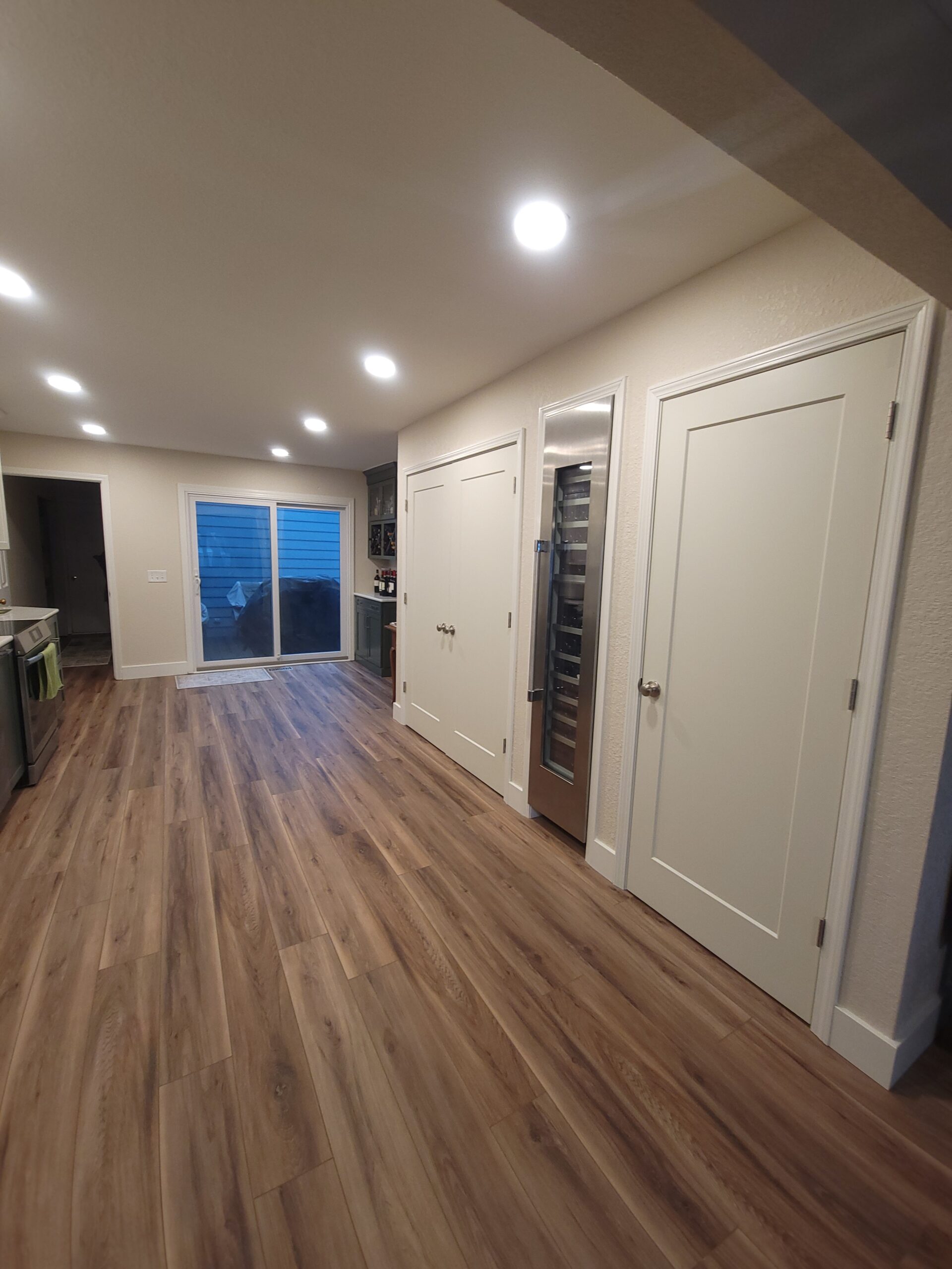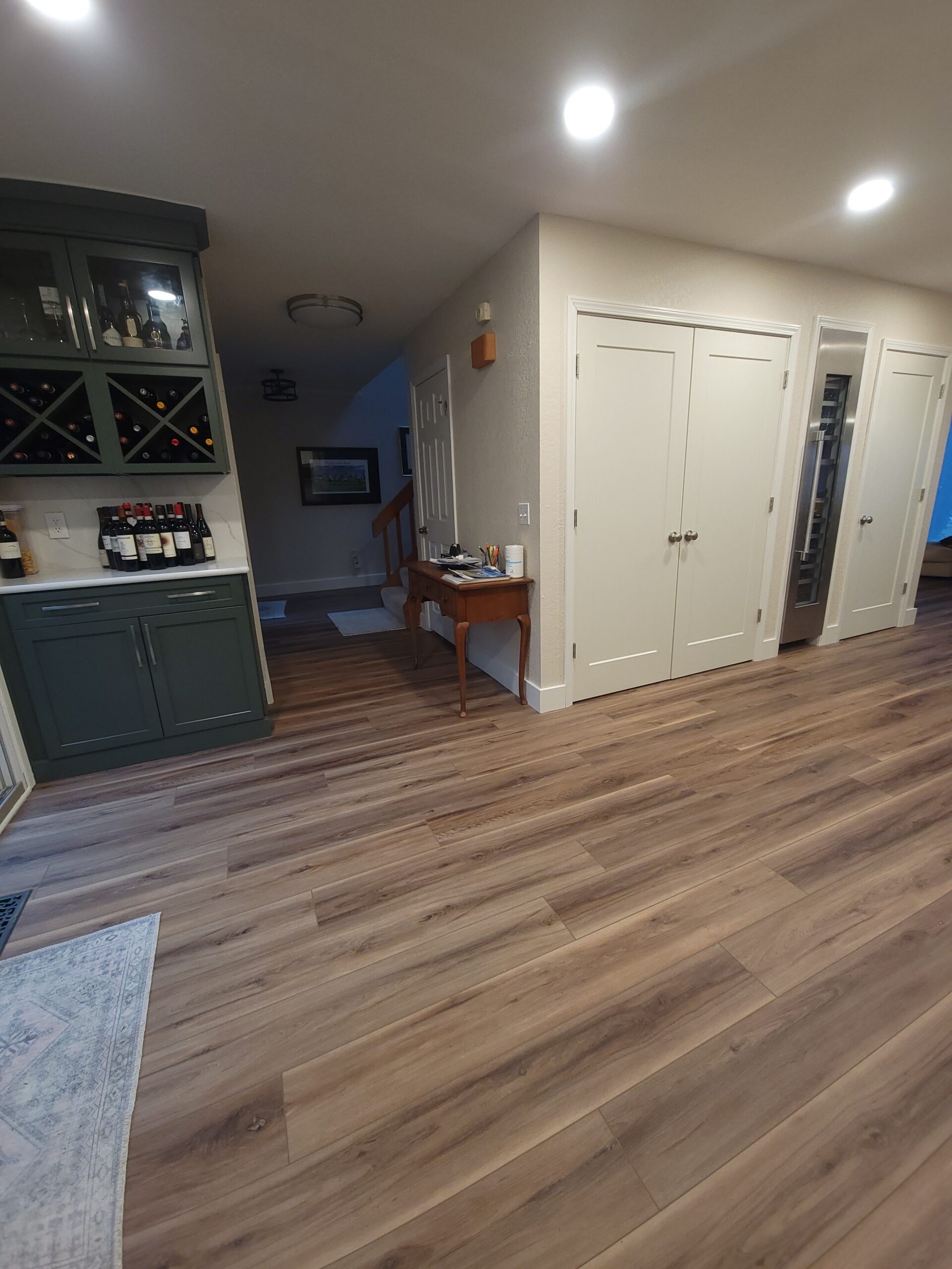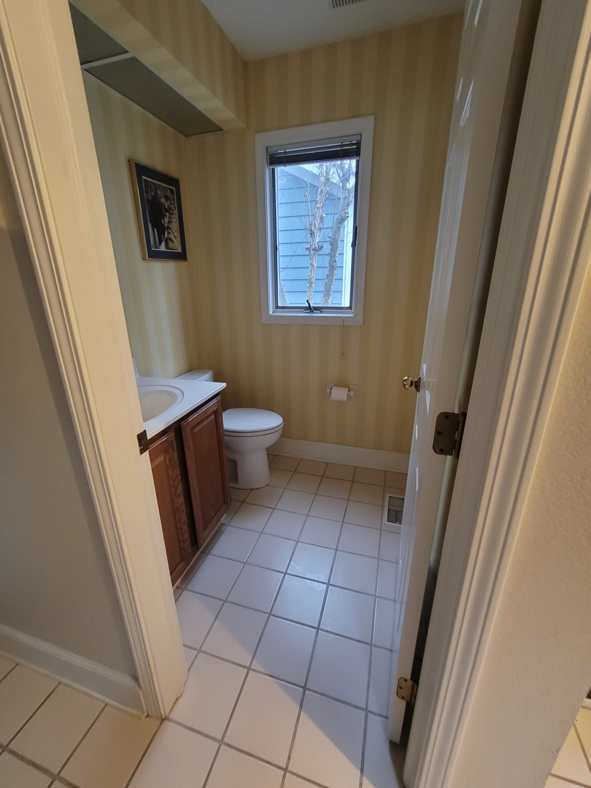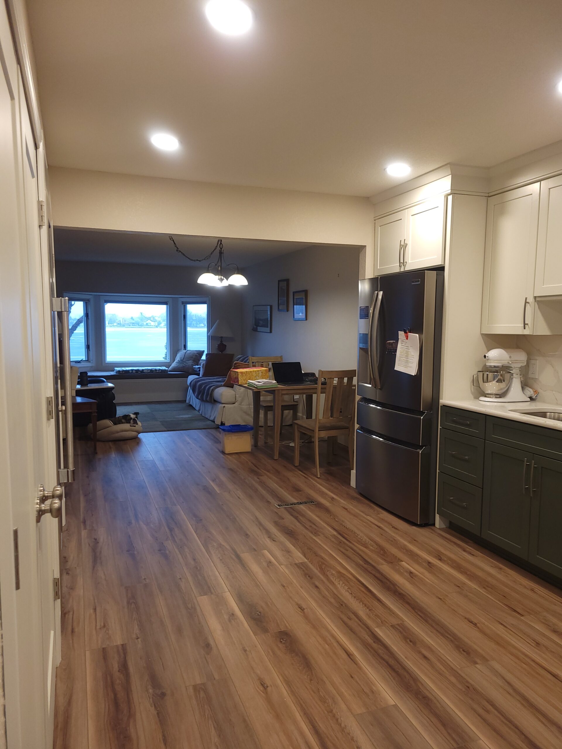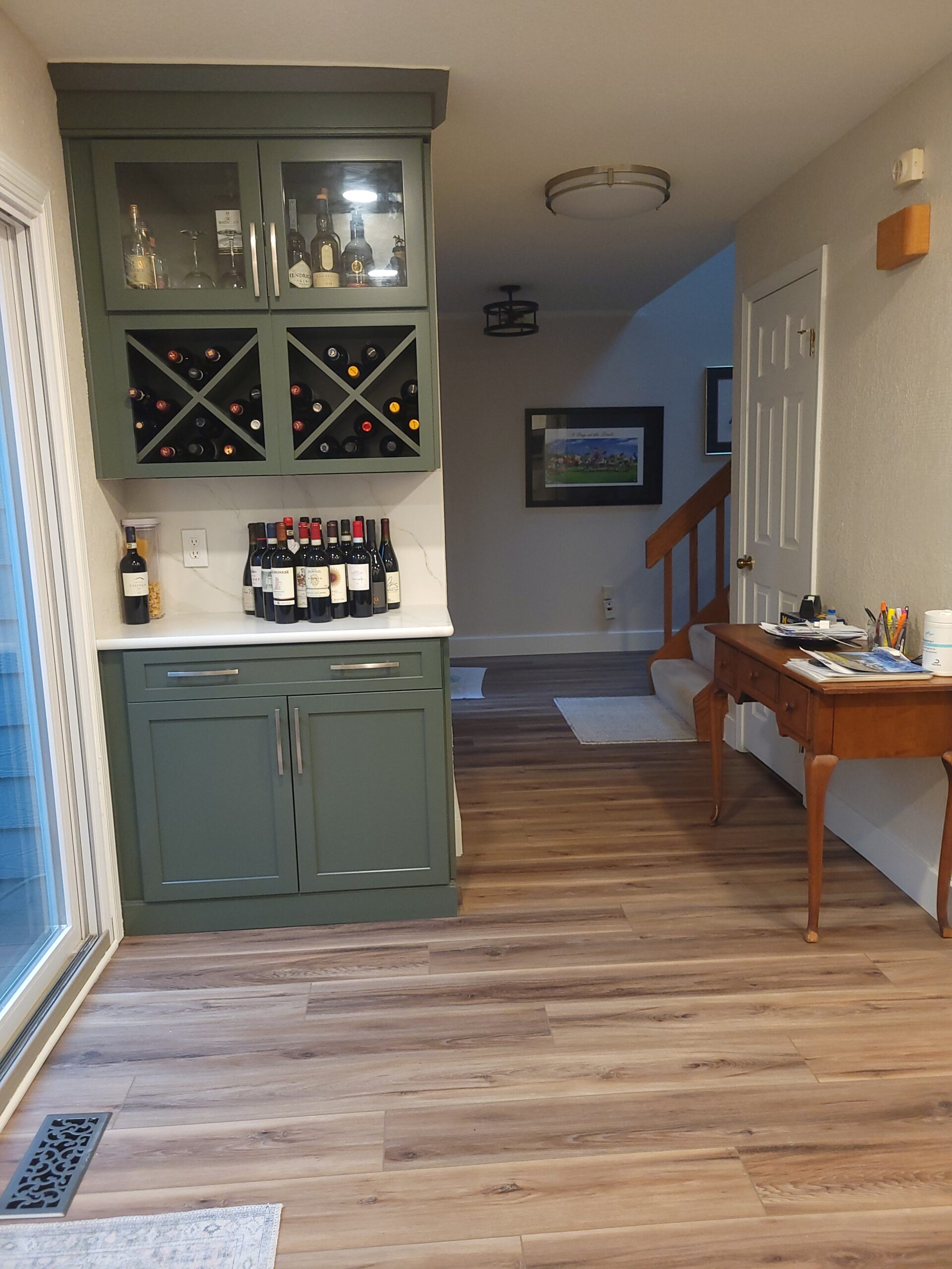 Look how dark and dated the space looks! The home offered a beautiful view of the lake behind it, but the peninsula and wall between the kitchen and living room obscured the view. We removed the wall and installed a new header to open up the space. We also ripped out the soffits and converted the kitchen area into a galley style kitchen that better suited our client’s lifestyle. The homeowner enjoyed their wine collection, so we installed a built in wine cooler along with a wine rack to display their goods. To create a continuous flow, we installed matching laminate flooring throughout the entire first floor of the home. The new lighting provided a much brighter feel to the whole space. During the course of the renovation, we also provided a quick facelift for the half bath. Take a look at the results: