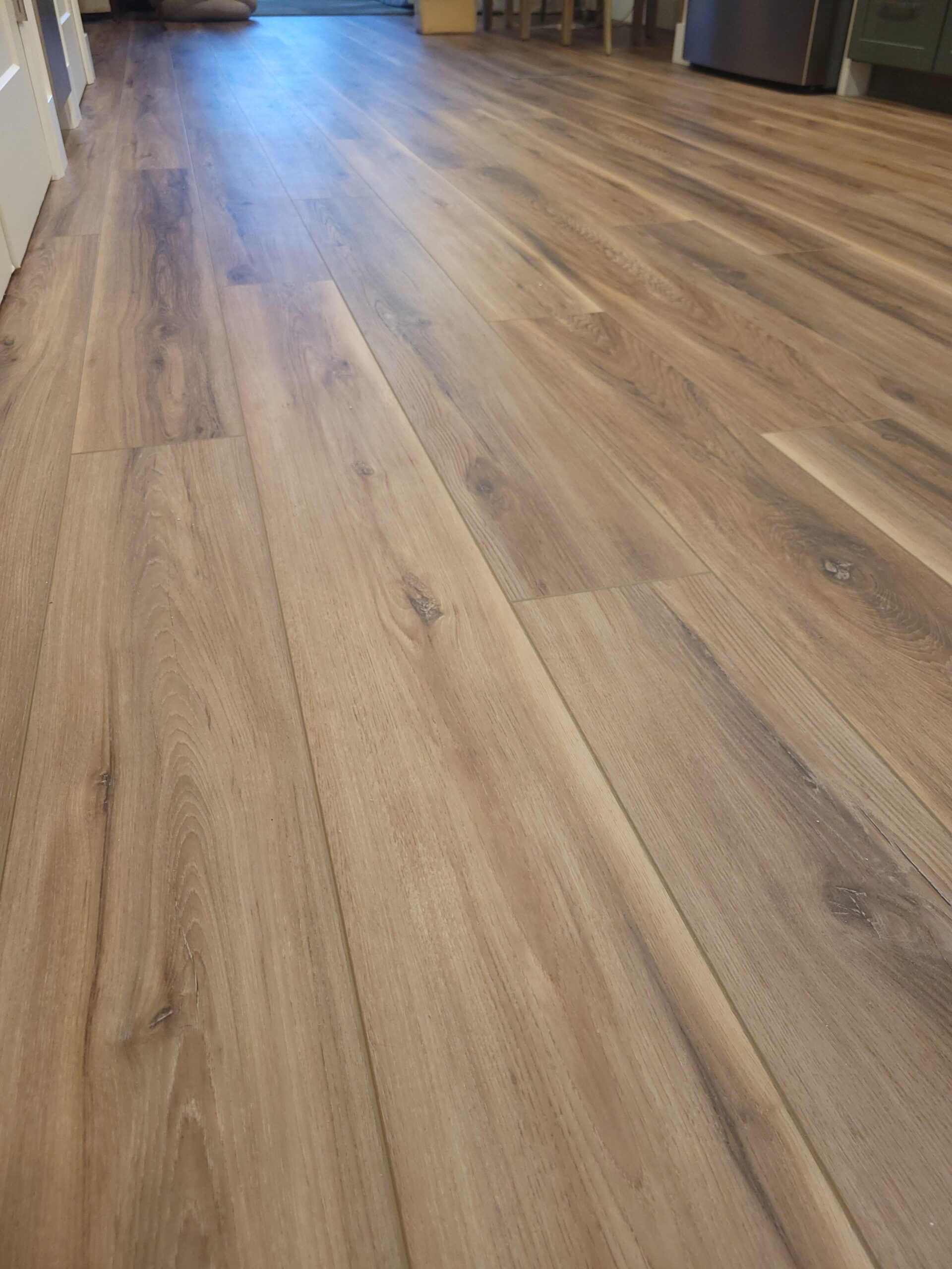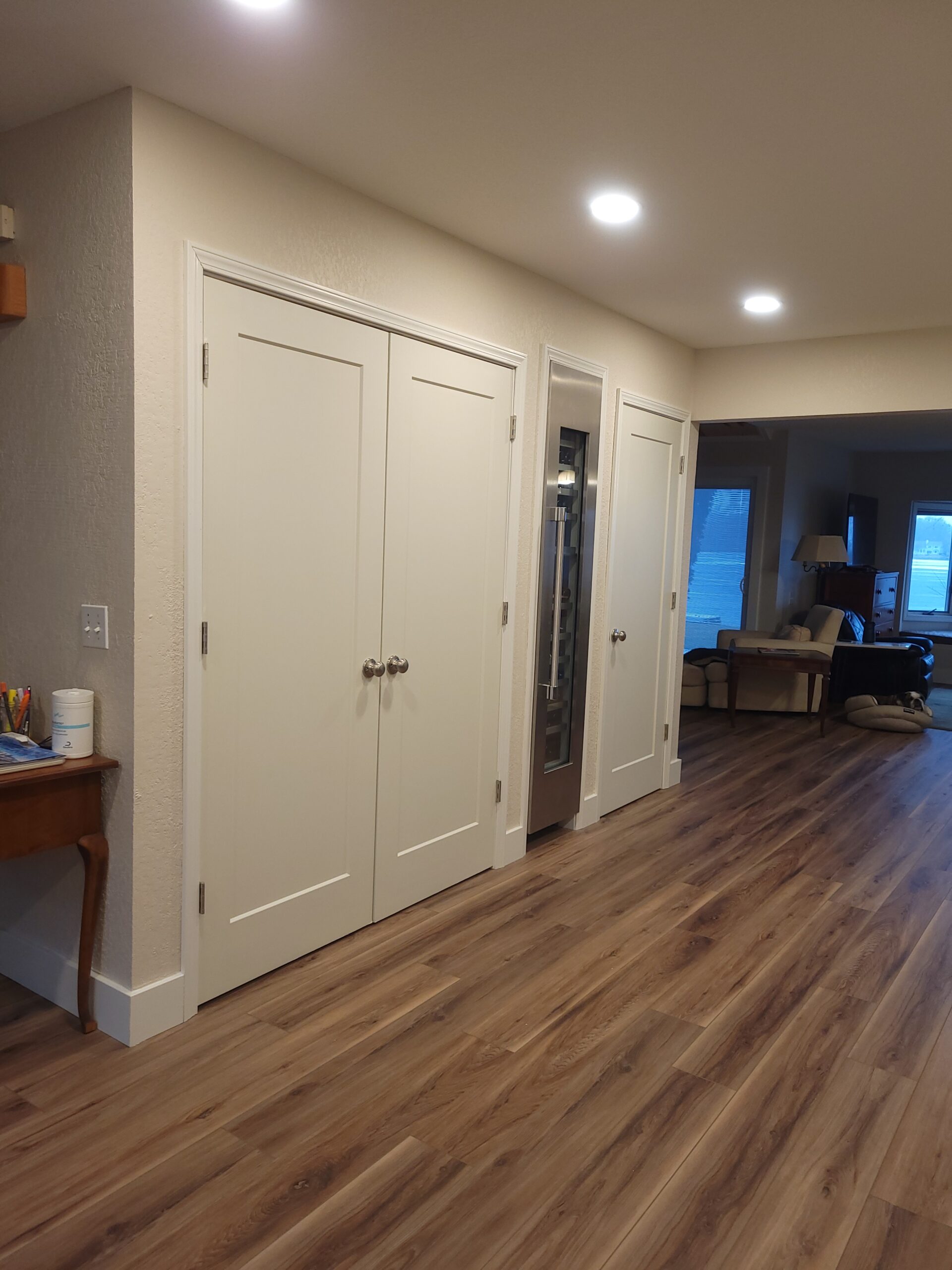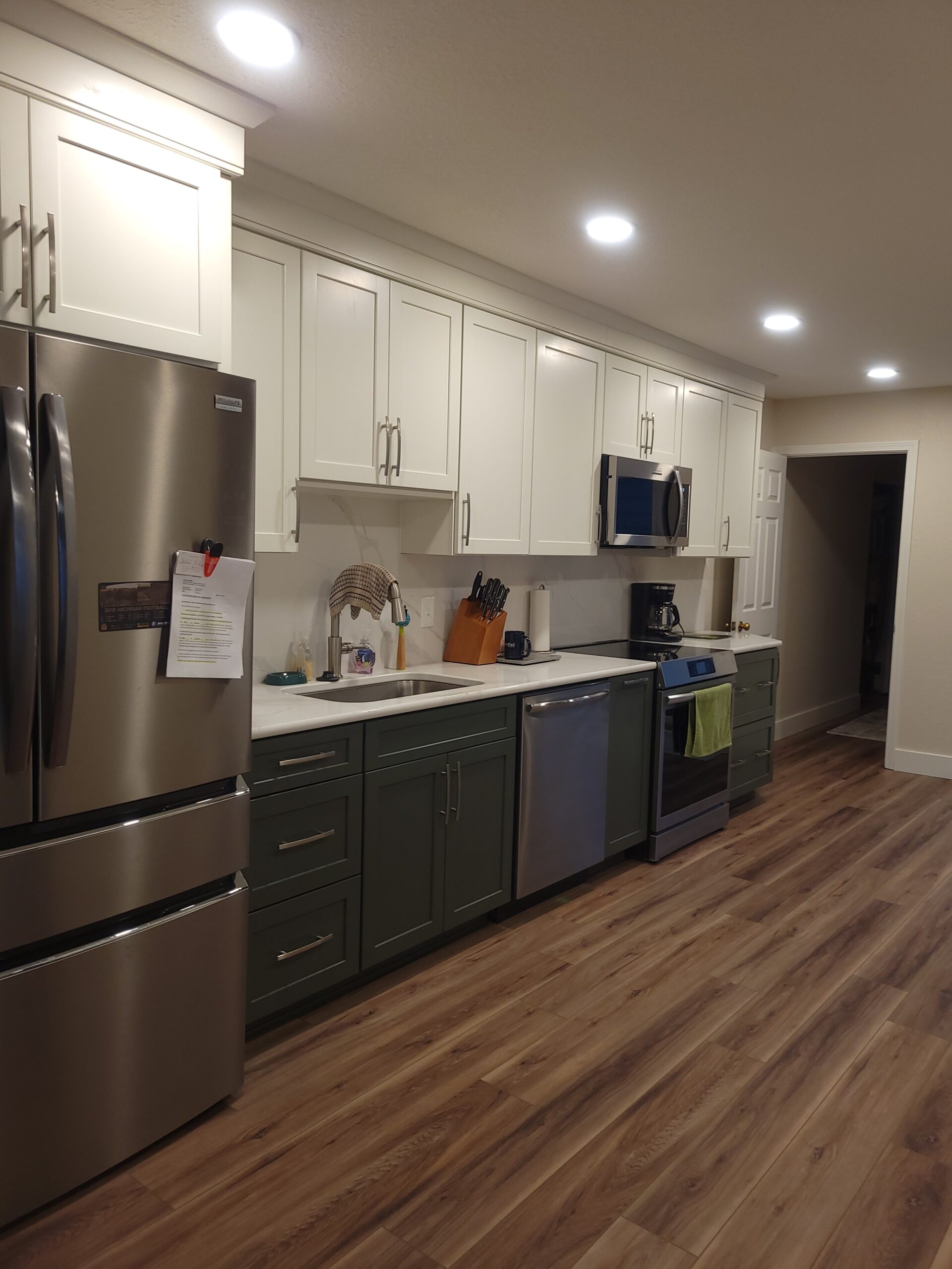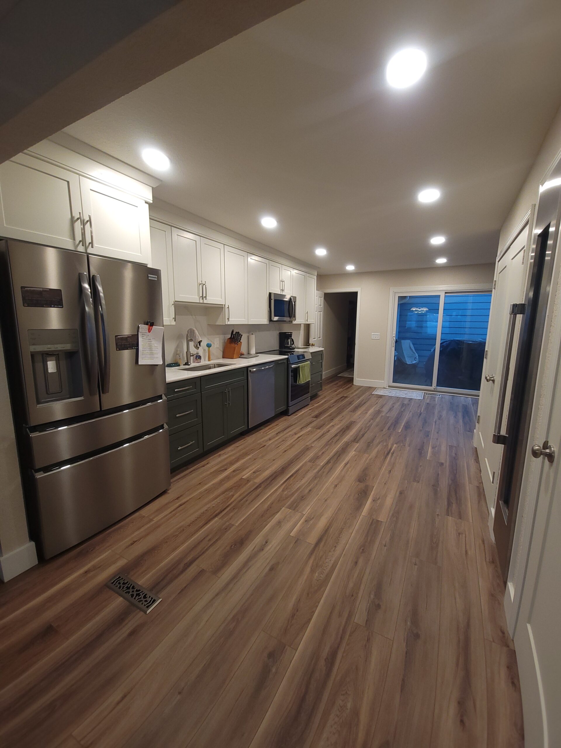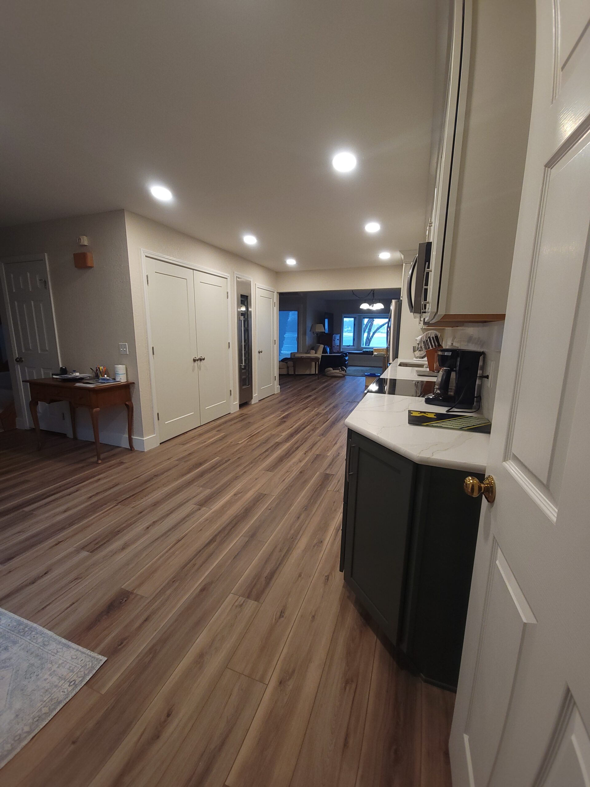 Look how dark and dated the space looks! The home offered a beautiful view of the lake behind it, but the peninsula and wall between the kitchen and living room obscured the view. We removed the wall and installed a new header to open up the space. We also ripped out the soffits and converted the kitchen area into a galley style kitchen that better suited our client’s lifestyle. The homeowner enjoyed their wine collection, so we installed a built in wine cooler along with a wine rack to display their goods. To create a continuous flow, we installed matching laminate flooring throughout the entire first floor of the home. The new lighting provided a much brighter feel to the whole space. During the course of the renovation, we also provided a quick facelift for the half bath. Take a look at the results: