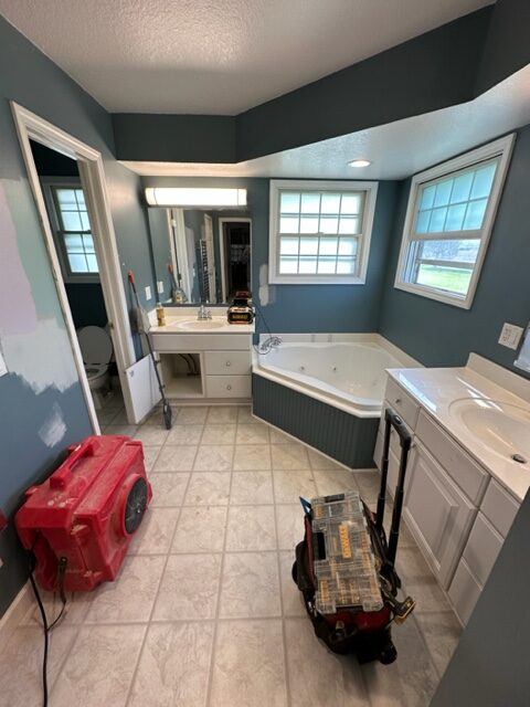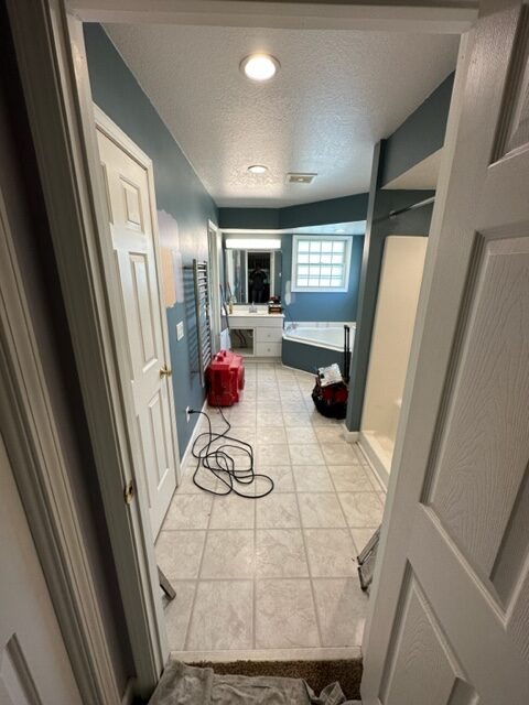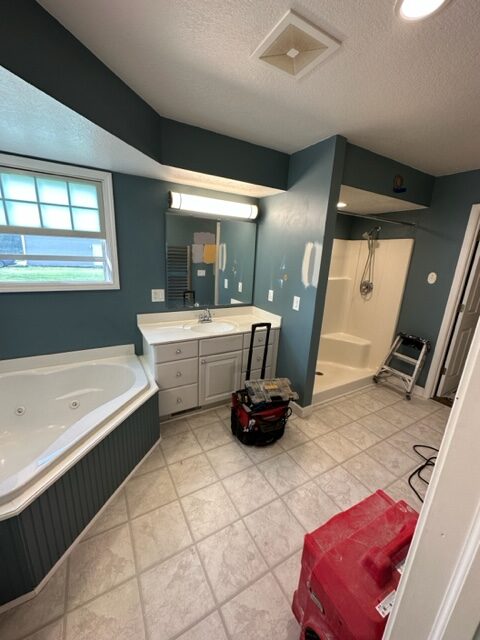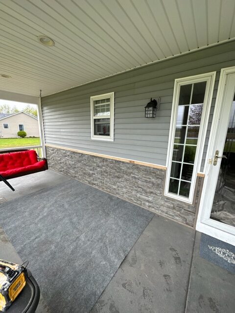 A+ Home Improvements is back at it again! While we enjoy a myriad of different project types, custom bathroom renovations remain high on our list. Our next client provided us with the challenge of a full master bathroom renovation. They already had a pretty good idea of the concept they were shooting for, but we just needed to help out with a couple of tweaks. The existing bathroom space provide adequate room to accomplish the desires of our client. To achieve our goals, we deleted one window and replaced the remaining one with a glass block window. This allowed natural light to still permeate the room, while also providing needed privacy. Upon deleting the window, we decided to install a faux stone veneer wainscot at the front porch to add some curb appeal. Let’s see what we started with: