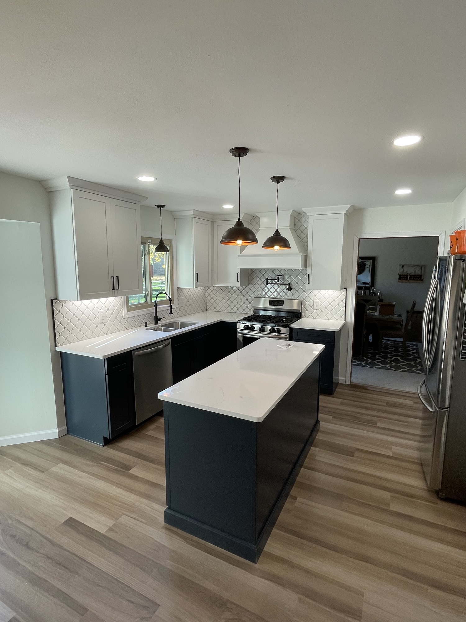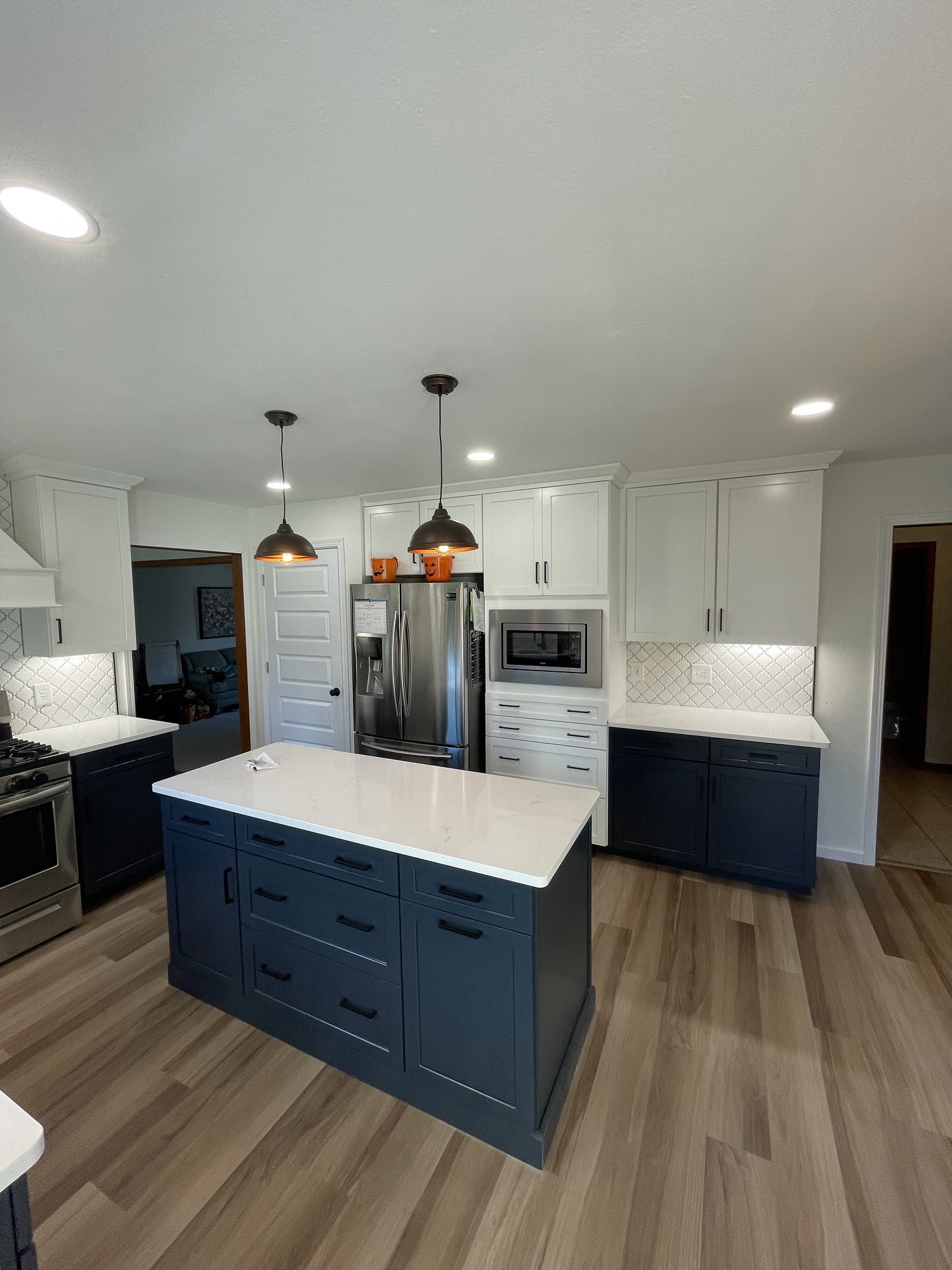 While stunning, these pictures do not do justice for this kitchen renovation outcome. Our client decided to install white upper cabinets with contrasting navy blue lowers. We updated the lighting to bright LED’s, and dropped a couple of accent pendant lights over the island. To sweeten the deal, we installed a pot filler over the stove to help make cooking a breeze! We also outfitted the kitchen with matte black fixtures and pulls that added the perfect amount of “pop”. Just look at the pictures – this kitchen looks clean and pristine! Definitely a fun project that brought satisfaction to all parties involved.