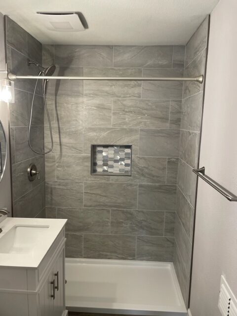 While functional, the bathroom left much to be desired. The original tile installation was a DIY job and needed to be corrected. Our client wanted to switch over from earth tones to a gray bathroom, and the products selected worked perfectly! In place of the window, we installed a shampoo niche to provide some much needed storage. We also minimized the size of the mirror and light bar to create a more open feel for the bathroom. The project turned out beautifully:
