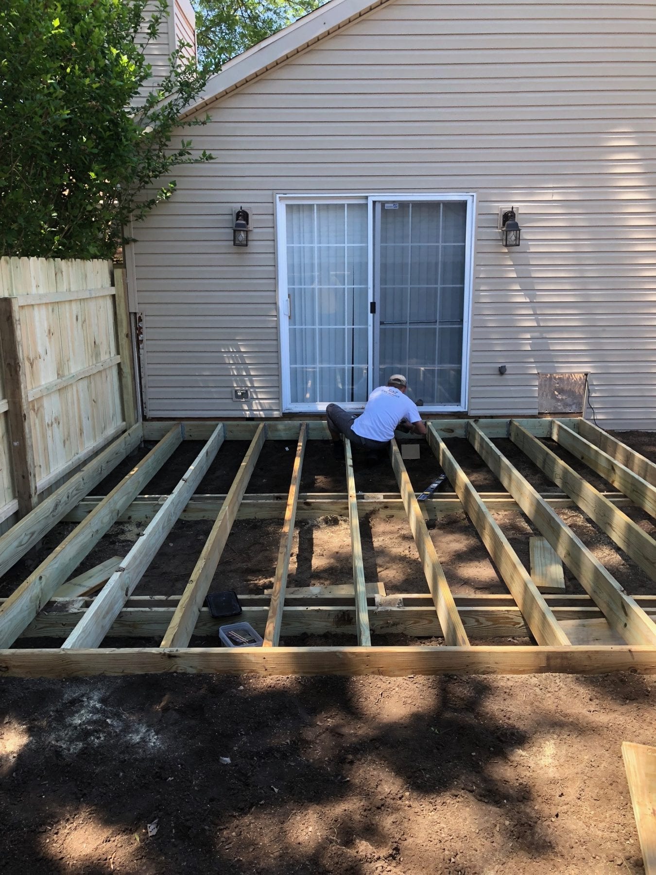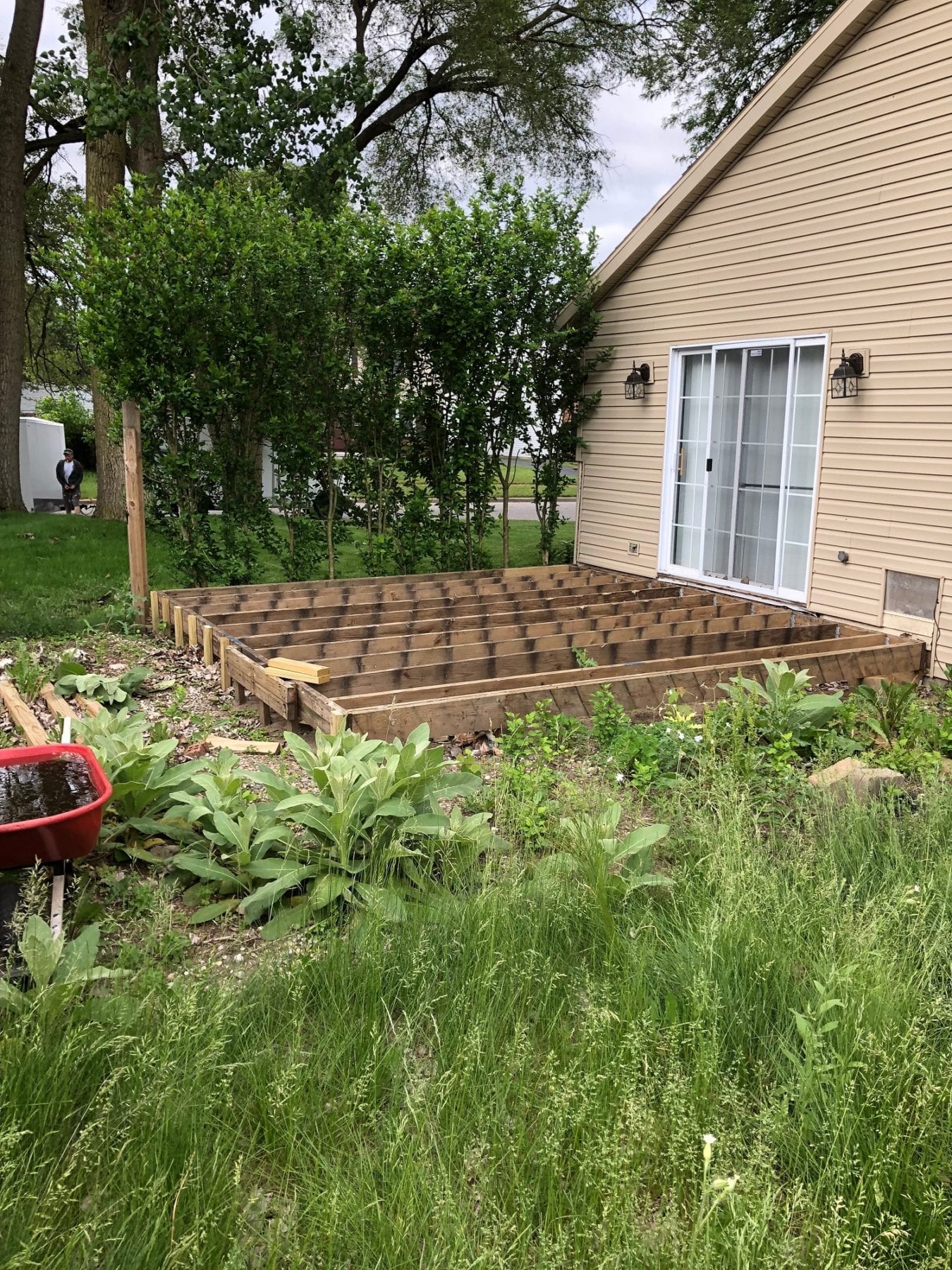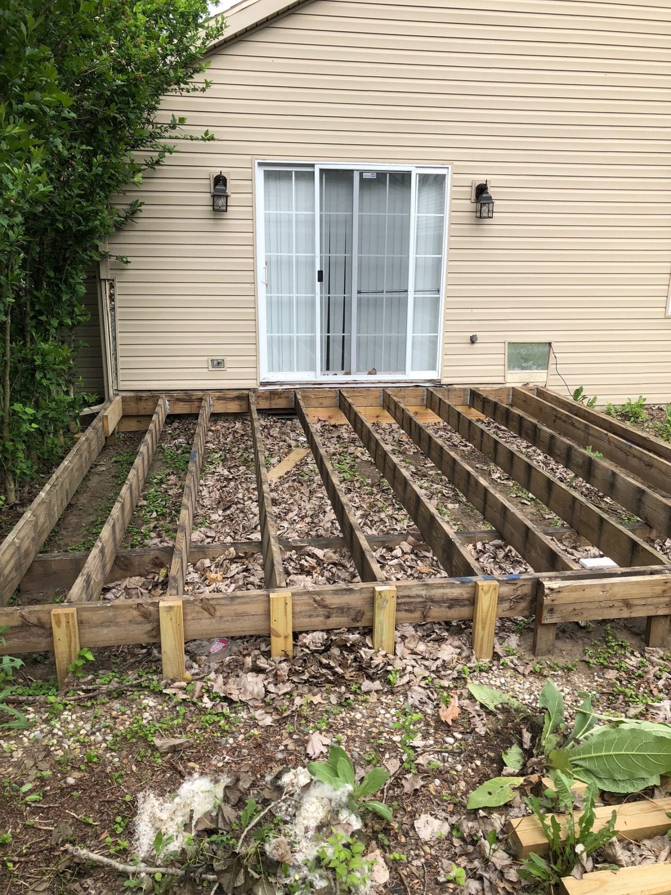 When it comes to modifying the exterior of your home, you are often bound by the existing set up. In this case, our client wanted us to install a deck at their rear entry. As you can see from the pictures, setting the beams and the framing was going to require us to do some digging. We opted to install beams fabricated with ground contact rated lumber to create this ground level deck. Depending on your local building code, you can also opt for installing rim beams which typically require less digging, but often require wide joists to cover the span. Removing the inadequate original structure was the first course of action, so we got our shovels out and went to work!