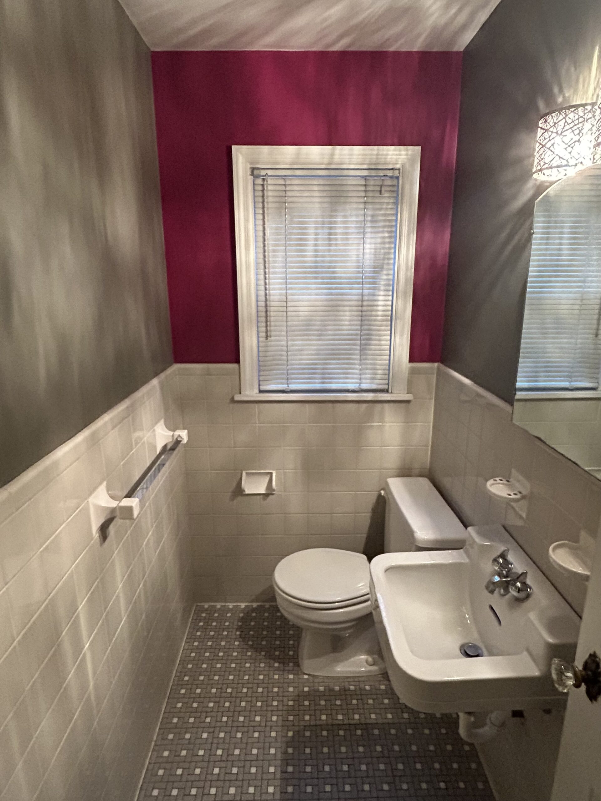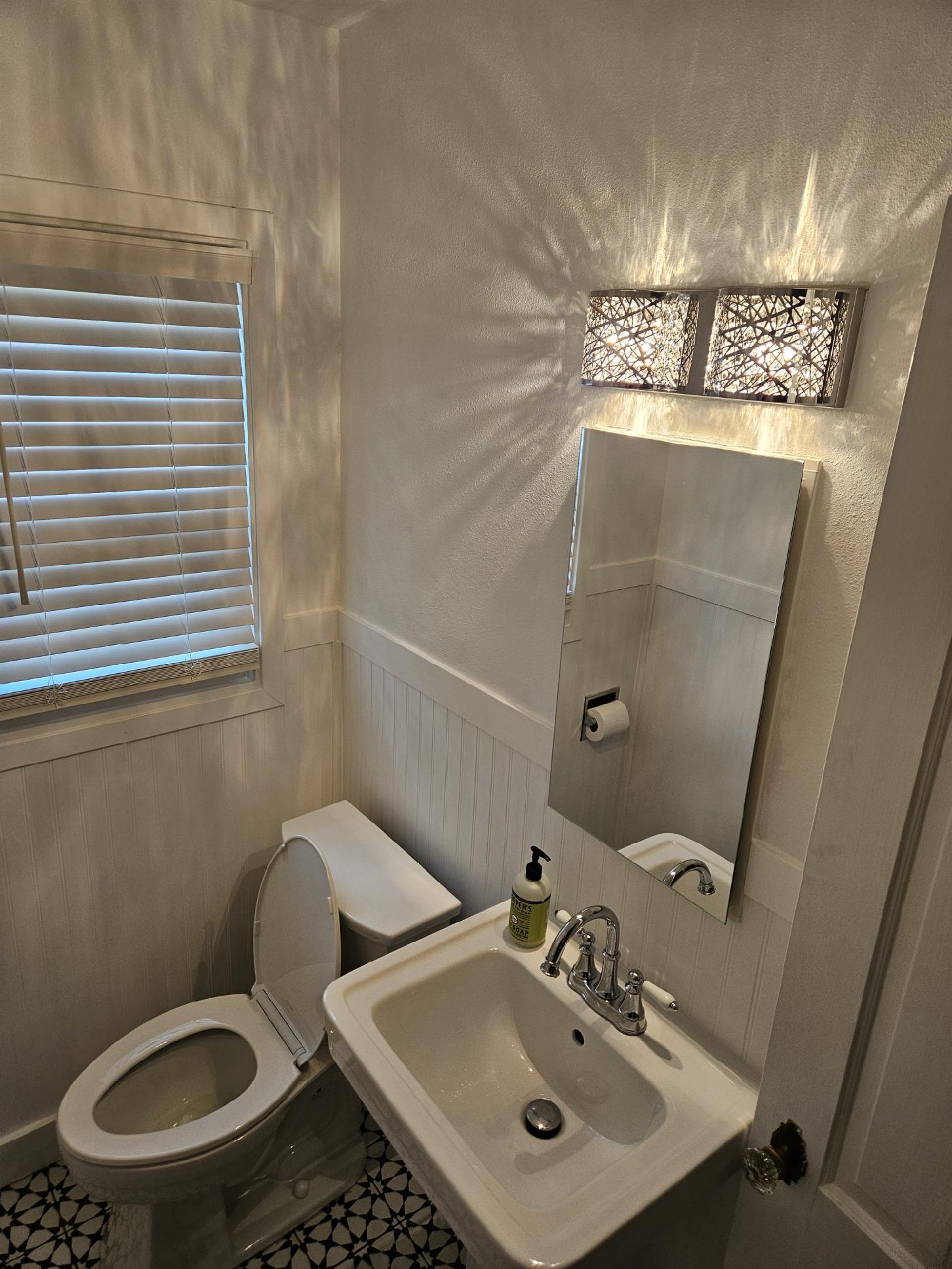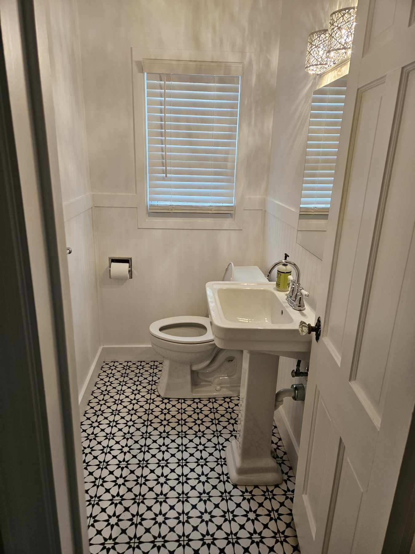 Look familiar? Many homes in our area sport a dated bathroom similar to this. To start, we installed a beadboard style wainscoting paired with craftsman style mouldings. For the floor, our client opted for a vibrant patterned tile that added some serious pop! Once we installed the pedestal sink and other fixtures, the bathroom took on a whole new look of its own.