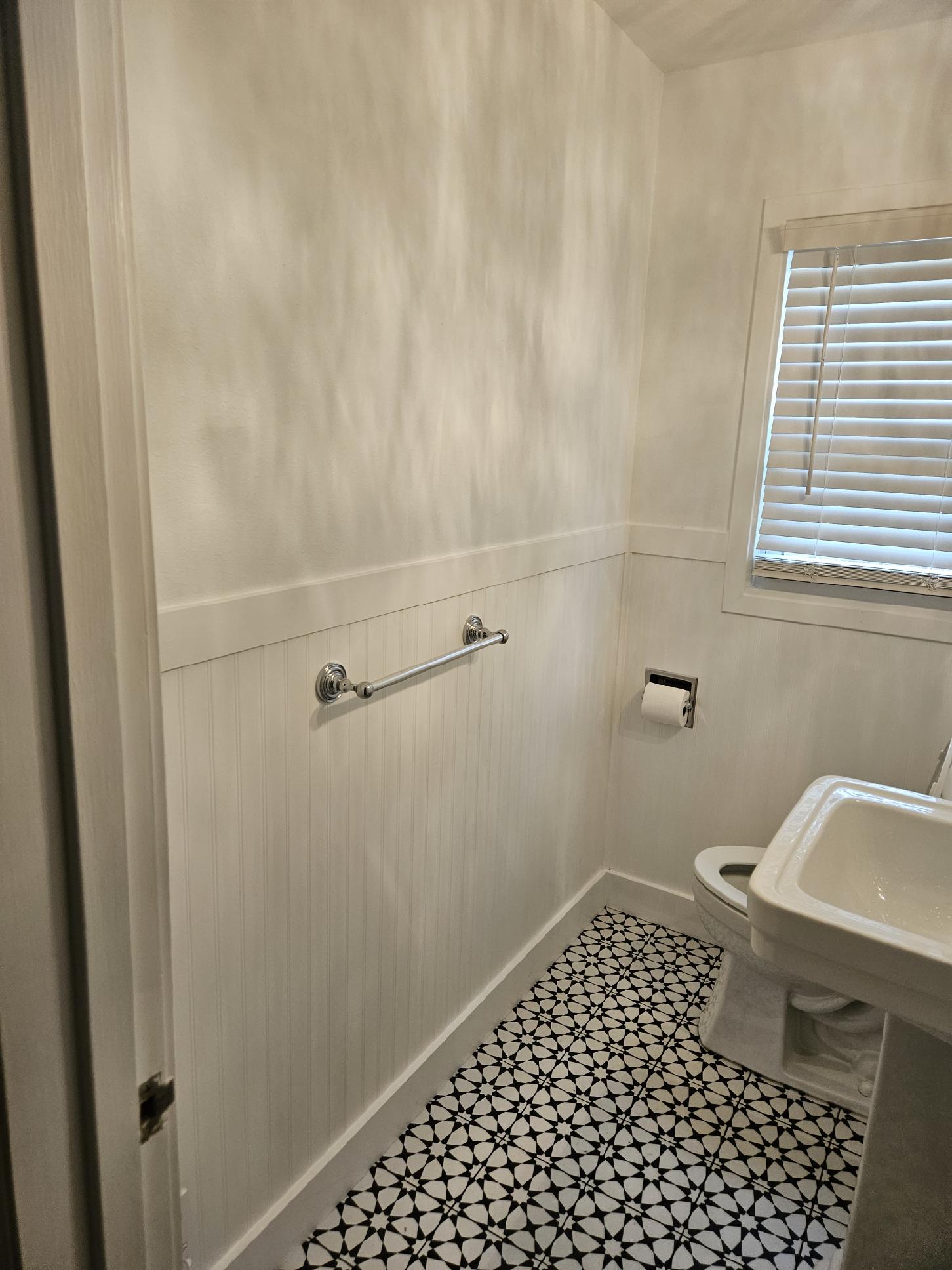 A+ Home Improvements is back at it again! Our next home owner’s project actually consisted of two separate bathroom spaces. In our next post, we will go over the tub replacement in the guest bathroom. First up, however, was a half bath renovation. As you will see in the pictures below, our client’s existing half bathroom was dated and definitely needed to be freshened up. We removed the old, thick tile wainscot and flooring, along with all of the fixtures in the bathroom. Our client still desired to install a wainscoting, but with a modern look. We demoed the existing space and prepped for the project to commence. Let’s look at the existing space: