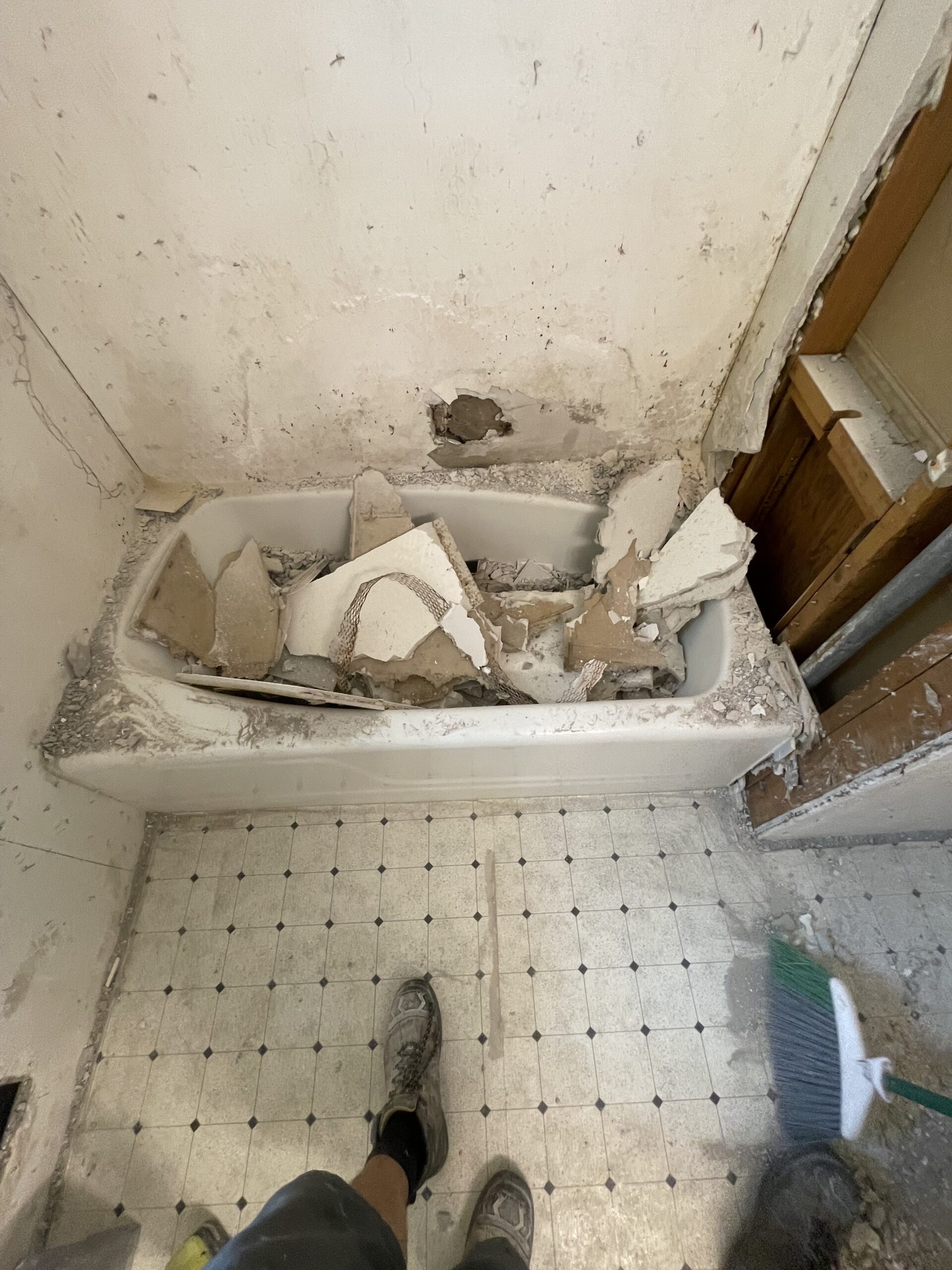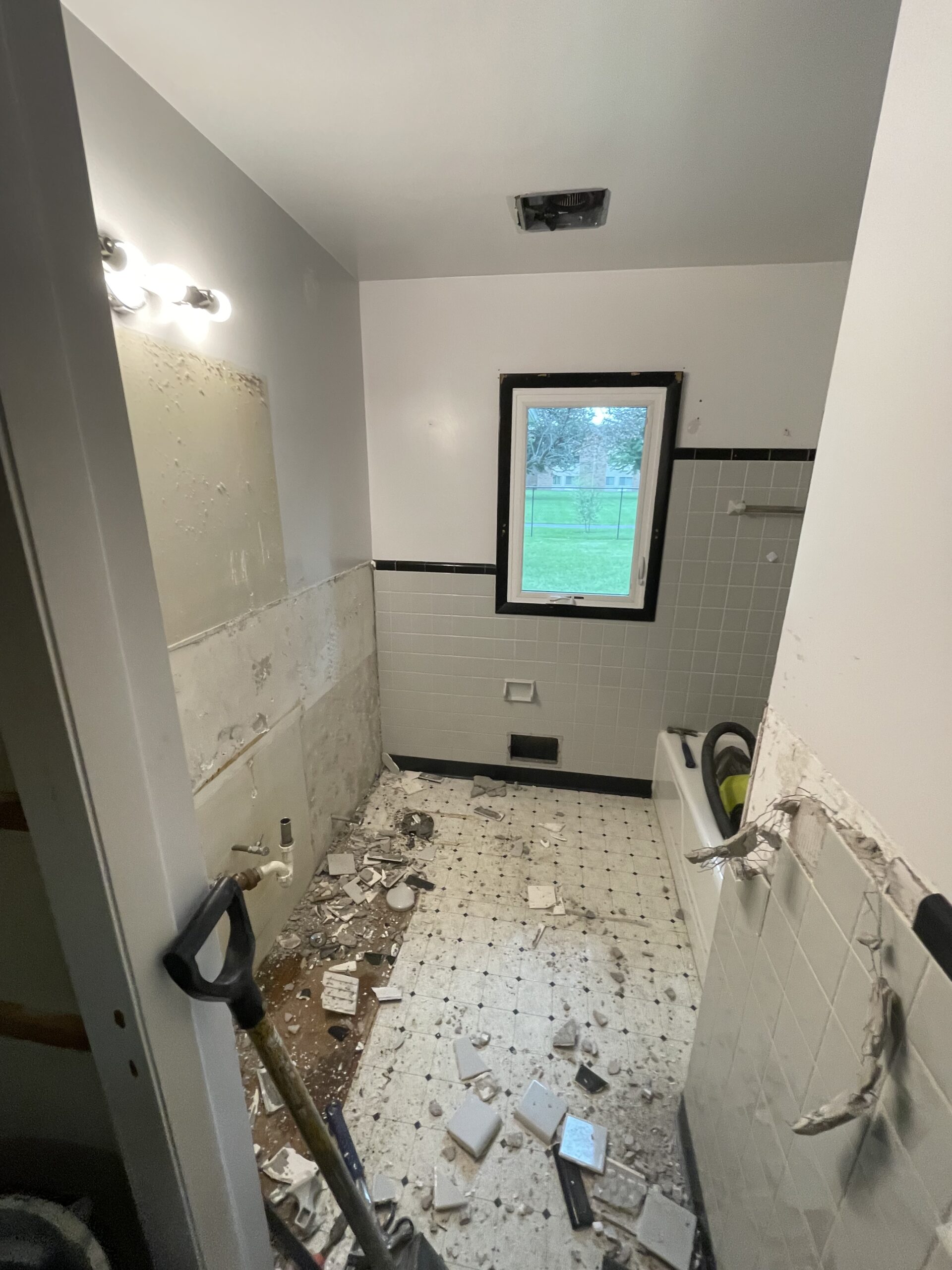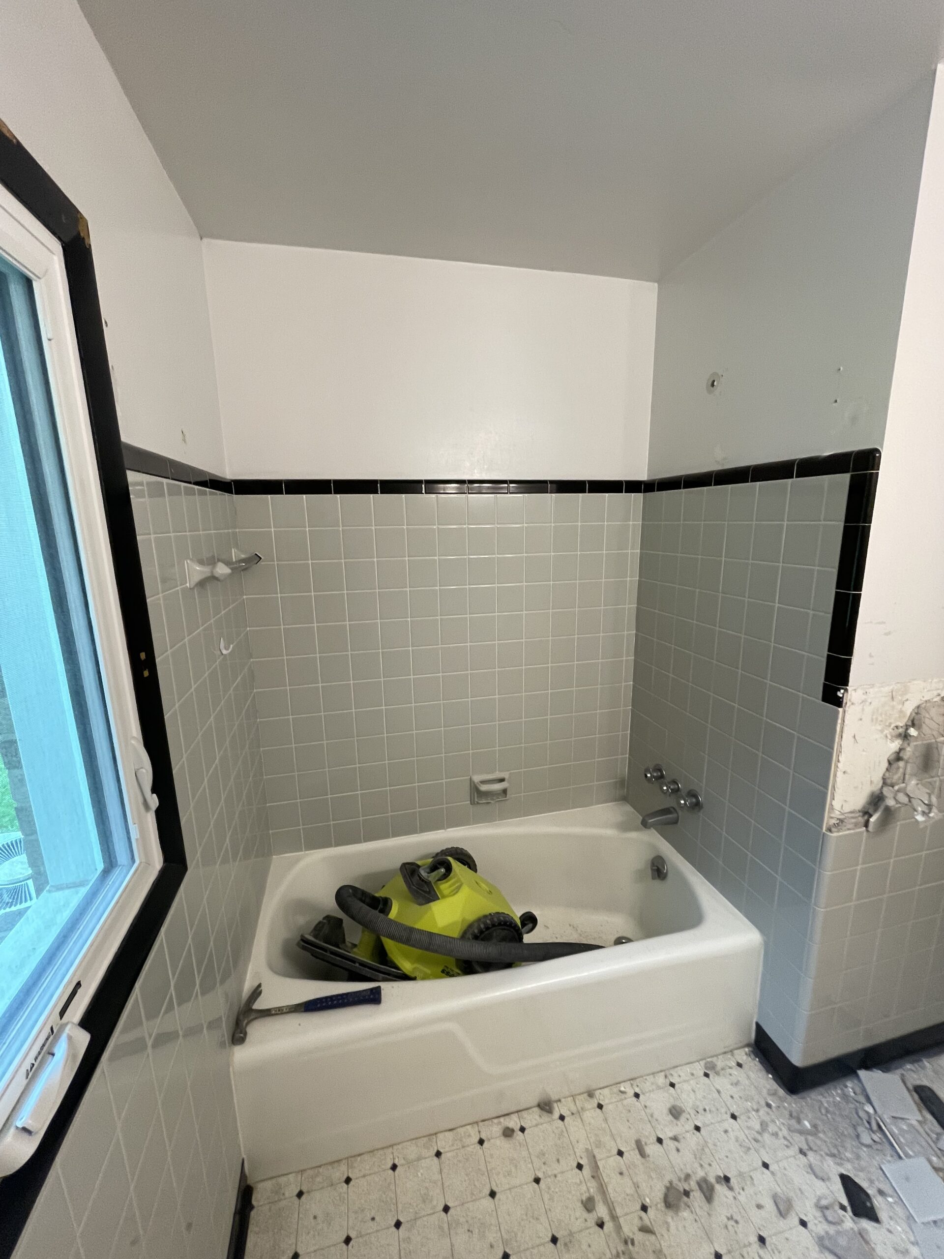 Hey everybody, A+ Home Improvements is back at it again! For our next project, we tackled an extremely outdated tub enclosure and turned it into a hexagon tiled shower. Set in the 50’s-60’s, our clients bathroom desperately needed to be updated. They desired to remove the stained cast tub and dated tile in exchange for a sleek new tiled shower enclosure. After meeting our client for a consultation, we started helping with the product selection process. Once we completed selections and the material arrived, we began ripping out the old fixtures.