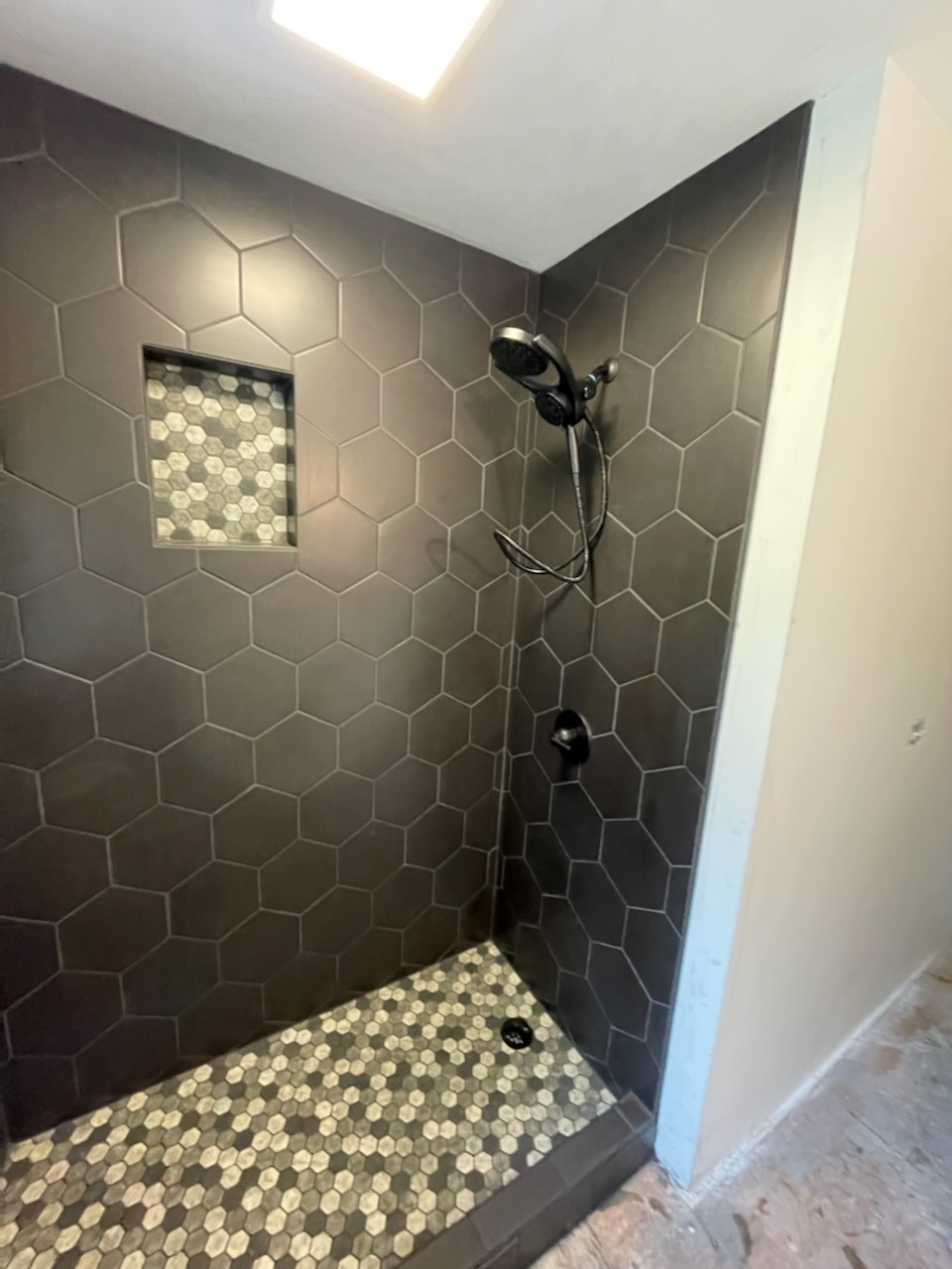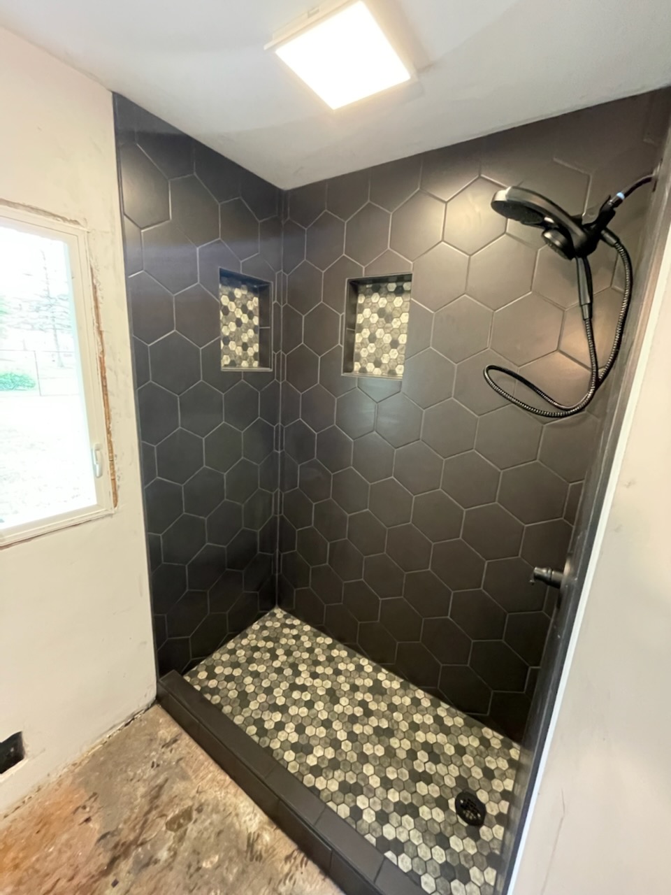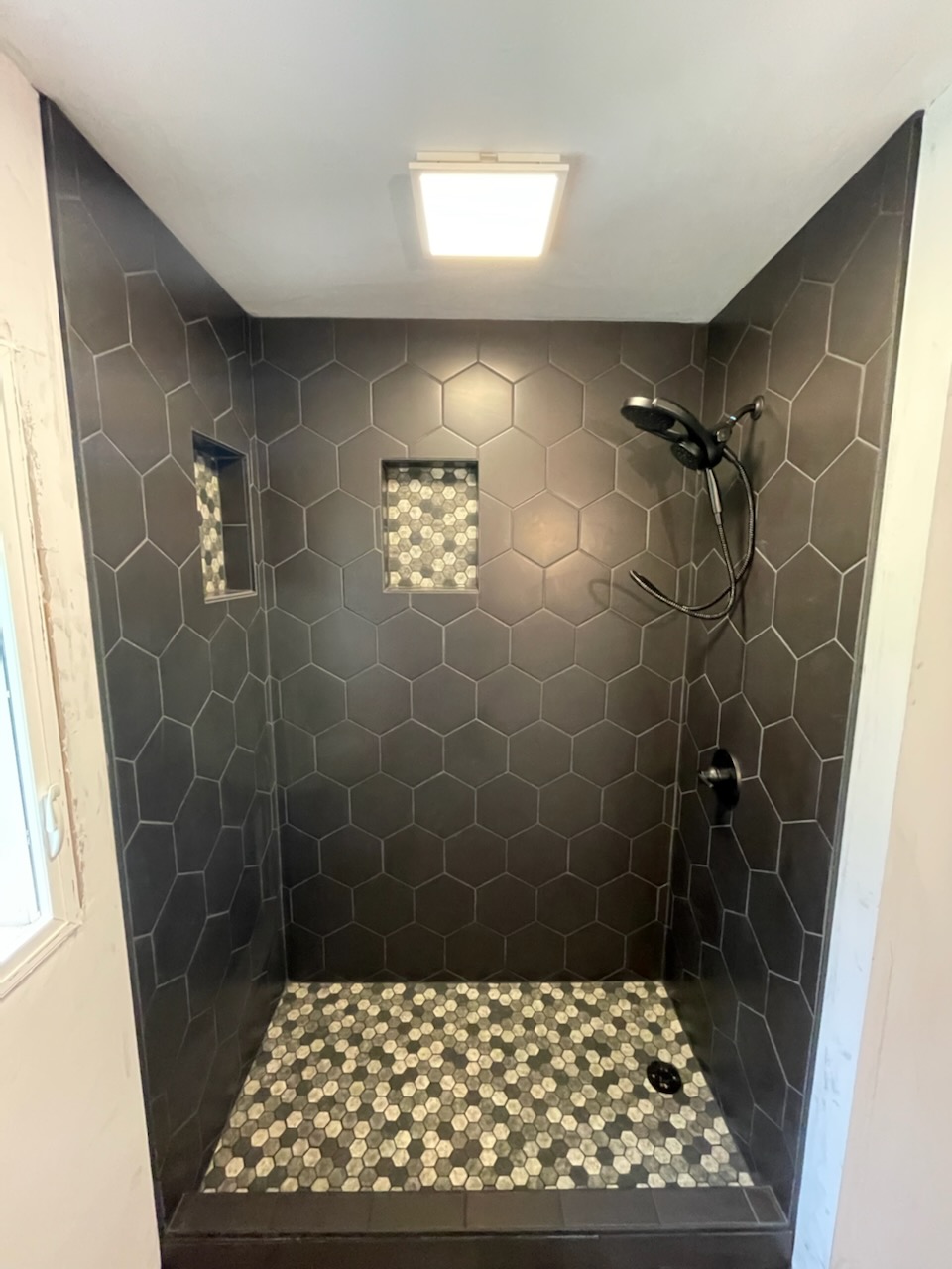 While “functional”, the old tub enclosure definitely left a lot to be desired. We removed the cast tub, tile wainscot and thick tiled floor. The house seemed to breathe a sigh of relief once we removed all of the weight. After modifying the plumbing to accept the new unit, the fun part of the renovation began! Our client opted to incorporate a hexagon tiled shower theme, and it pulled together perfectly. It is recommended to use a smaller tile for the shower pan to ensure proper slope is maintained for drainage purposes. Next, we installed a larger hexagon tile at the surround that provided an eye-popping shower! To pull the look together, we installed the shower pan tile as an accent in the rear of the niches. Our client loved the new look, and we enjoyed being a part of the project.