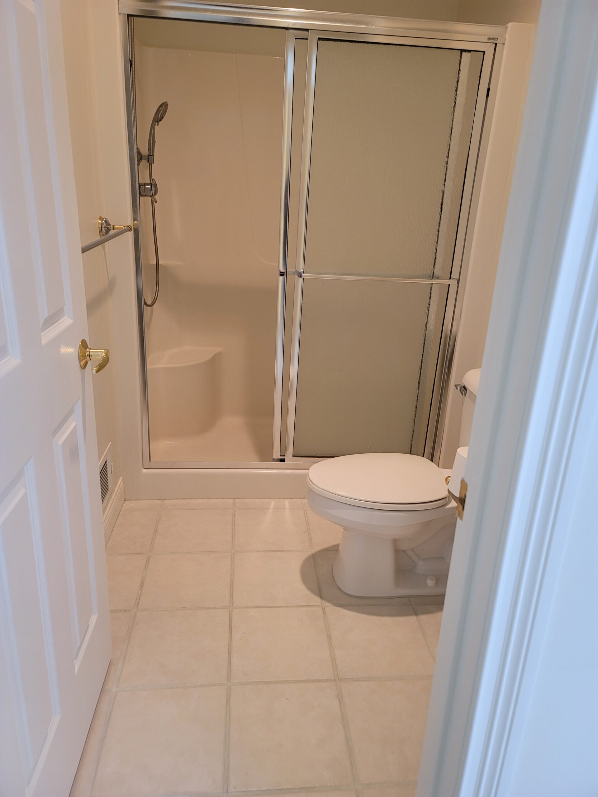 This week we have the privilege of sharing one of our latest bathroom projects! When we met with this client, they had an idea of what they wanted but didn’t know how to situate the space to meet their exact needs. The existing master bathroom consisted of a dated roman tub feature and a small shower area. Installing a huge custom tiled shower definitely topped their list of priorities! They no longer desired a tub, so we utilized this space to move the toilet out of the shower room. This allowed us to install the shower of their dreams while also providing a privacy wall area for their toilet. Take a look at the existing shower space: